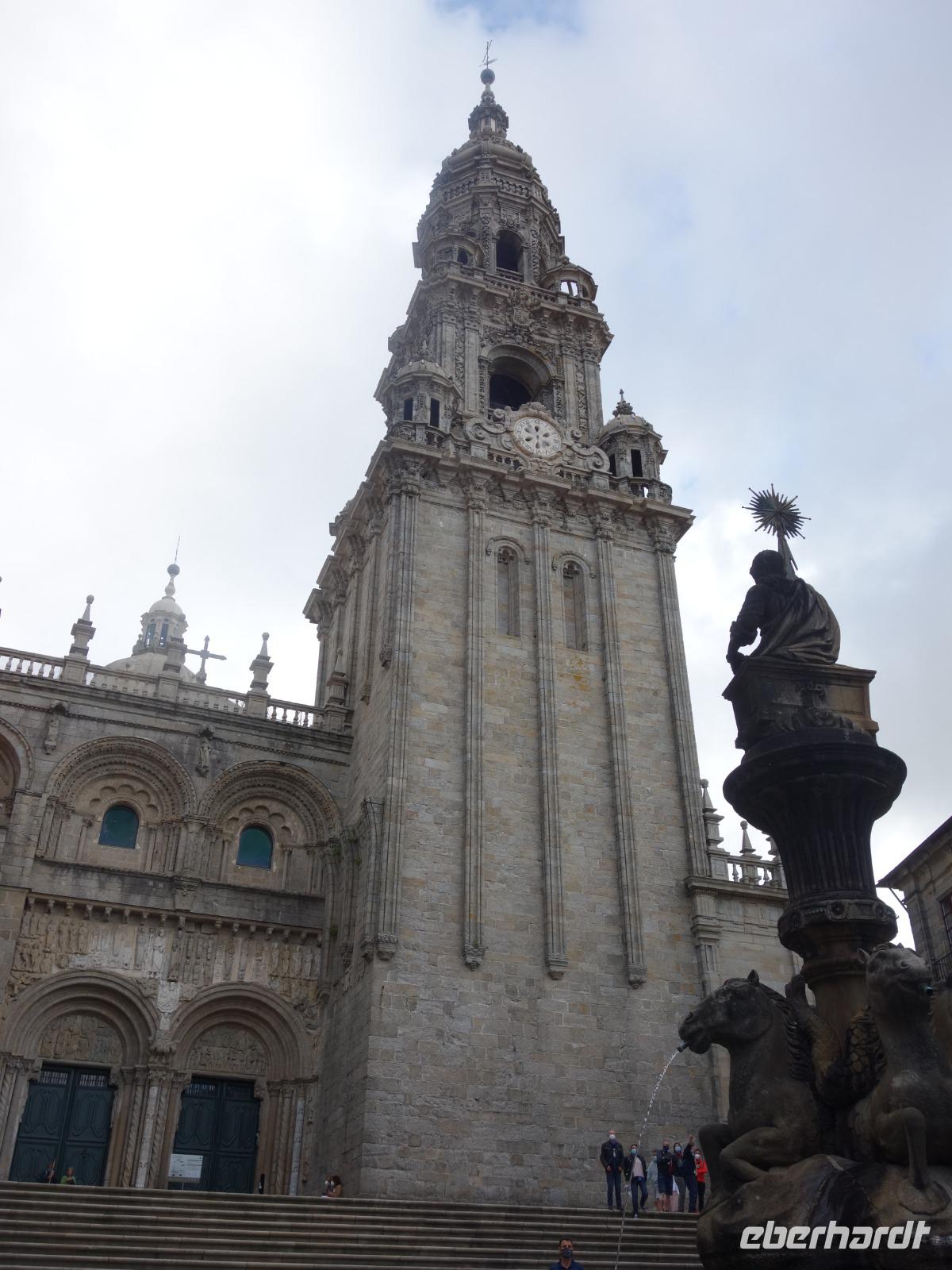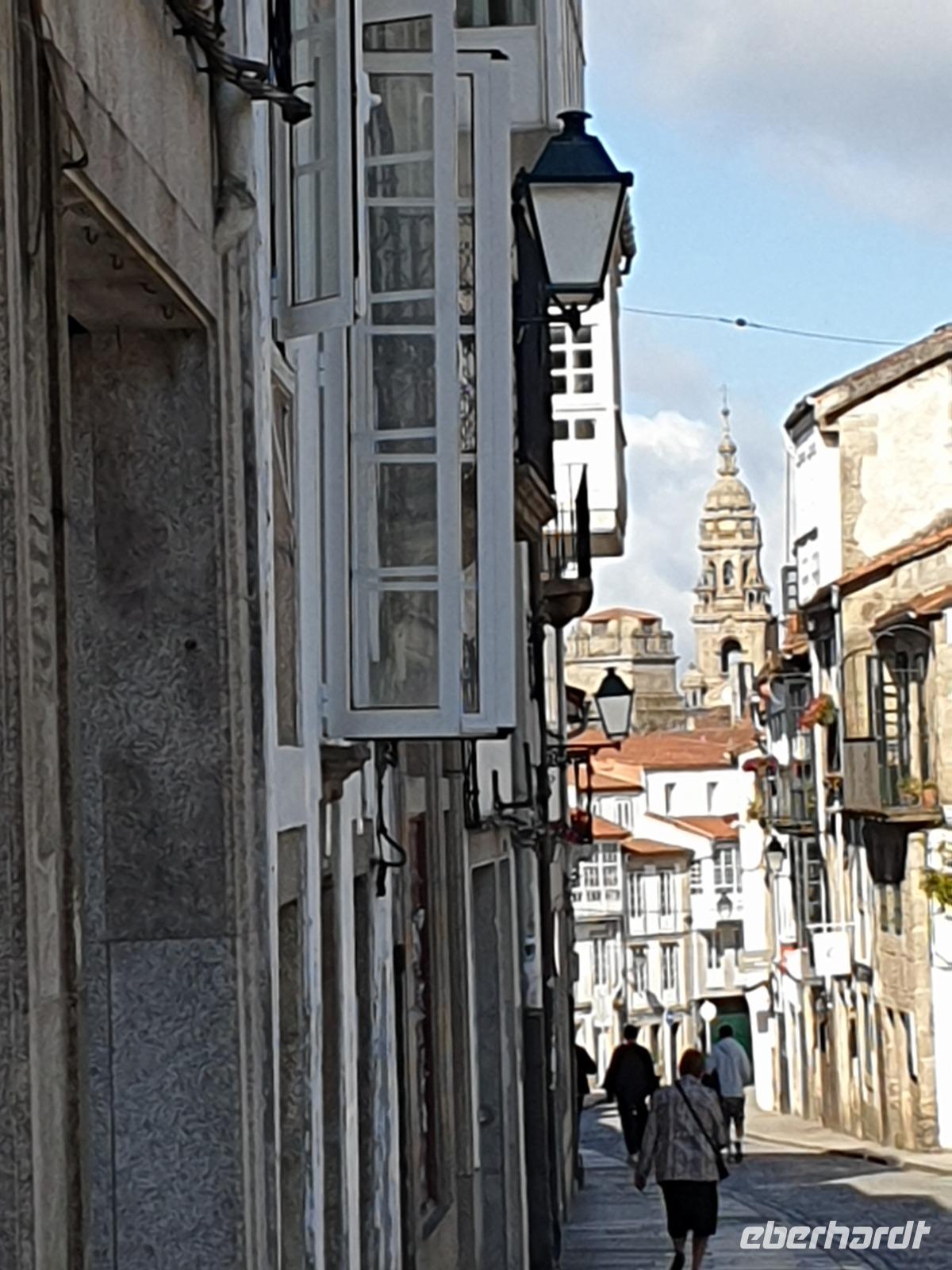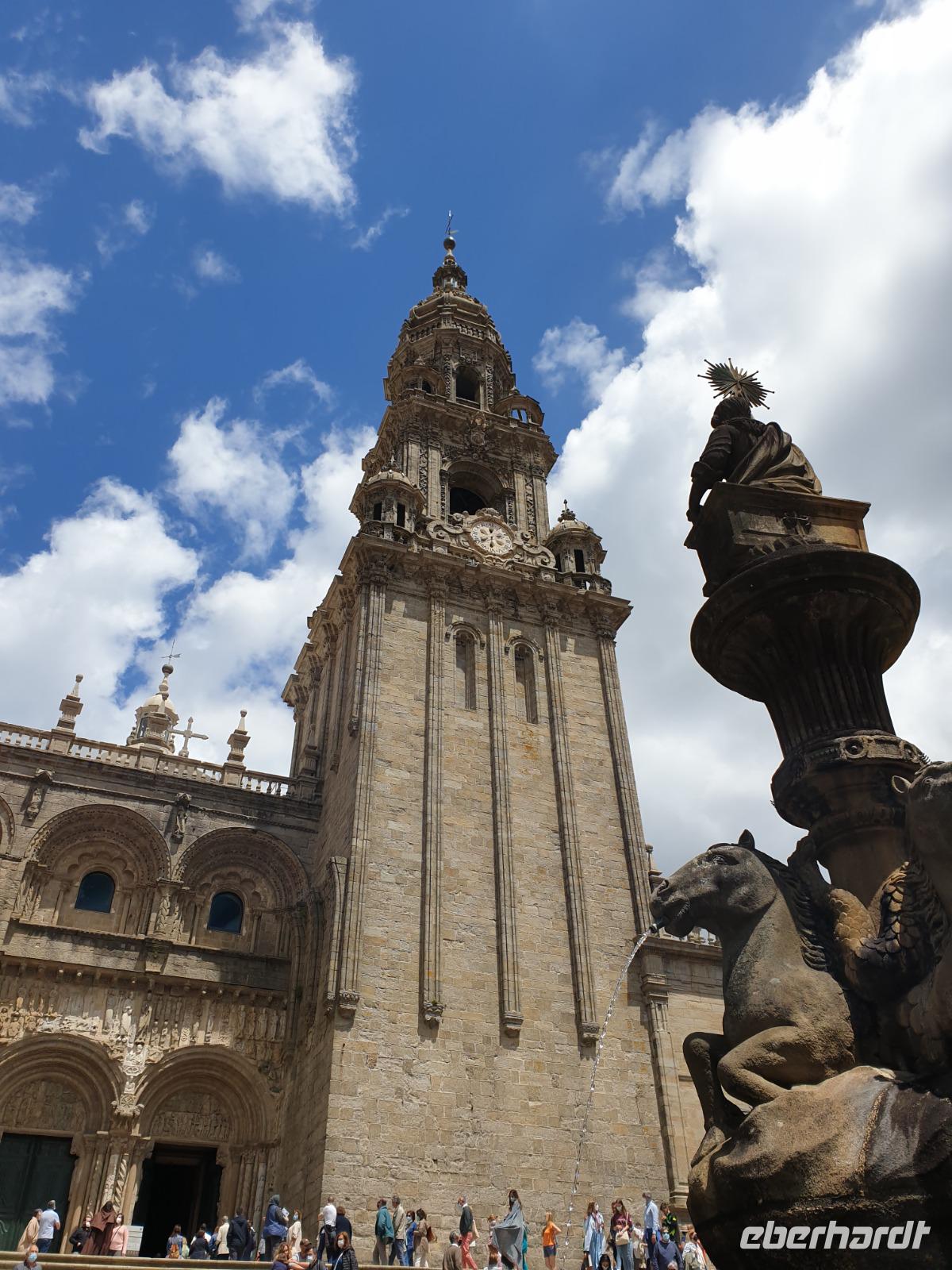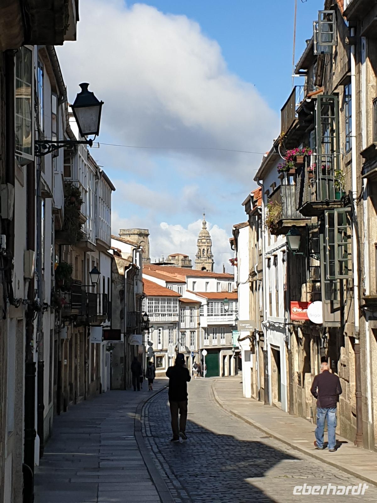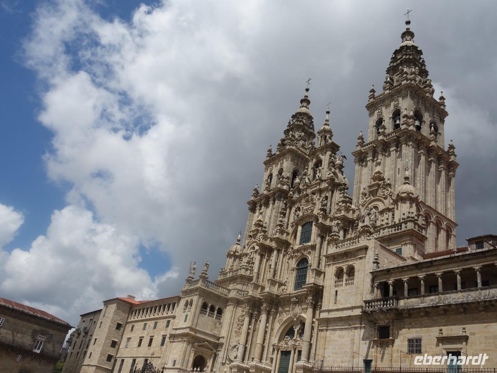 Heute entscheiden wir uns dafür, die letzten 5 Kilometer bis Santiago ohne reden zu wandern. Wir befinden uns hier vor den Toren von dem weltbekannten Wallfahrtsort Santiago de Compostela und der Hauptstadt der Provinz Galicien. Wir wandern heute das berühmte letzte Stück des Jakobswegs von Monte do Gozo (Hügel der Freude) von wo man die Türme der Kathedrale sieht bis Santiago de Compostela. Unsere Seele freut sich schon darauf! Auf dem Weg sehen wir die Türme der Kathedrale schon von Weitem und kommen wie schon im Mittelalter in der Stadt an, um traditionell den Apostel zu umarmen. Am Obradoiro Platz gegenüber der prächtigen Fassade der Kathedrale, machen alle tolle Bilder zur Erinnerung.