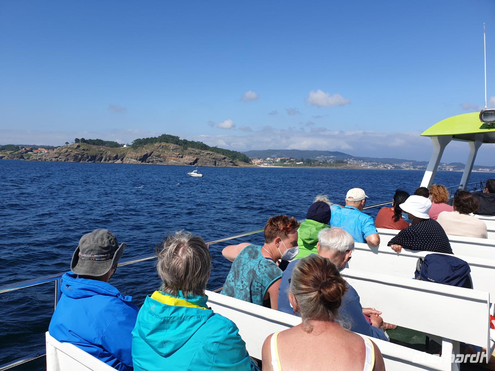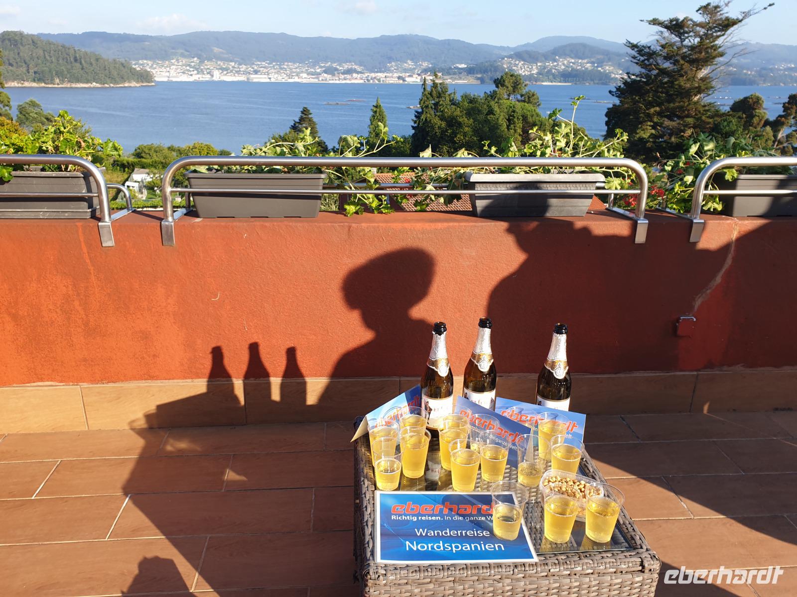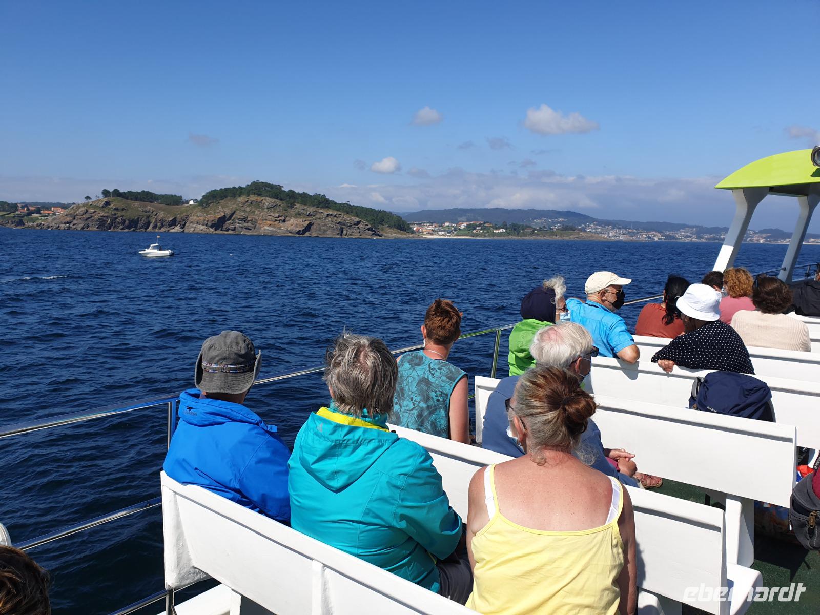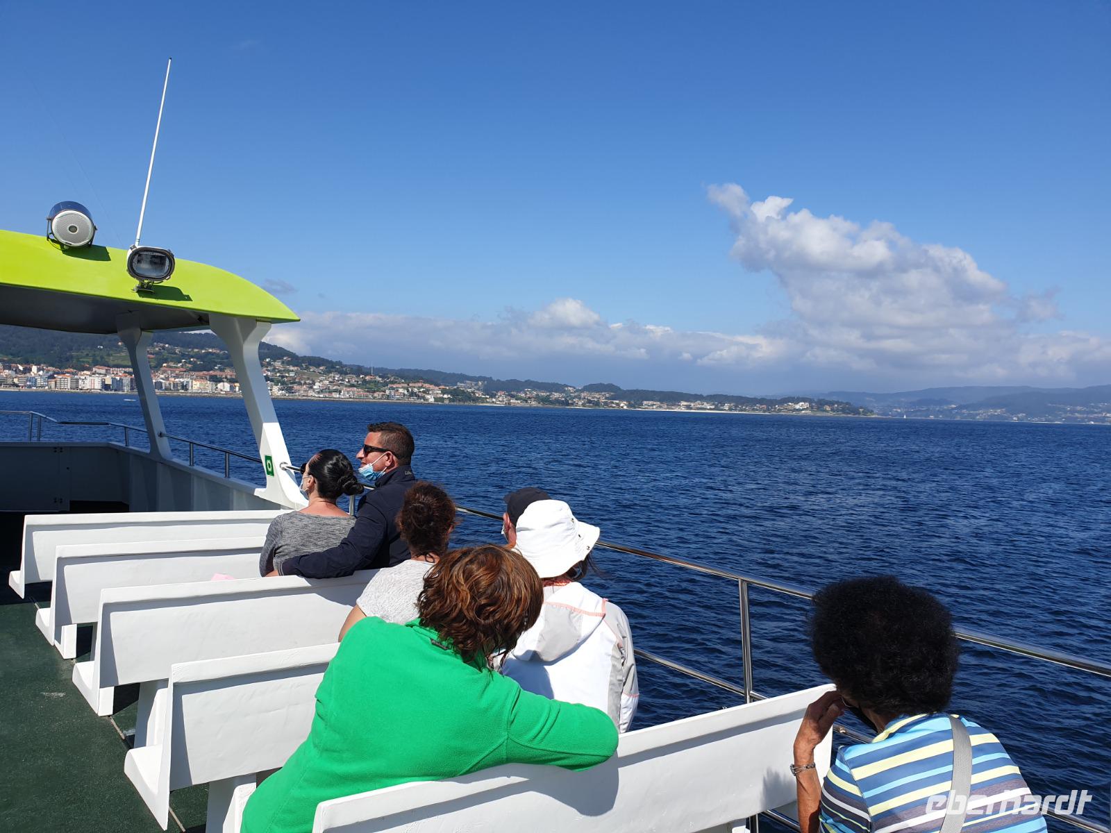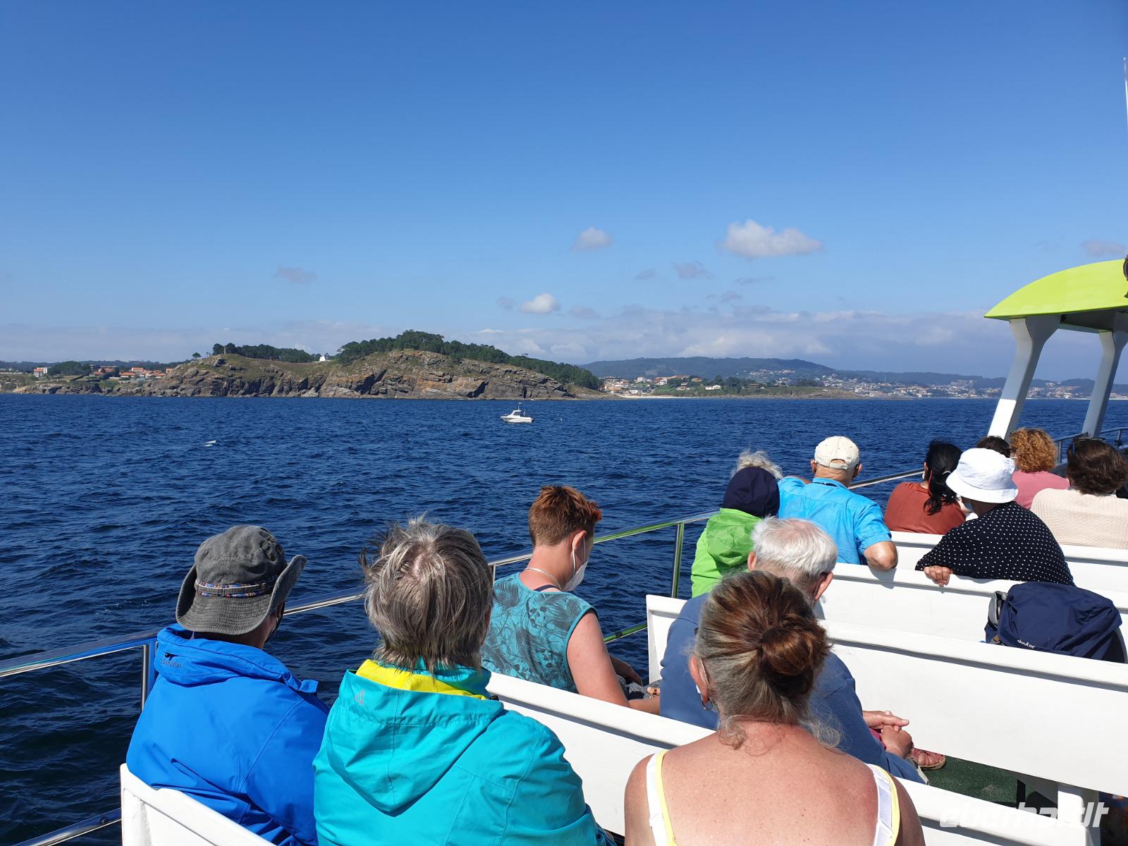 Heute früh fährt Benjamin kurz mit 3 Damen und Octavio nach Pontevedra um sich dort für Corona testen zu lassen. Positiv Nachrichten sind 3 mal negativ Wieder ins Hotel warte das Frühstück auf uns. Viele von uns nehmen bei dem fakultativen Tagesausflug mit Wanderung auf der Insel Ons im Nationalpark Illas Atlanticas teil. Wir fahren zu der Insel Ons. Es ist einfach toll diese neue Insel zu entdecken. Mit der Fähre "Piraten von Nabia" fahren wir 30 Minuten vom Hafen Portonovo auf die kleine Naturpark-Insel im Atlantik über. Sie gehört neben einigen anderen Inseln wie zum Beispiel Cies zum ältesten Nationalpark Galiciens. Der atlantische Nationalpark Illas Atlanticas beherbergt an Land ein reichhaltiges Ökosystem und das Wasser mit Dünen, Riffen, Felsenküsten und Wäldern umfasst über 8.000 Hektar. Bekannt ist die Insel Ons beispielsweise als Vogelreservat mit Komoranen, Reihern und Möwen. Gemeinsam und bei Kaiserwetter unternehmen wir eine tolle 2 stündige Wanderung. Uns gefällt es sehr, die Vogelwelt zu beobachten und nach dem Mittagessen einfach am Strand entlang zu spazieren oder zu baden. Das Meer ist herrlich, wie in der Karibik. Die Farbe des Wasser ist traumhaft. In einem Restaurant hatten wir auch ein leckeres Essen mit Reis typisch von hier, eine Art Paella mit frischem Fisch -und Meeresfrüchten. Lecker! Am Nachmittag verlassen wir mit der Fähre dieses kleine Paradies und kehren nach Poio auf das Festland von Nordspanien zurück. Noch vor unserem letzten gemeinsamen Abendessen gehen einige von uns an den wunderschönen weißen Sandstrand gegenüber dem Hotel und andere treffen sich auf der Terrasse vom Hotel mit anderen Gästen auf ein Plauderstündchen bei Kaffee, Kuchen oder Bier. Beim Essen lassen wir unsere erlebnisreiche Rundreise gemütlich ausklingen. Vorher hatte Eberhardt noch eine Überraschung auf der Terrasse vom Hotel oben um die ganze Reise im Kopf nochmal durchzugehen und mit Apfelwein zum letztes Mal anzustoßen.