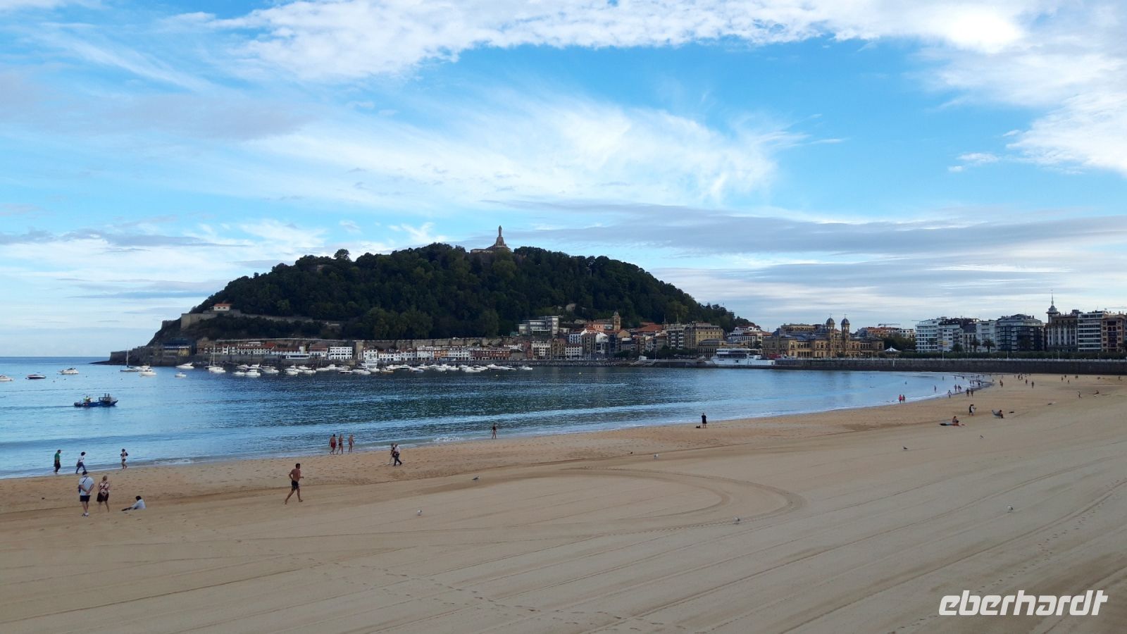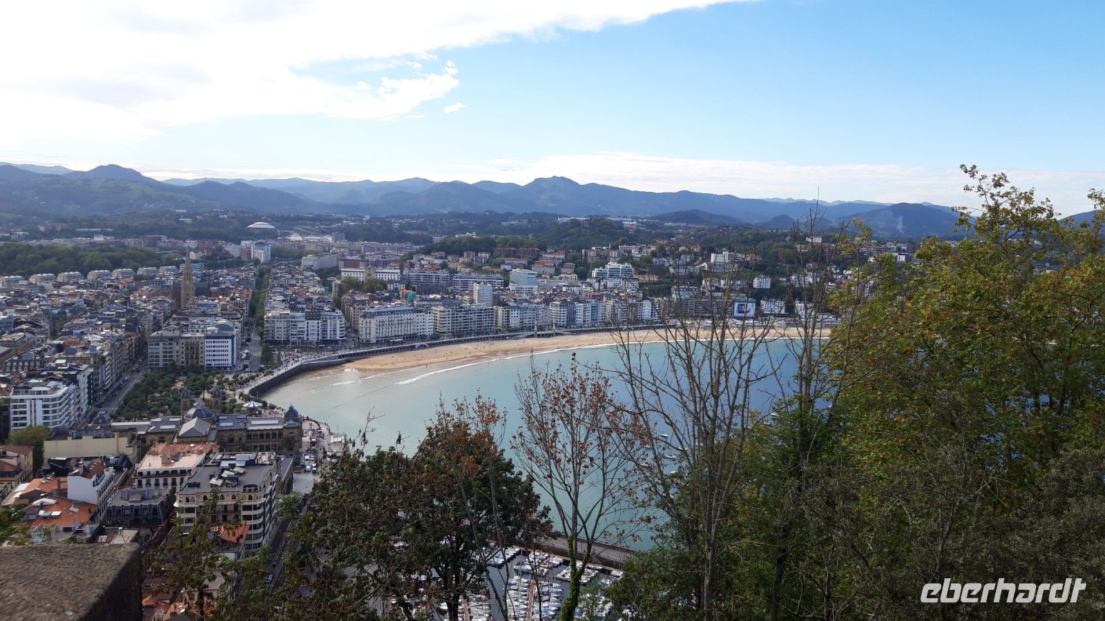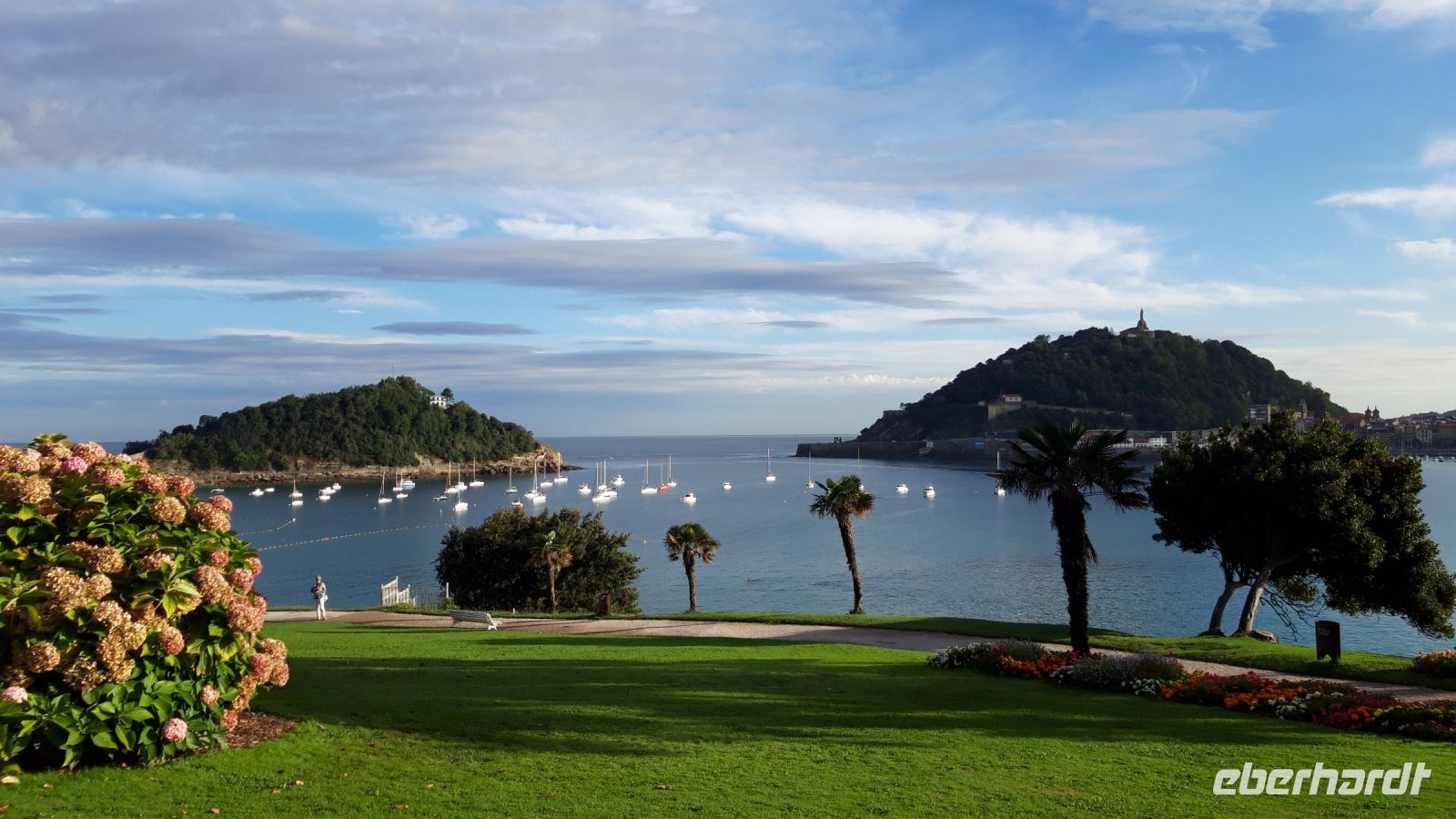 Mit nun 19 Reisegästen und Eberhardt-Reiseleitung verlassen wir die Provinz Bizkaya in Richtung Osten und nähern uns der französischen Grenze, um das ehemals mondäne Seebad San Sebastián (oder auf Baskisch Donostia, was dasselbe bedeutet), zu besuchen. Die Stadt ist vor allem bekannt für ihre langen Sandstrände, der bekannteste davon in der Bucht La Concha, die zwischen den beiden Bergen Monte Urgull und Monte Igueldo liegt. Unterwegs gibt es noch eine kleine Auffrischungsstunde in spanischer und baskischer Geschichte, sodass aus der Bildungsauftrag der Reise erfüllt wird.