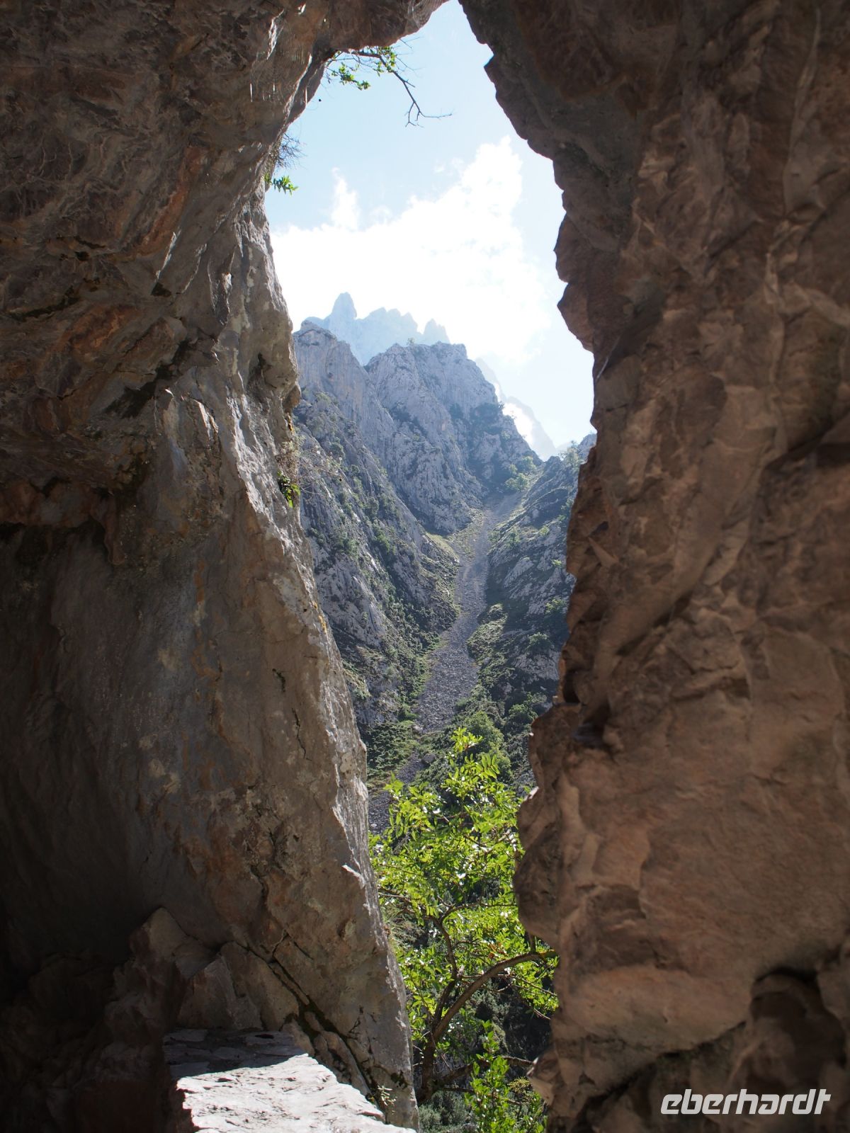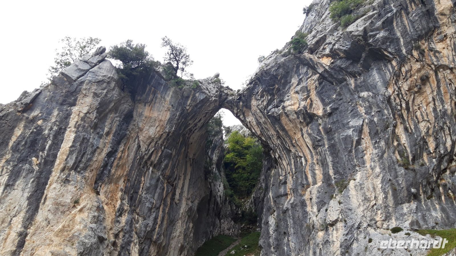 Die Ruta del Cares ist einer der beliebtesten Wanderwege in den Picos de Europa. In der sogenannten „göttlichen Schlucht“ fließt der Fluss Cares zwischen zum Teil über 1.000 Meter hohen Felshängen hindurch. 1916 wurde mit der Erweiterung des gewundenen und unsicheren Pfads zur Kontrolle und Instandhaltung eines vom Energieversorgungsunternehmen Electra de Viesgo angelegten Wasserkanals begonnen. Durch den Kanal wurde ein Teil der Wassermenge des Cares zur Energiegewinnung zum Wasserkraftwerk von Camarmeña geleitet. In den 40er und 50er Jahren des letzten Jahrhunderts wurde dann der heutige Weg angelegt, um die Wartungsarbeiten am Kanal zu erleichtern, außerdem wurde er 1946 auch offiziell als Wanderweg freigegeben. Besonders faszinierend sind die in den Kalkstein gehauenen Durchbrüche und Tunnels, die wir auf unserem 12 Kilometer langen Weg durchqueren.