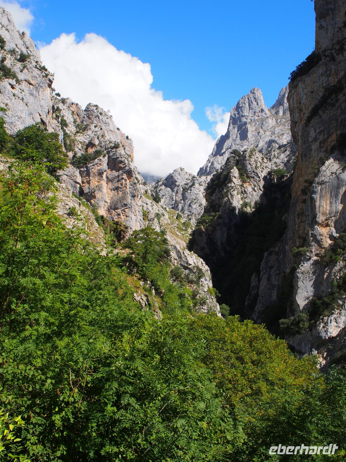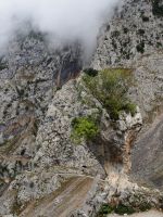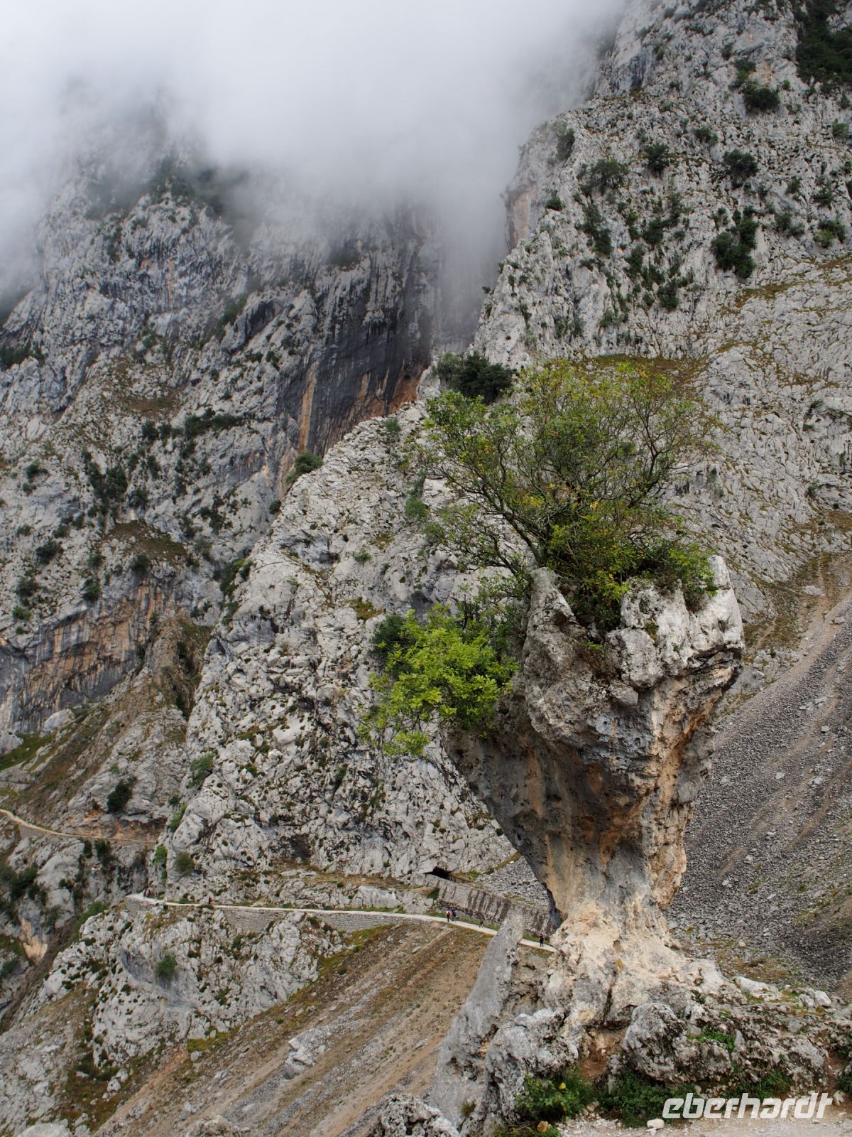Die ersten zwei Kilometer vom Startpunkt in Poncebos hinauf zum Scheitelpunkt Los Collaos auf 535 Metern kommen wir ordentlich ins Schwitzen und sind ganz froh, über den noch nebelverhangenen Himmel. Nichtsdestotrotz hat man immer wieder einen fantastischen Blick auf den Naranjo de Bulnés, den markantesten Berg der Picos. Spektakulär ist die Strecke ohne Zweifel, denn von hier an schlängelt sich der Weg immer weiter entlang der Berghänge durch die Schlucht und im Hintergrund tauchen immer wieder die 2.000 Meter hohen umliegenden Bergspitzen auf. Am Vormittag reißt dann auch der Himmel auf und so können wir unser Bocadillo mit wohlriechendem Cabrales-Käse in der Sonne genießen, während über uns die Geier kreisen. Es wird die Vermutung laut, dass der Käse womöglich nach toter Ziege riechen könnte, aber dieses Gerücht wollen wir nicht weiterverbreiten – er schmeckt auf jeden Fall köstlich.