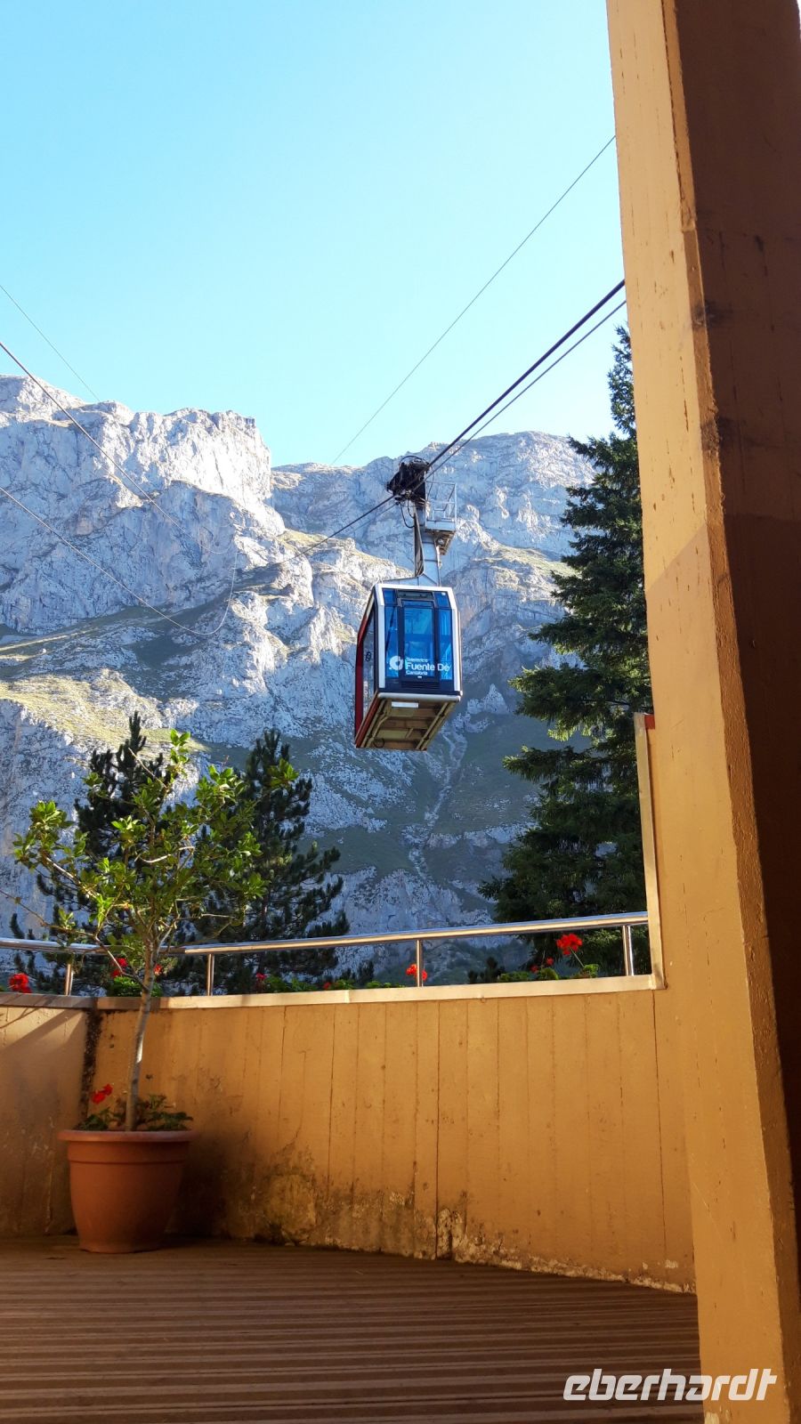 Schließlich erreichen wir den Ort Fuente Dé, der auf rund 1100 m Höhe in einem nach Süden offenen Talkessel liegt, der halbrund von bis zu 300 m hohen Felswänden umgeben ist. Hier treffen wir wenig später auf unseren Bergführer Oscar. Mit ihm zusammen besteigen wir dann die Seilbahn Fuente Dé die uns in nur vier Minuten auf die Höhe von 1.823 Metern bringt. Von hier oben hat man eine unglaubliche Aussicht.