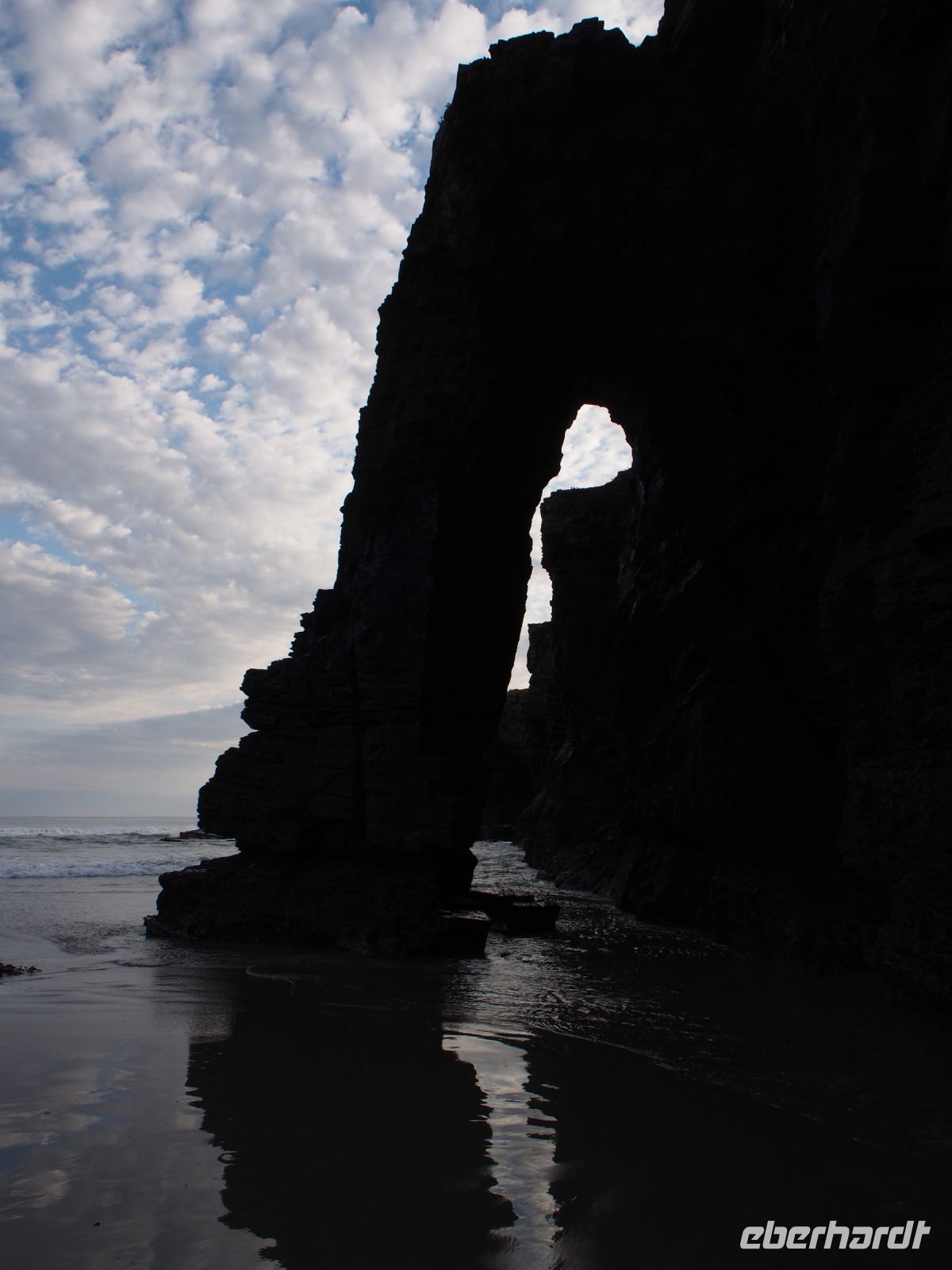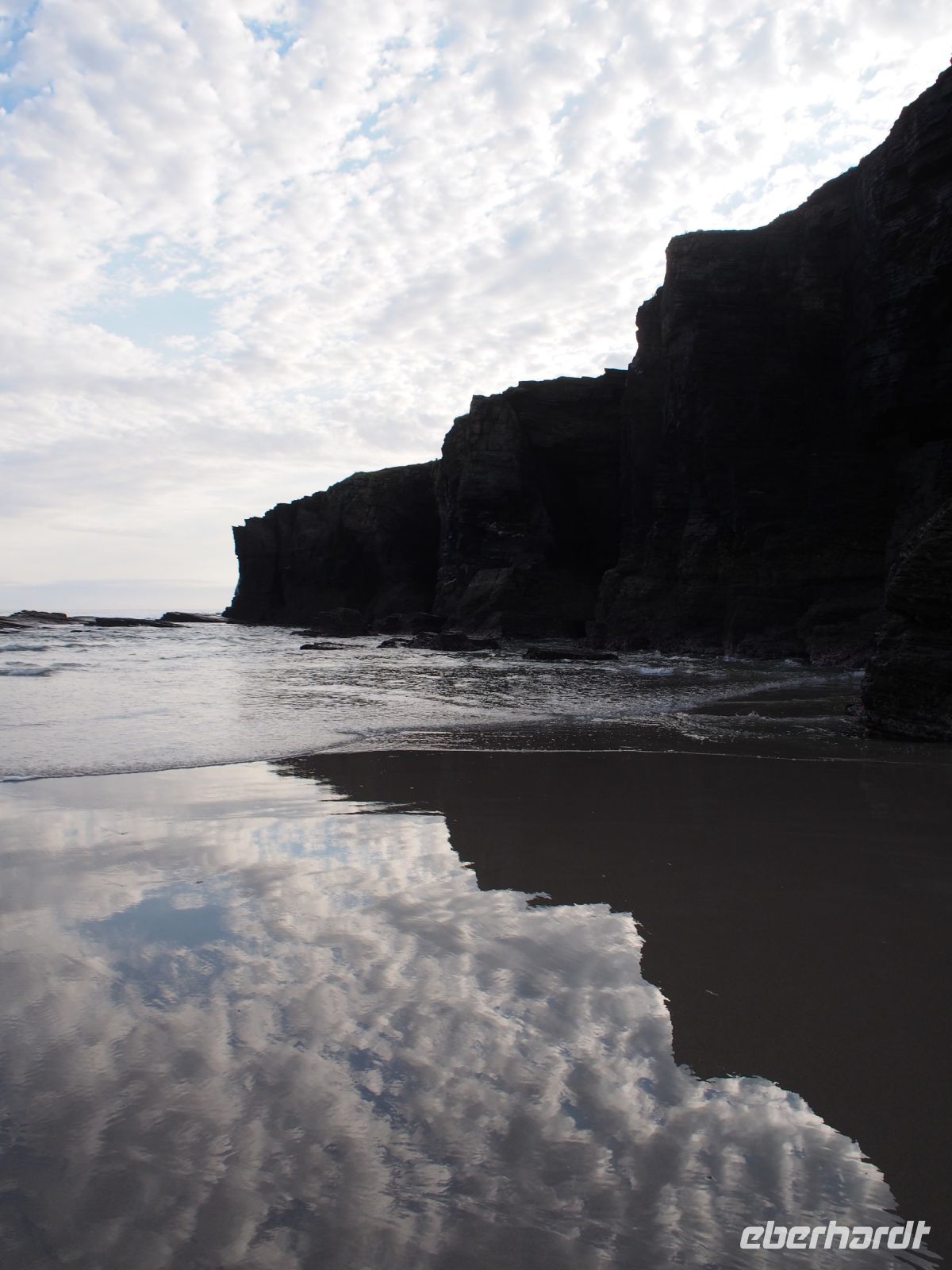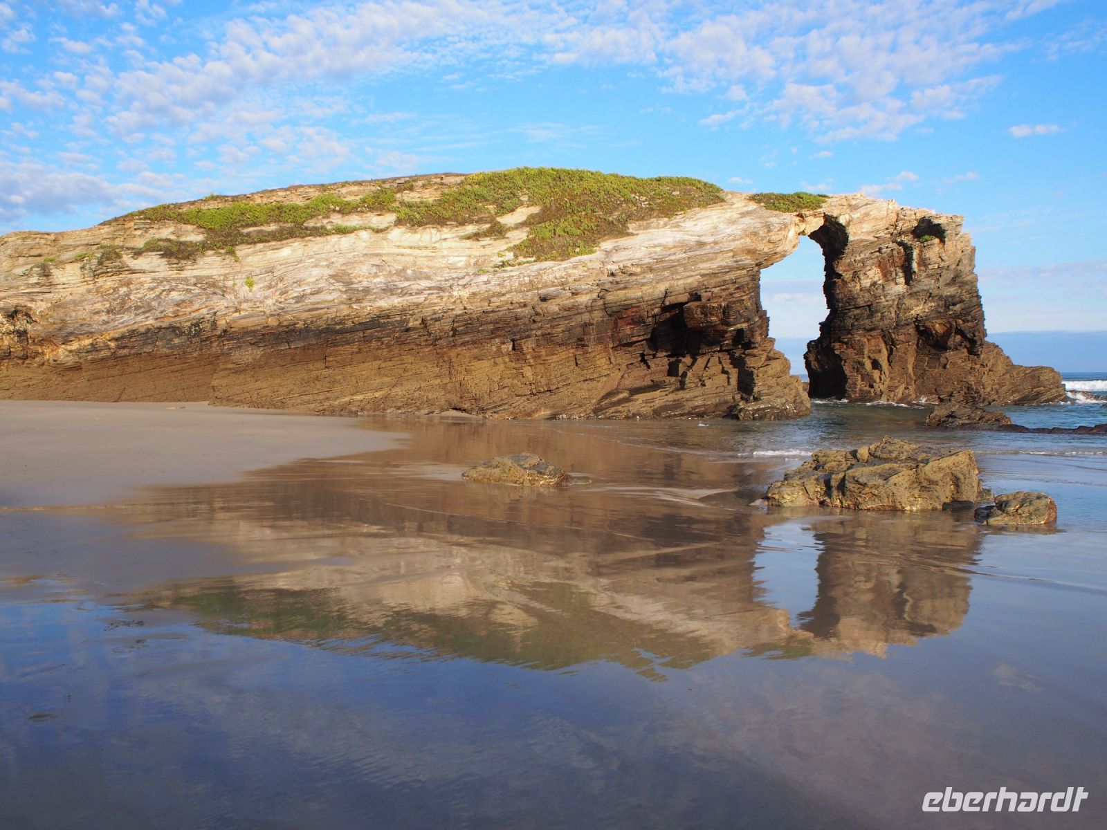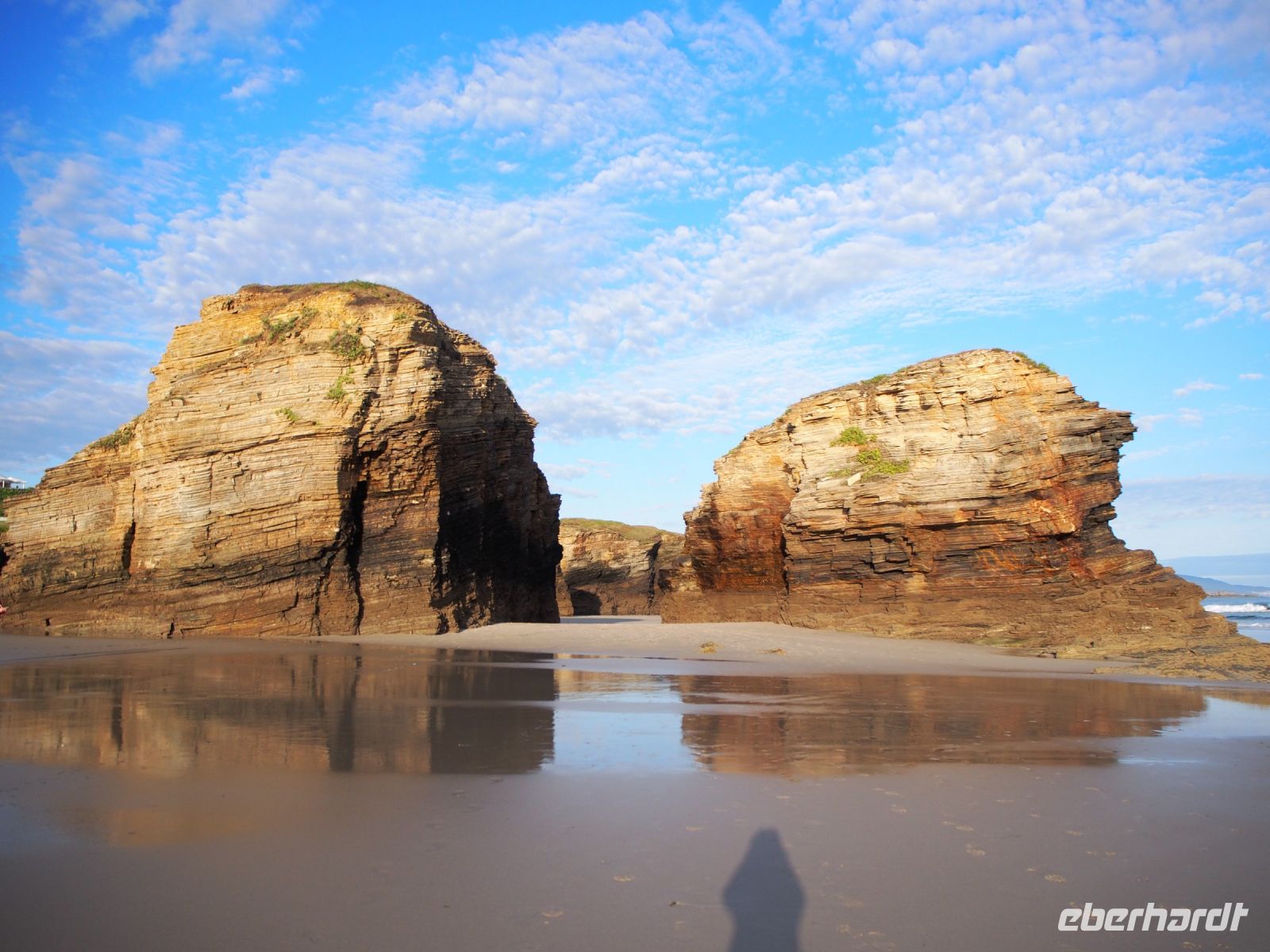 Den heutigen Tag starten wir ganz entspannt, denn bis zu unserem ersten Ziel haben wir es nicht weit. Ganz in der Nähe von Ribadeo befindet sich die berühmte Playa de las Catedrales (galicisch Praia as Catedrais), also Strand der Kathedralen. Der vielversprechende Name kündigt die beeindruckenden und bizarren Felsformationen an, die durch tektonische Verschiebungen und Erosion innerhalb der letzten 500 Millionen Jahre entstanden sind. Tatsächlich begehbar ist dieser berühmte Strand nur, wenn Ebbe ist und das passt heute wunderbar. Wir können einen großen Teil des insgesamt 1,5 Kilometer langen Strandes begehen und dabei viele der aus dem Schiefer gewaschenen Höhlen und Türme bewundern. Der blaue Himmel mit leichten Wolken bietet dazu noch den perfekten Hintergrund für Fotos.