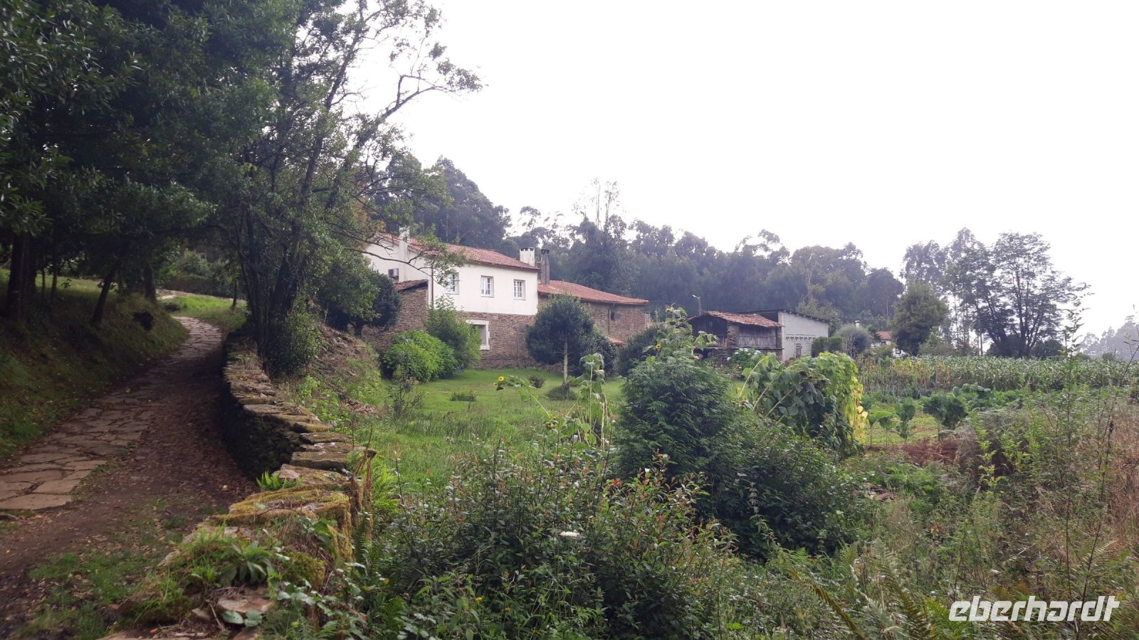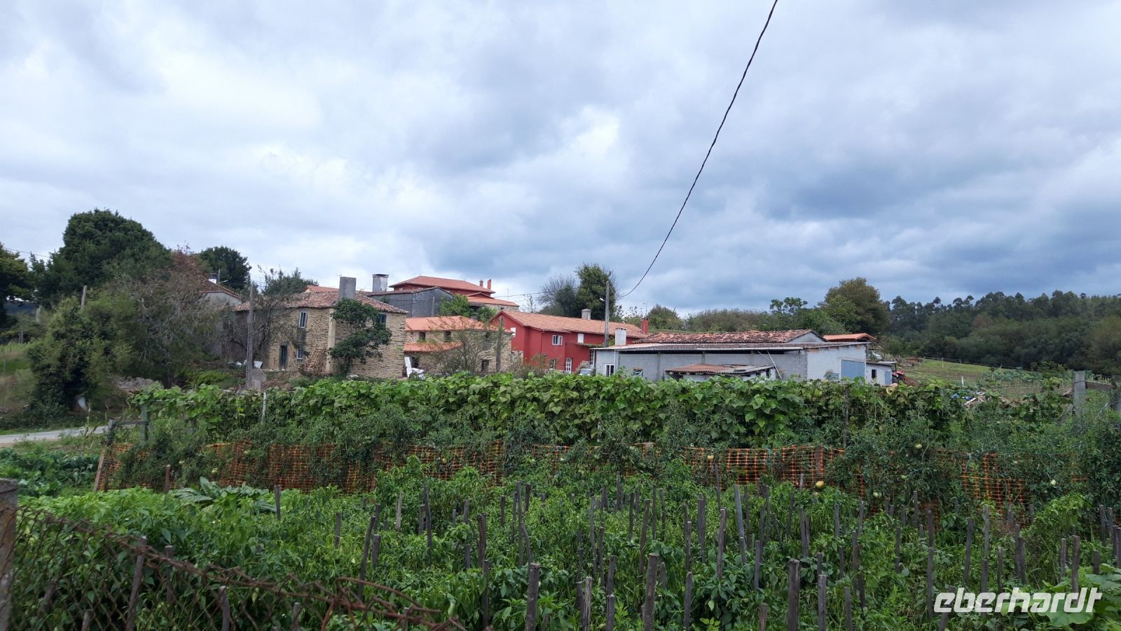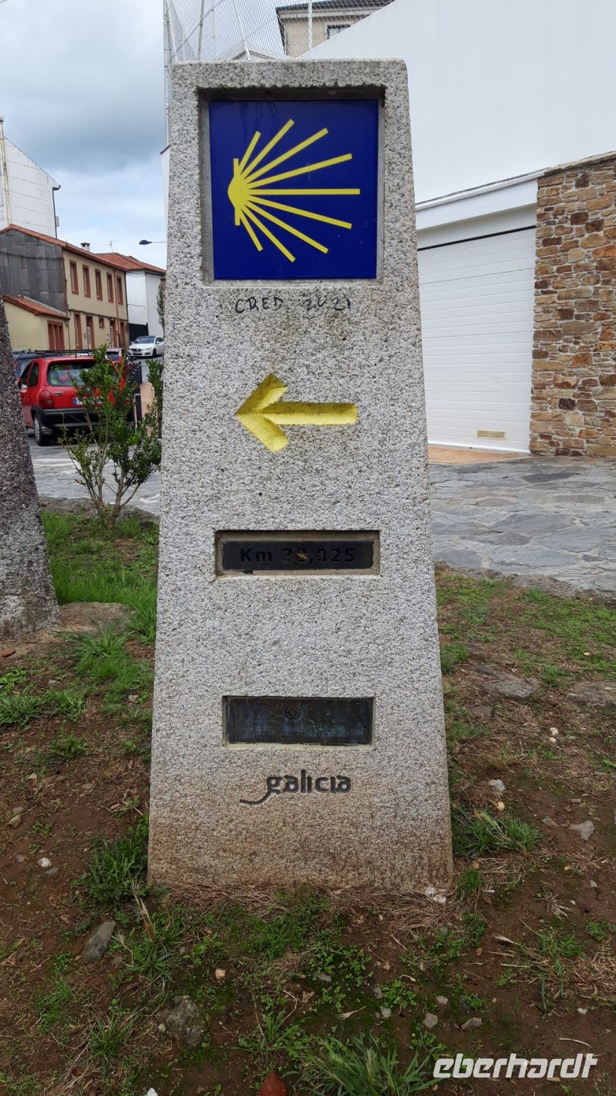 Also, so ganz echte Pilger sind wir nicht, aber trotzdem muss man sich ja ins Bild einfügen. Mit Rucksäcken und Funktionskleidung sind wir schon ausgestattet, auch Wanderstöcke haben schon einige dabei – also fehlt nur noch die Jakobsmuschel sowie eine Wegbeschreibung zum Hotel mit Streckenabschnitten, falls man das Bedürfnis hegt wieder auf die Gruppe zu treffen, und dann kann es auch schon losgehen: ¡Buen camino! In Arzúa verlassen wir den Bus (bis auf drei etwas müde Pilger, die beschlossen haben die Strecke zu halbieren), und folgen der Straße durch den Ort, bis wir schließlich links auf einen Feldweg abbiegen können und dort den ersten richtigen Kilometerstein finden. Noch 18 Kilometer. Der Weg lässt sich wirklich gut gehen und führt durch kleine Eichen- und Eukalyptuswälder, vorbei an Maisfeldern und durch kleine Dörfchen. Das Wetter spielt wunderbar mit, es herrschen angenehme 20 Grad und der Himmel ist leicht bewölkt. Der einzige Wermutstropfen ist, dass fast alle Pilgerherbergen geschlossen haben, und wir einige Kilometer zurücklegen müssen, bis wir eine Rast einlegen können. Erst kurz vor dem Ziel ereilt uns dann ein kurzer Regenguss, aber wir verbuchen das als Quotenregen, und legen die letzten Meter nun eben mit Regenjacke zurück.
