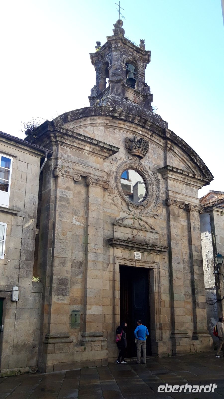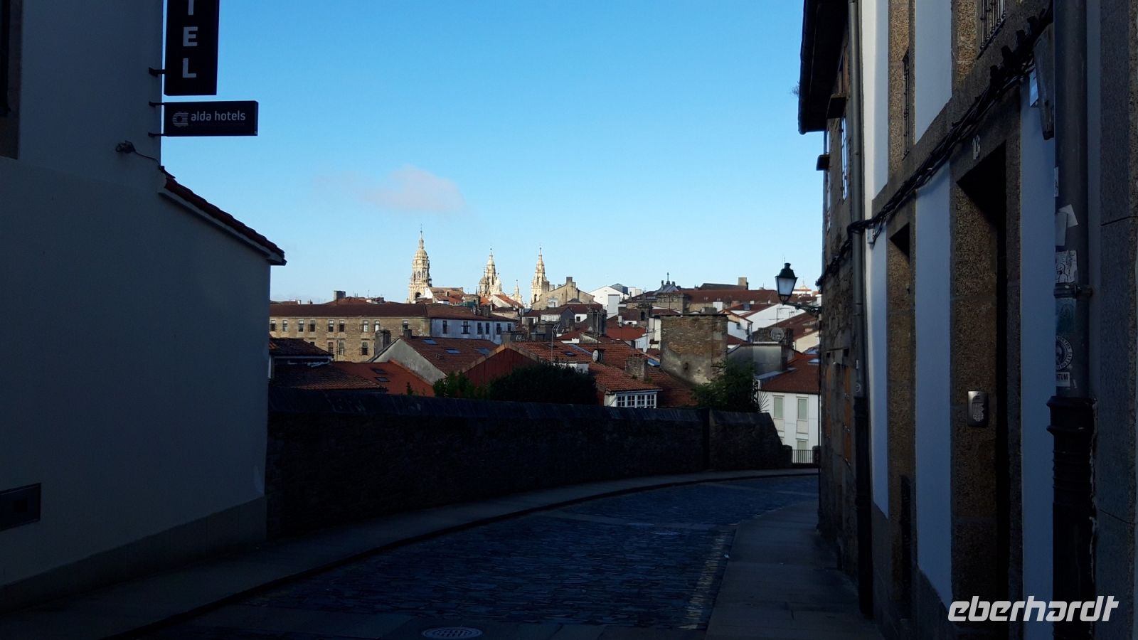 Der nächste Morgen startet an reichlich gedeckten Frühstückstischen, wo wir uns für die letzte Etappe des Jakobsweges stärken können. Dann bringt uns unser neuer Busfahrer Tomás wenige Kilometer weiter in den Ort San Marco, direkt vor den Toren der Stadt Santiago de Compostela. Vom Monte do Gozo („Berg der Freude“) aus kann man zum ersten Mal die Türme der Kathedrale von Santiago sehen. Wenn man schon knapp 800 Kilometer zu Fuß zurückgelegt hat, muss es ein überwältigendes Gefühl sein, das Ziel endlich buchstäblich vor Augen zu haben. Auch wenn wir nur ungefähr 20 Kilometer des Jakobsweges gepilgert sind, freuen auch wir uns darauf, in etwa einer Stunde endlich das gefühlte „Ziel“ zu erreichen, von dem uns nun noch vier Kilometer trennen. Der Pilgermarsch geht nun bergab und durch die Randbezirke des modernen Santiagos und dann durch das Viertel San Lazaro in die Altstadt hinein.