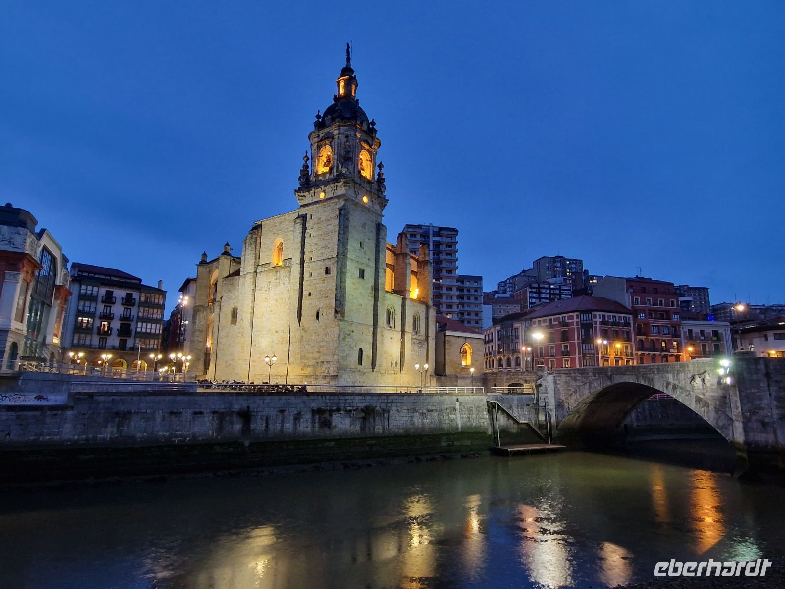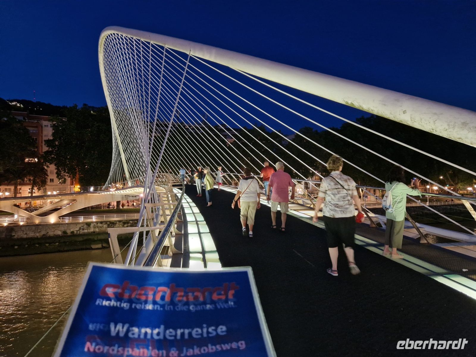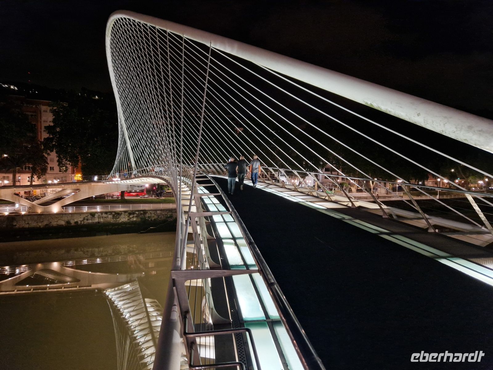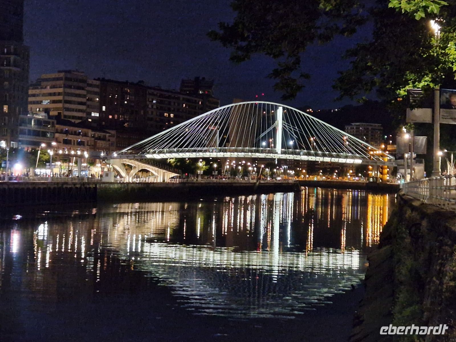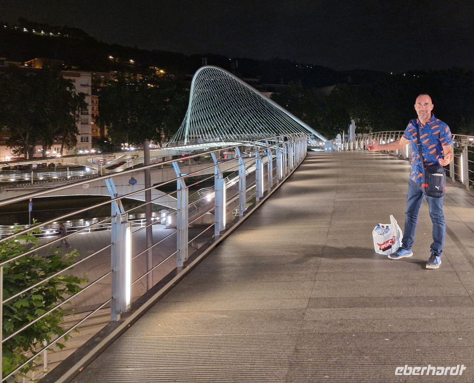 Wir wollen uns gut gehe und sitzen in die Altstadt bei dem Tapas-Kneipe vom Athletic Bilbao Fußballverein wo wir alle möglichen Tapas verkosten. Uns geht es gut. Nach dem Essen laufen wir zurück ins Hotel. Am Fluss entlang ist die Stadt toll beleuchtet.