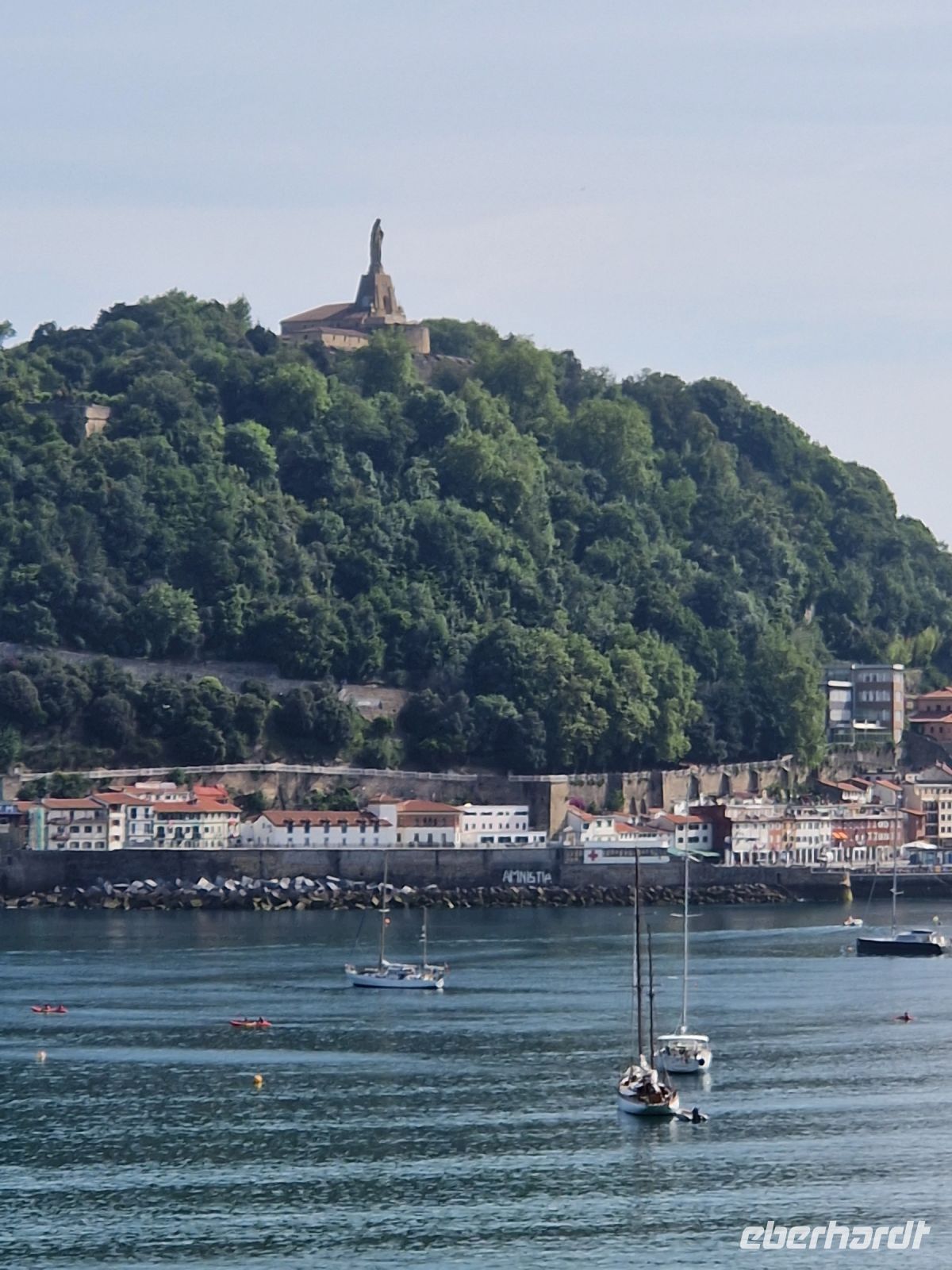Nach dieser kleinen Wanderung (oder Spaziergang) wollten einige in die Toilette und wer wollte, könnte in der Zwischenzeit schon kurz zum ersten Mal ans Meer baden. Am Ende des Strandes befindet sich hoch auf dem Urgull Berg auf dem Gipfel die Christus-Statue (12,5 Meter hoch) von wo man einen schönen Blick auf den Hafen und die Altstadt hat.