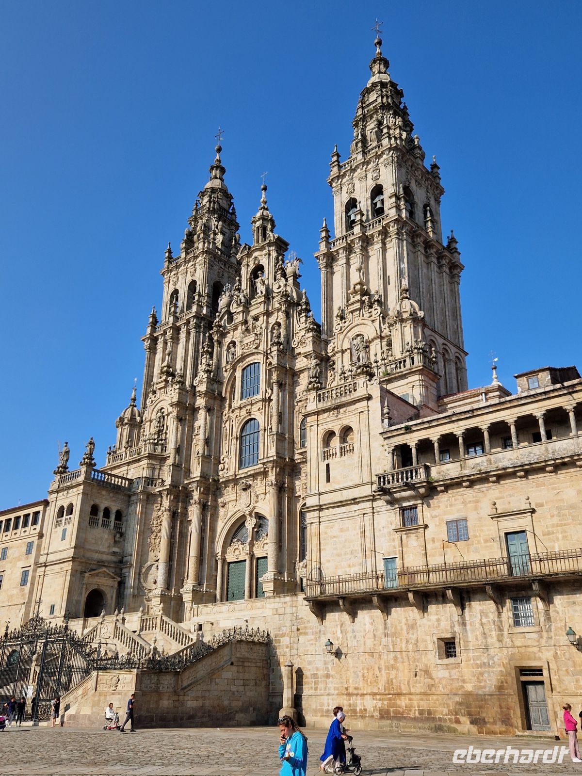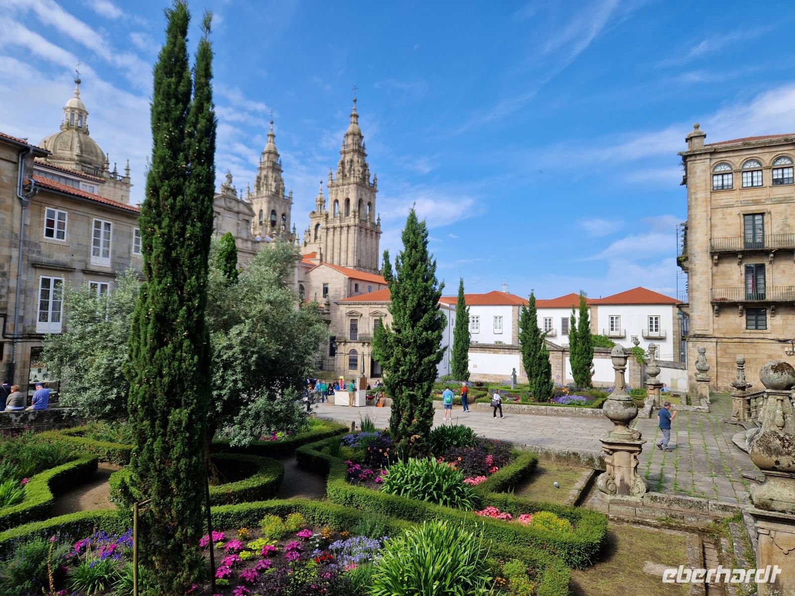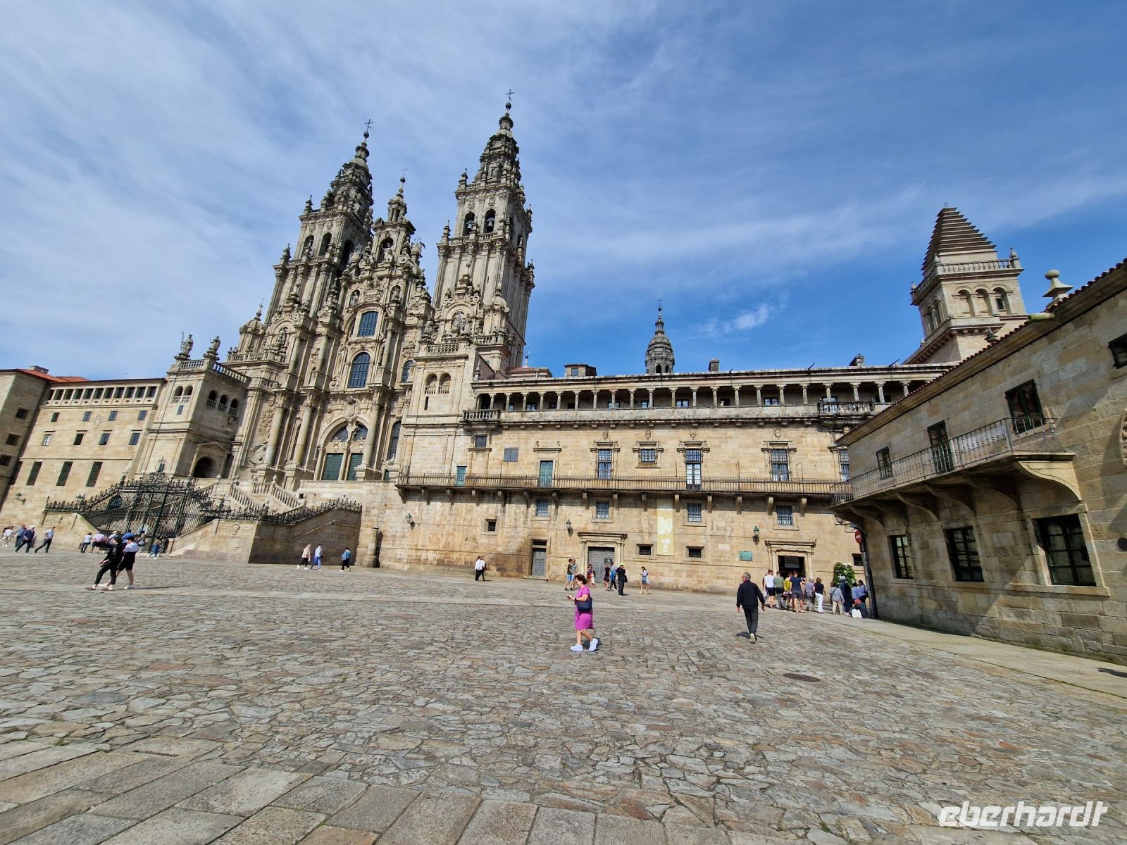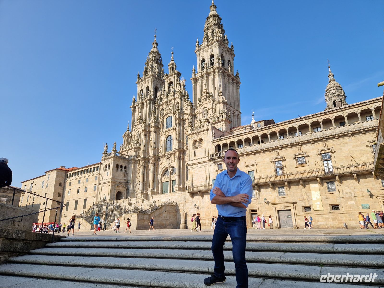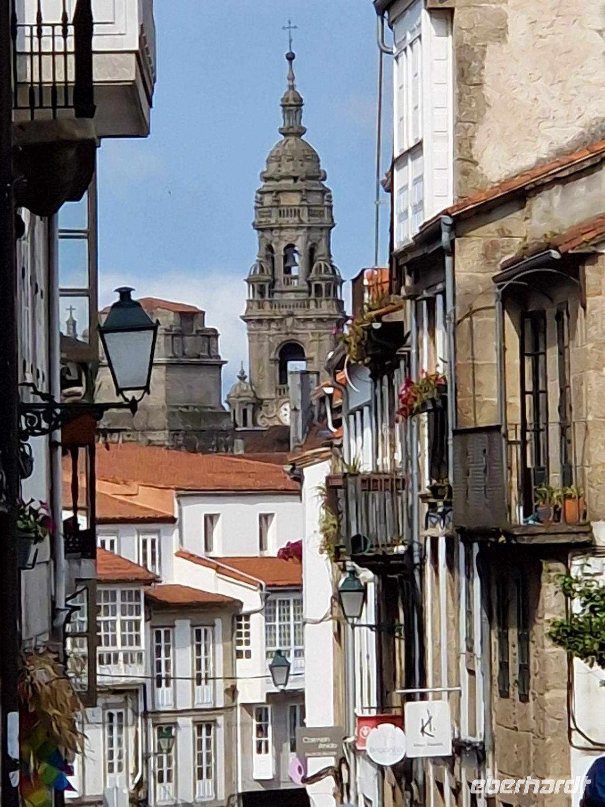 Wir haben unser Ziel erreicht und hören schon die Glocken der Kathedrale. Wir besichtigten die Kathedrale und umarmten den Apostel laut der Tradition und alle von uns bleiben um 12 Uhr da um die Pilgermesse zu hören. Wir hatten dieser Termin wieder Glück da heute am Ende der Messe an der Kathedrale von Santiago de Compostela können wir das größte Weihrauchfass der Welt, den Botafumeiro, erstaunen. Man hat weinend zugehört und Tränen gesehen, aber alle volle Freude und Zufriedenheit. Was für eine Ruhe hier. Später bei einer Stadtbesichtigung erkunden wir weiter auch die Altstadt von Santiago de Compostela, die neben der Kathedrale und dem Jakobsweg natürlich auch zum Weltkulturerbe der UNESCO gehört. Eberhardt Travel hat auch heute eine Überraschung und besorgte für alle Gäste einem Ribeiro Glas Weißwein um zu feiern, dass man bis hier her es geschaffen hat.