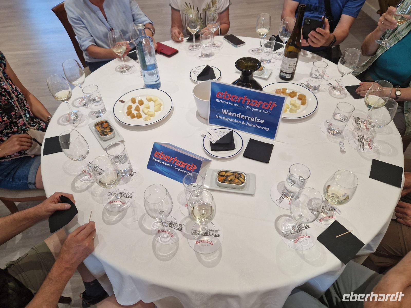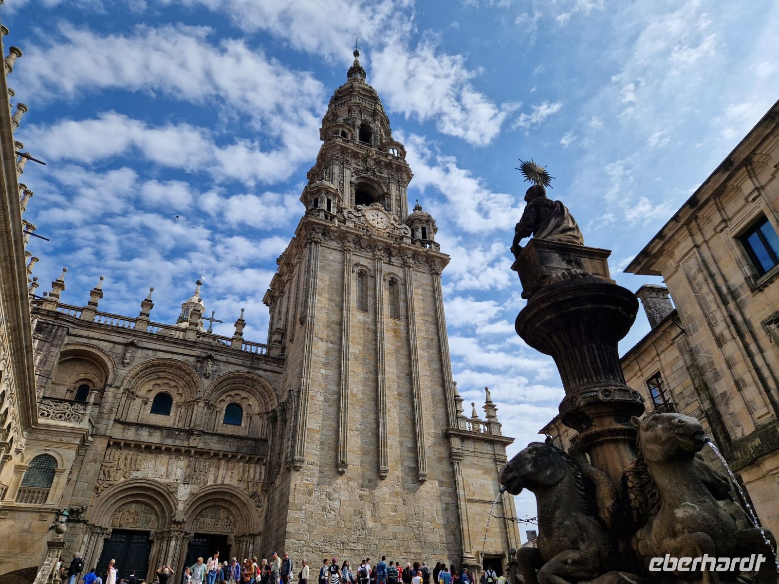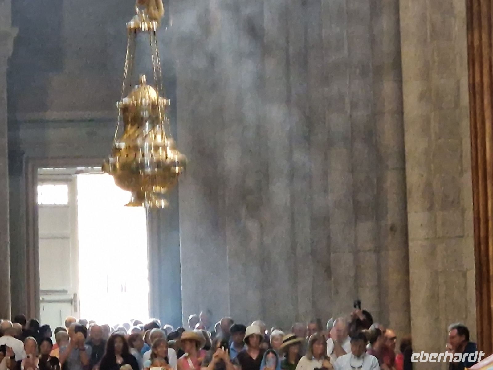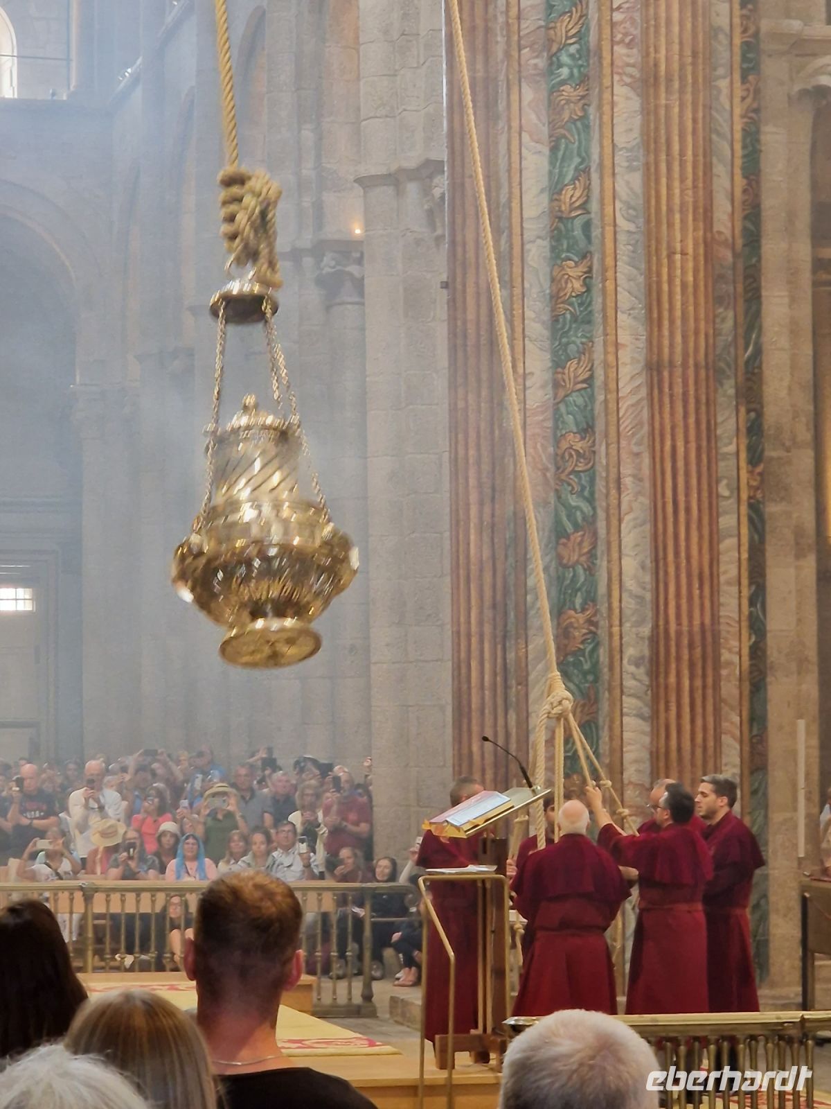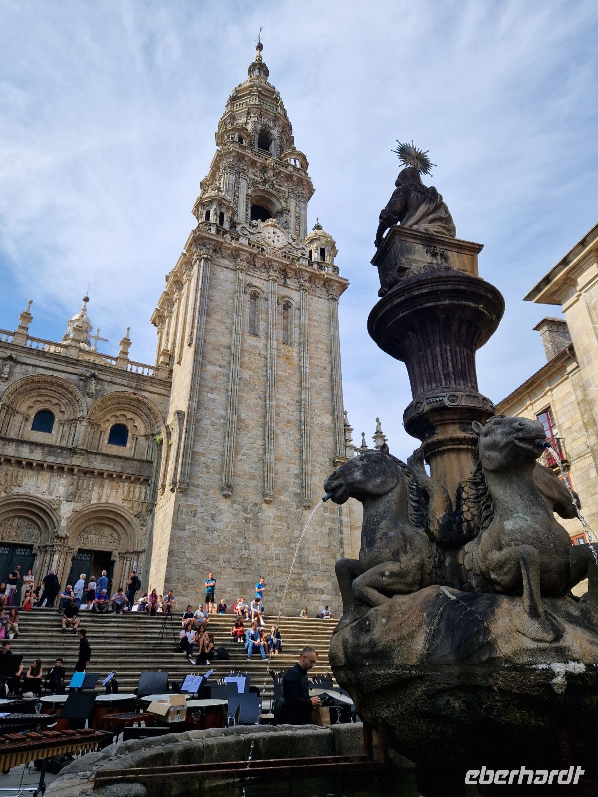 Wir haben unser Ziel erreicht und hören schon die Glocken der Kathedrale. Wir besichtigten die Kathedrale und umarmten den Apostel laut der Tradition und alle von uns bleiben um 12 Uhr da um die Pilgermesse zu hören. Wir hatten dieser Termin wieder Glück da heute am Ende der Messe an der Kathedrale von Santiago de Compostela können wir das größte Weihrauchfass der Welt, den Botafumeiro, erstaunen. Man hat weinend zugehört und Tränen gesehen, aber alle volle Freude und Zufriedenheit. Was für eine Ruhe hier. Später bei einer Stadtbesichtigung erkunden wir weiter auch die Altstadt von Santiago de Compostela, die neben der Kathedrale und dem Jakobsweg natürlich auch zum Weltkulturerbe der UNESCO gehört. Eberhardt Travel hat auch heute eine Überraschung und besorgte für alle Gäste einem Ribeiro Glas Weißwein um zu feiern, dass man bis hier her es geschaffen hat.