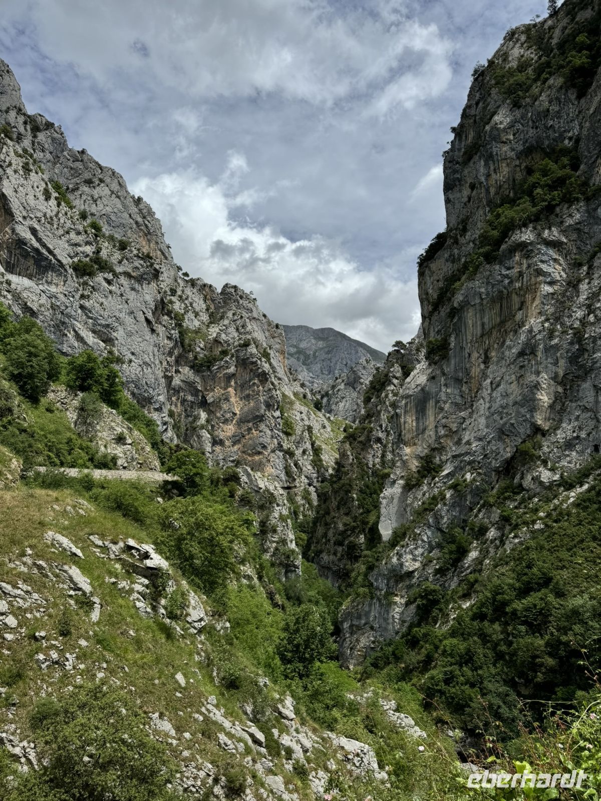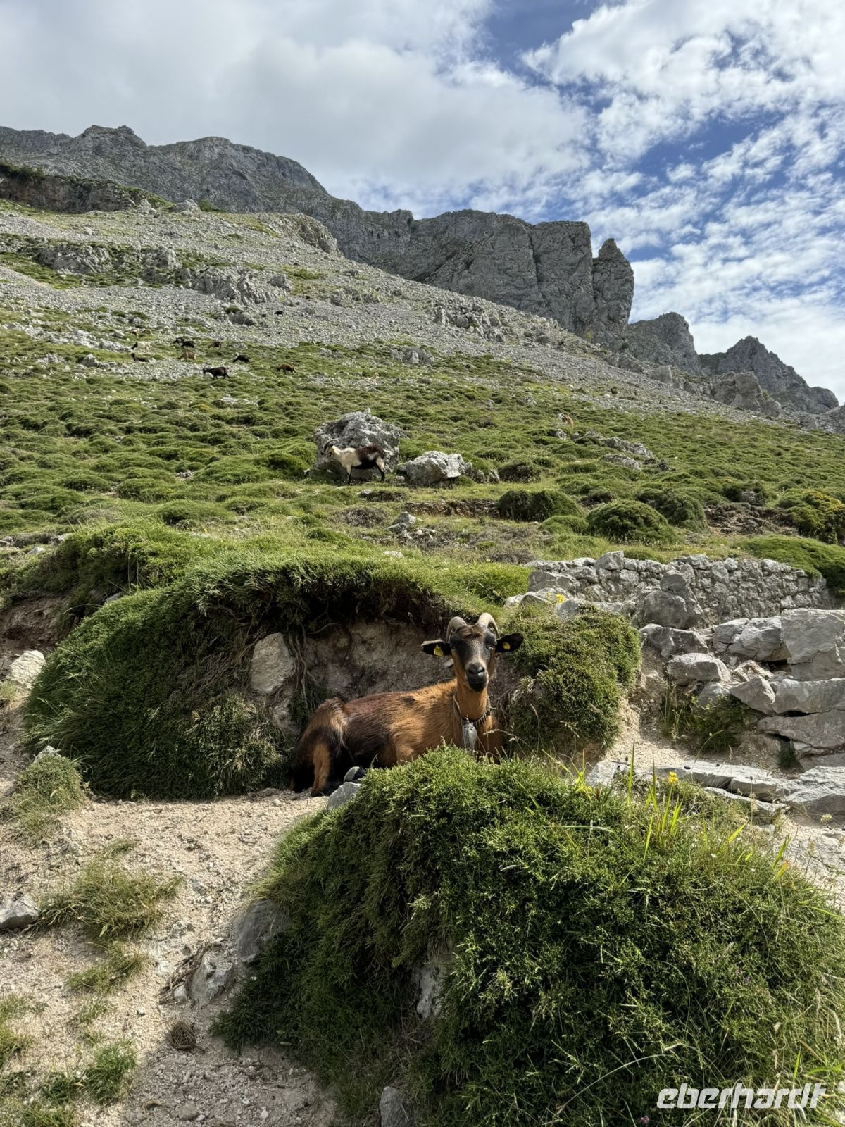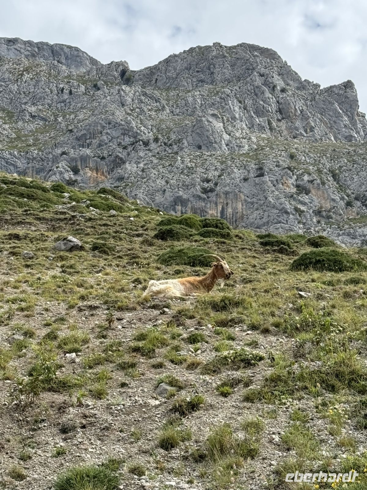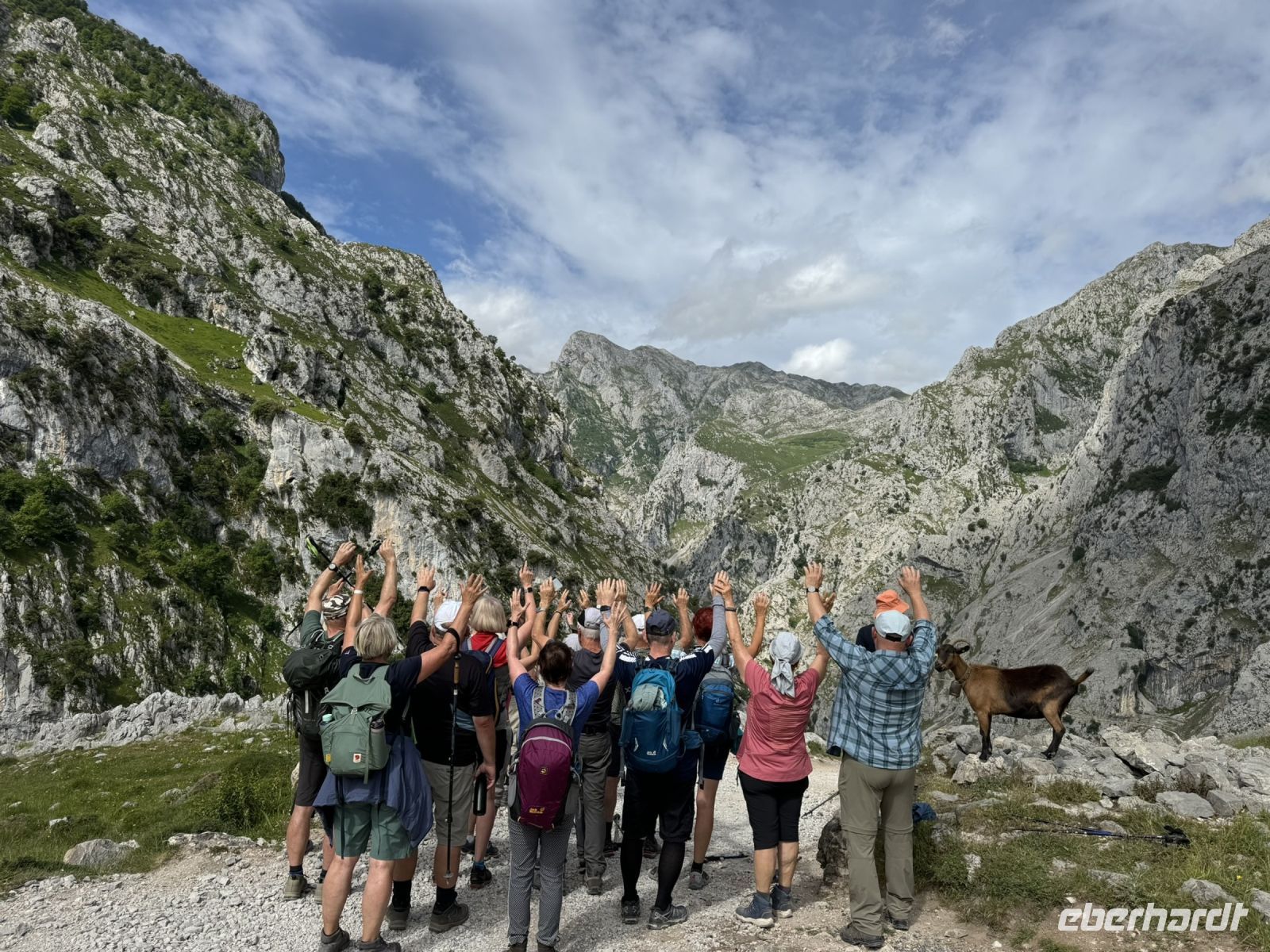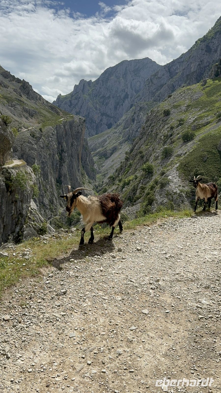 Oben angekommen, bekamen wir herrliche Ausblicke auf die Schlucht und den imposanten Nationalpark Picos de Europa, sowie auf die verschiedenen Gipfel zu Gesicht. Ab diesem Punkt steigerte sich unser Tempo leicht und jede Kurve brachte eine neue Überraschung mit sich, wie die netten Ziegen, welche uns begrüßt haben.