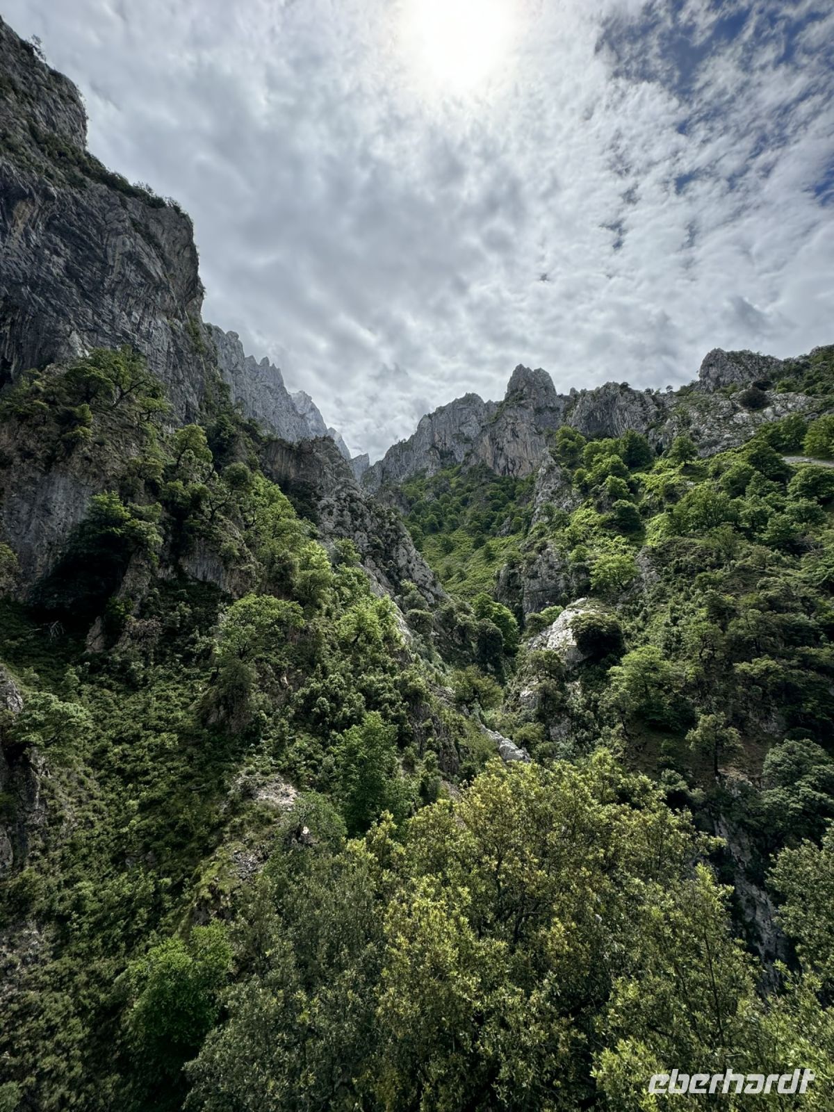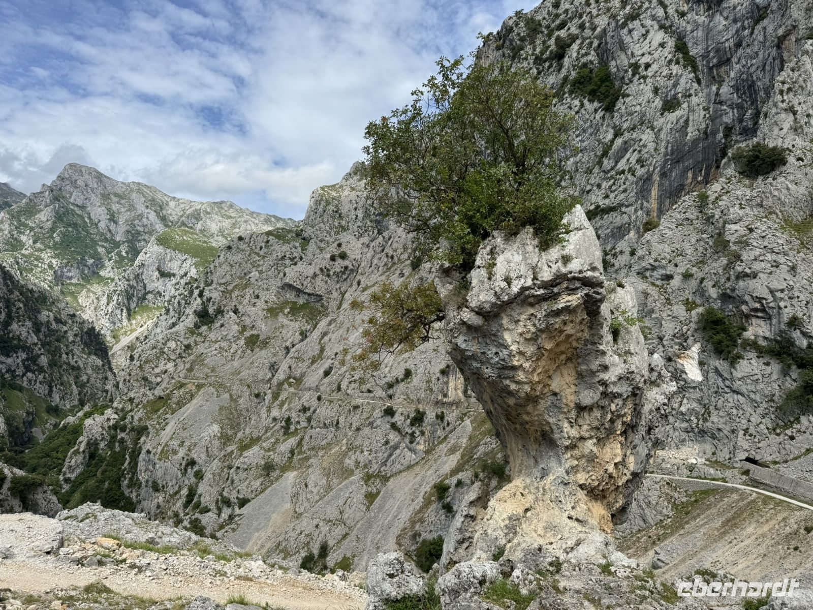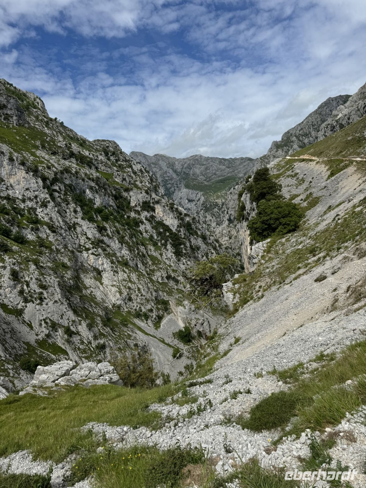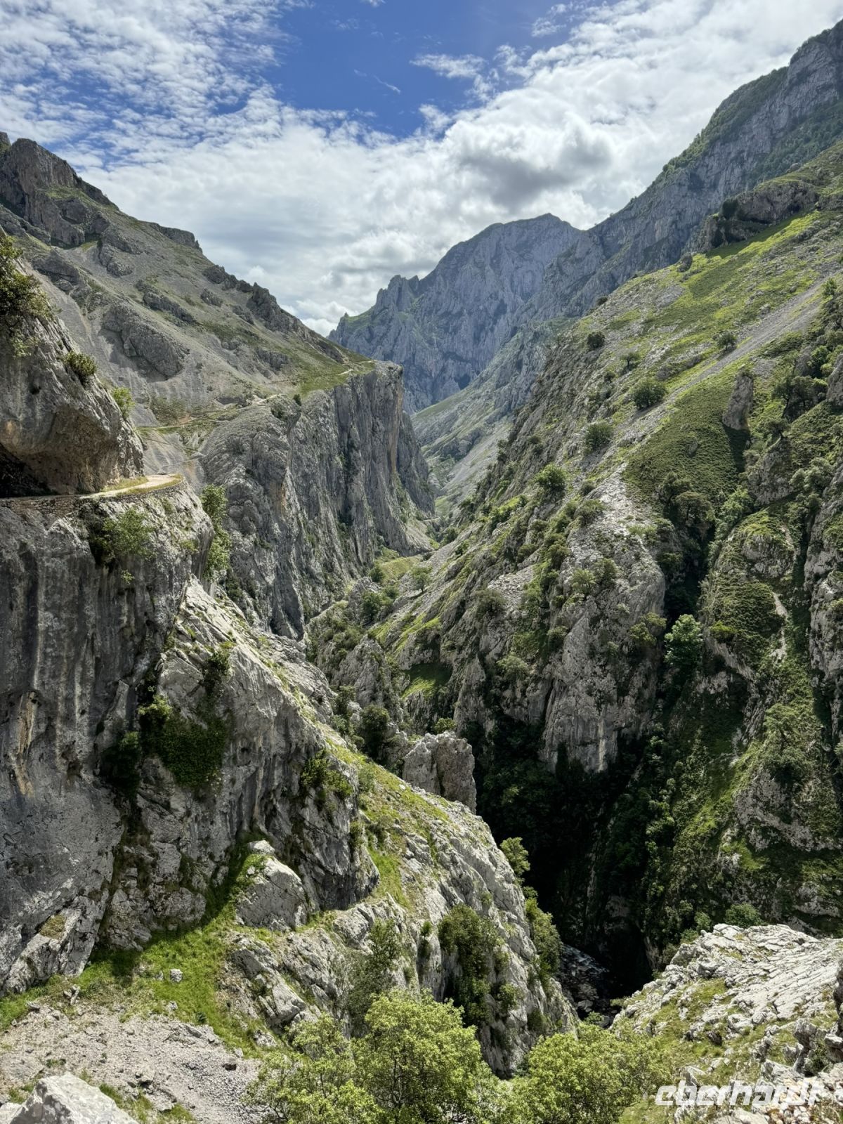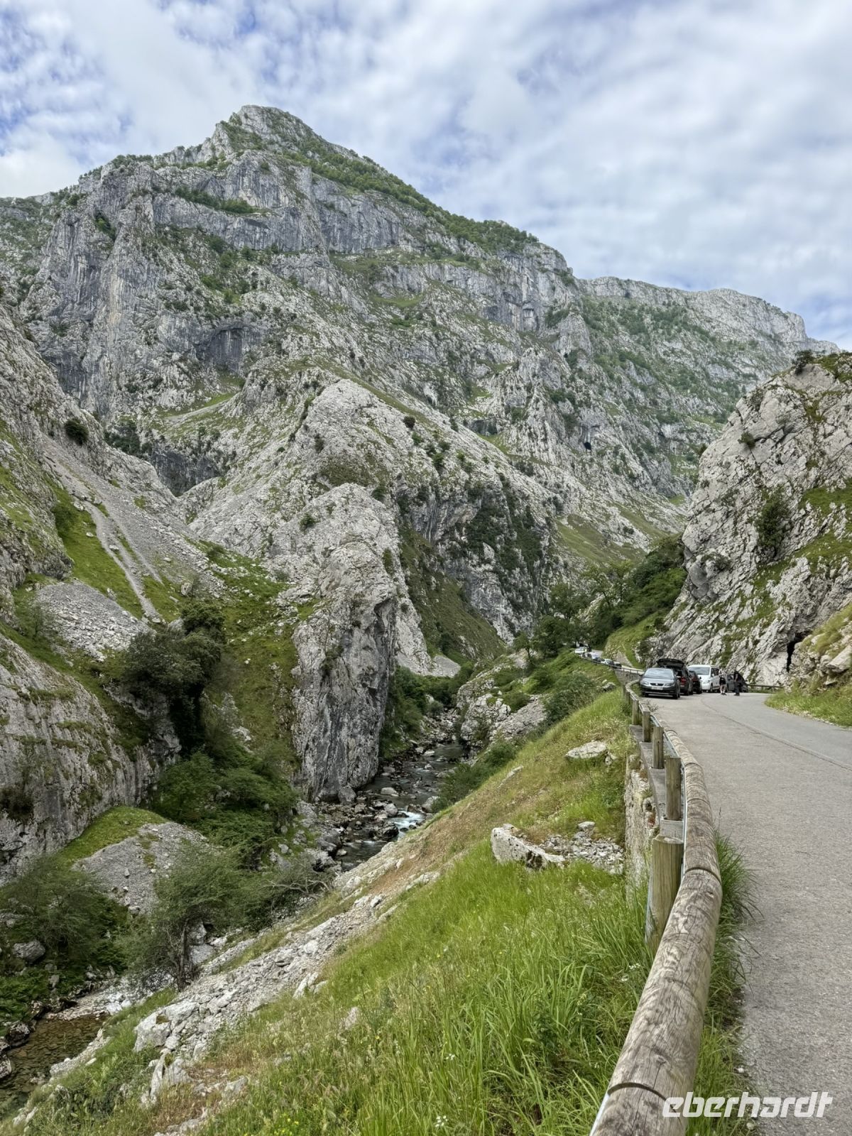 Oben angekommen, bekamen wir herrliche Ausblicke auf die Schlucht und den imposanten Nationalpark Picos de Europa, sowie auf die verschiedenen Gipfel zu Gesicht. Ab diesem Punkt steigerte sich unser Tempo leicht und jede Kurve brachte eine neue Überraschung mit sich, wie die netten Ziegen, welche uns begrüßt haben.