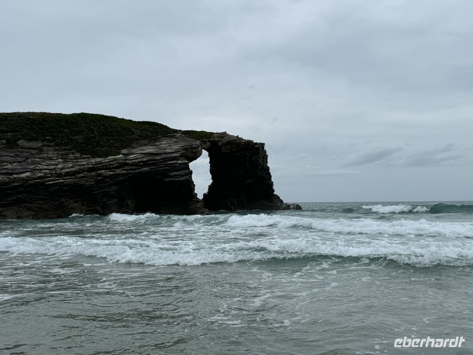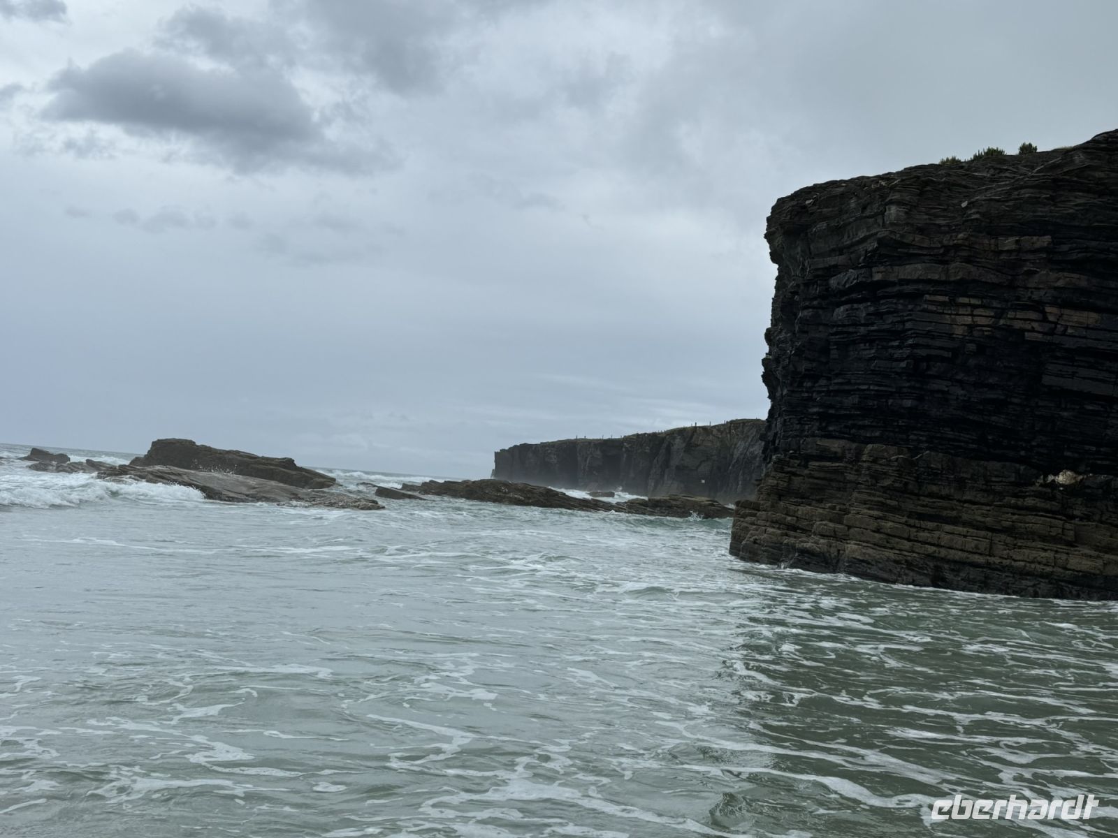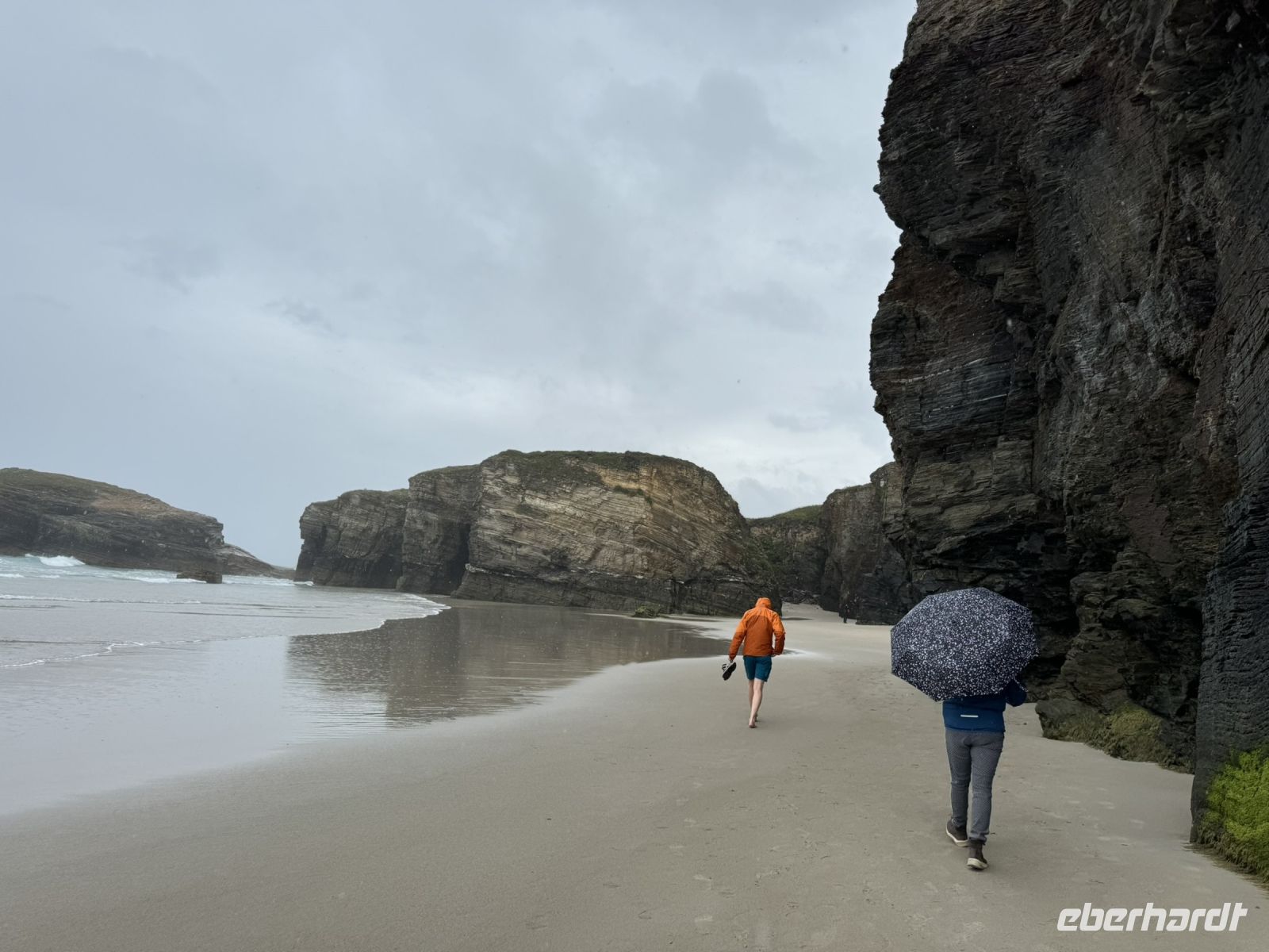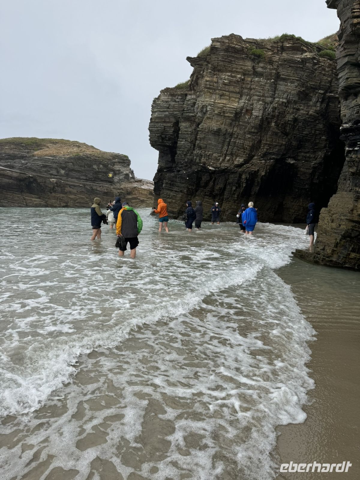 In Ribadeo angekommen besuchten wir zuerst den berühmten Kathedralenstrand! Obwohl wir bei Ebbe ankamen, war das Wasser wegen des Regens und der Wellen immer noch etwas zu hoch. Wir sind trotzdem an den Strand gegangen und etwas nass geworden, aber das gehört zu einem Abenteuer dazu. Außerdem hatten wir am Strand sehr viel Spaß.