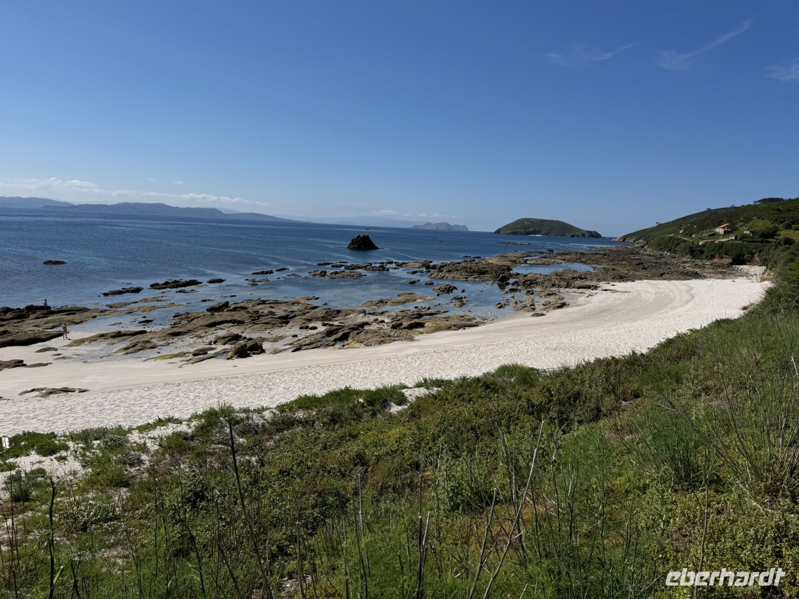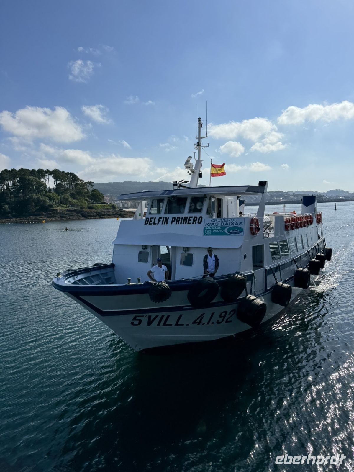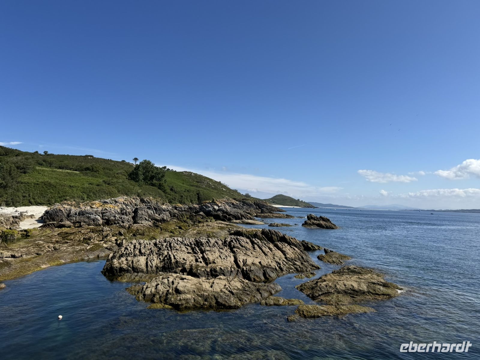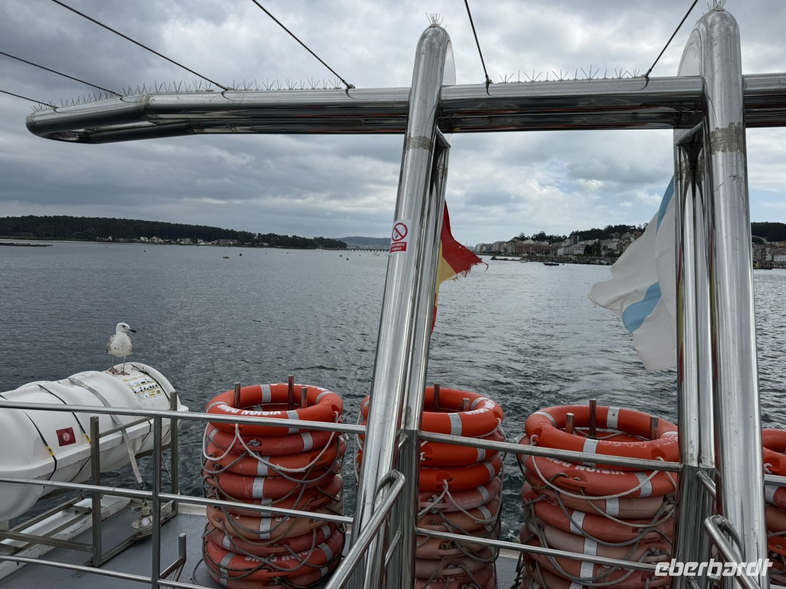 Bei strahlendem Sonnenschein fuhren wir nach Portonovo und stiegen in unser Boot zur Insel Ons, die direkt im Archipel der Atlantischen Inseln liegt. Wir überquerten Teil der Ria von Pontevedra, begleitet vom Gesang der Kinder, die mit uns auf dem Schiff waren, und erreichten langsam die Insel Ons.