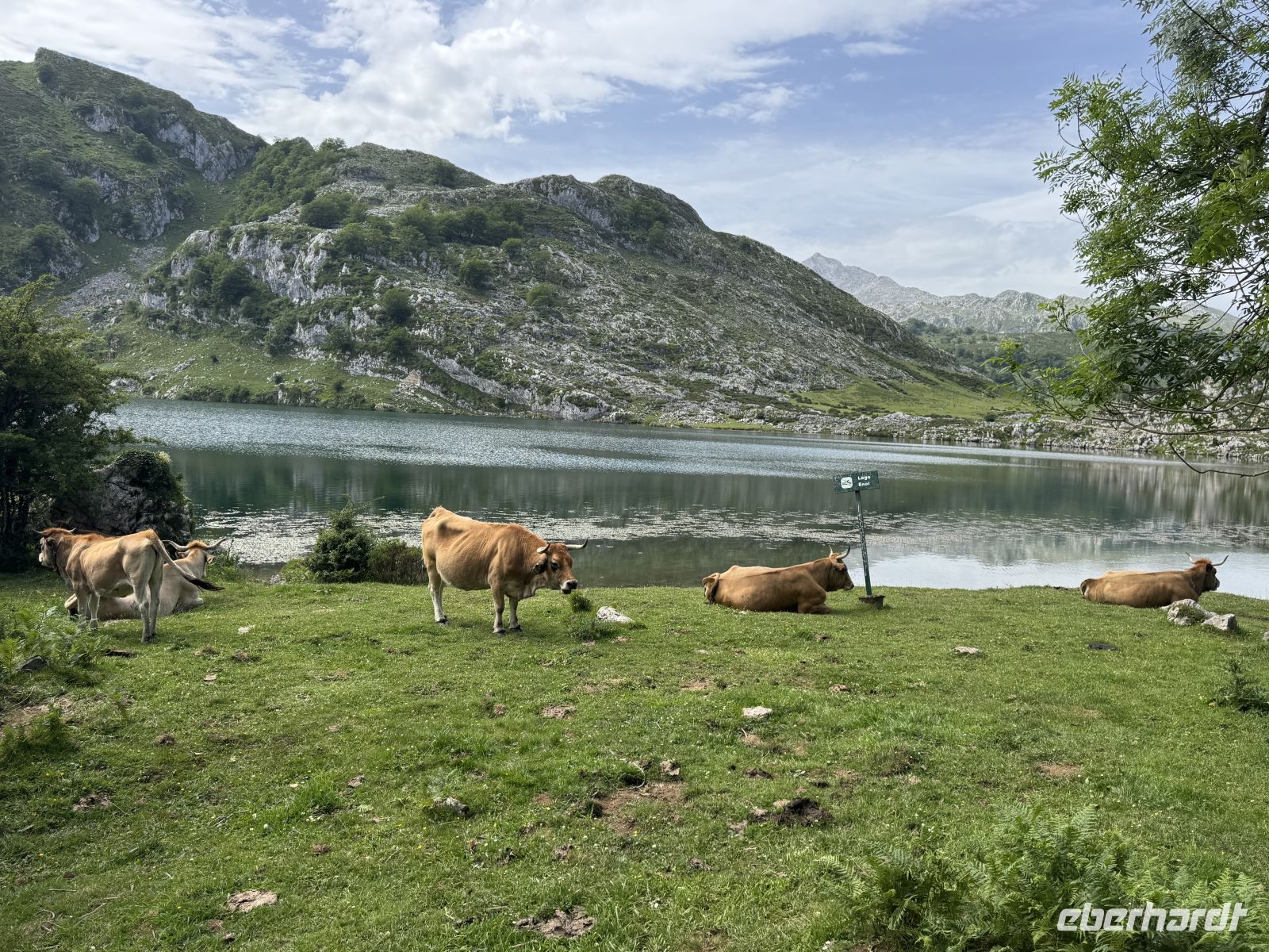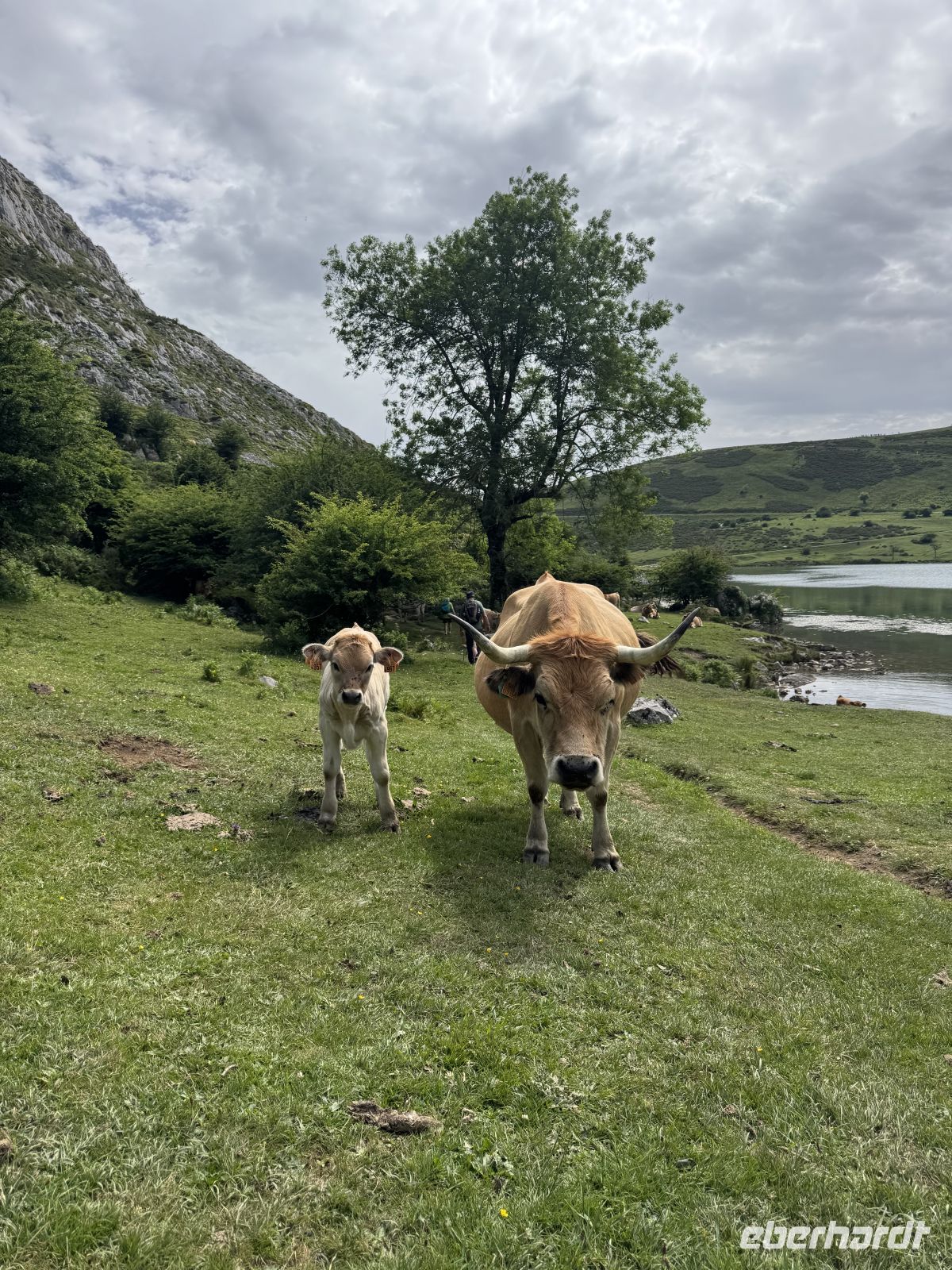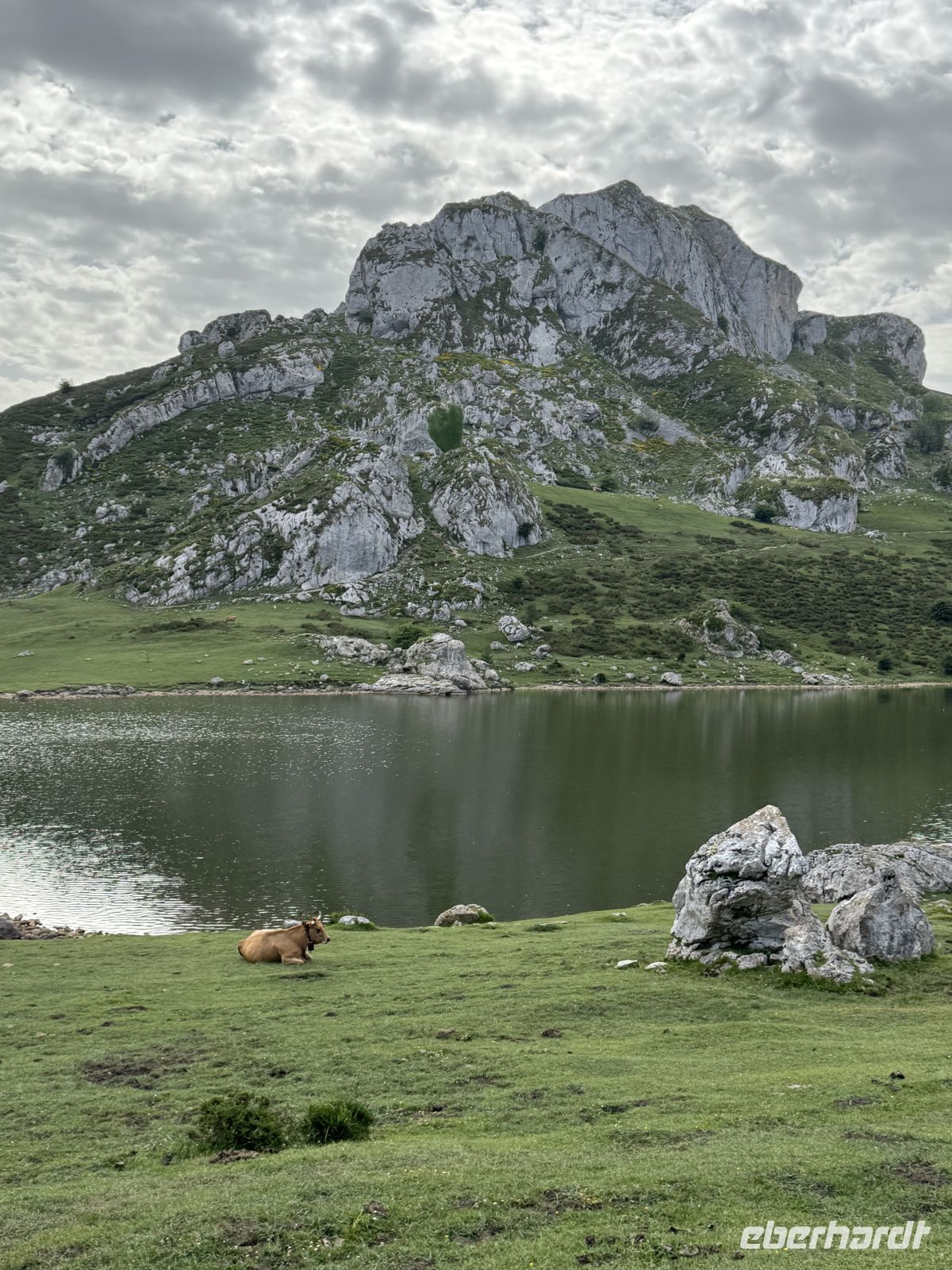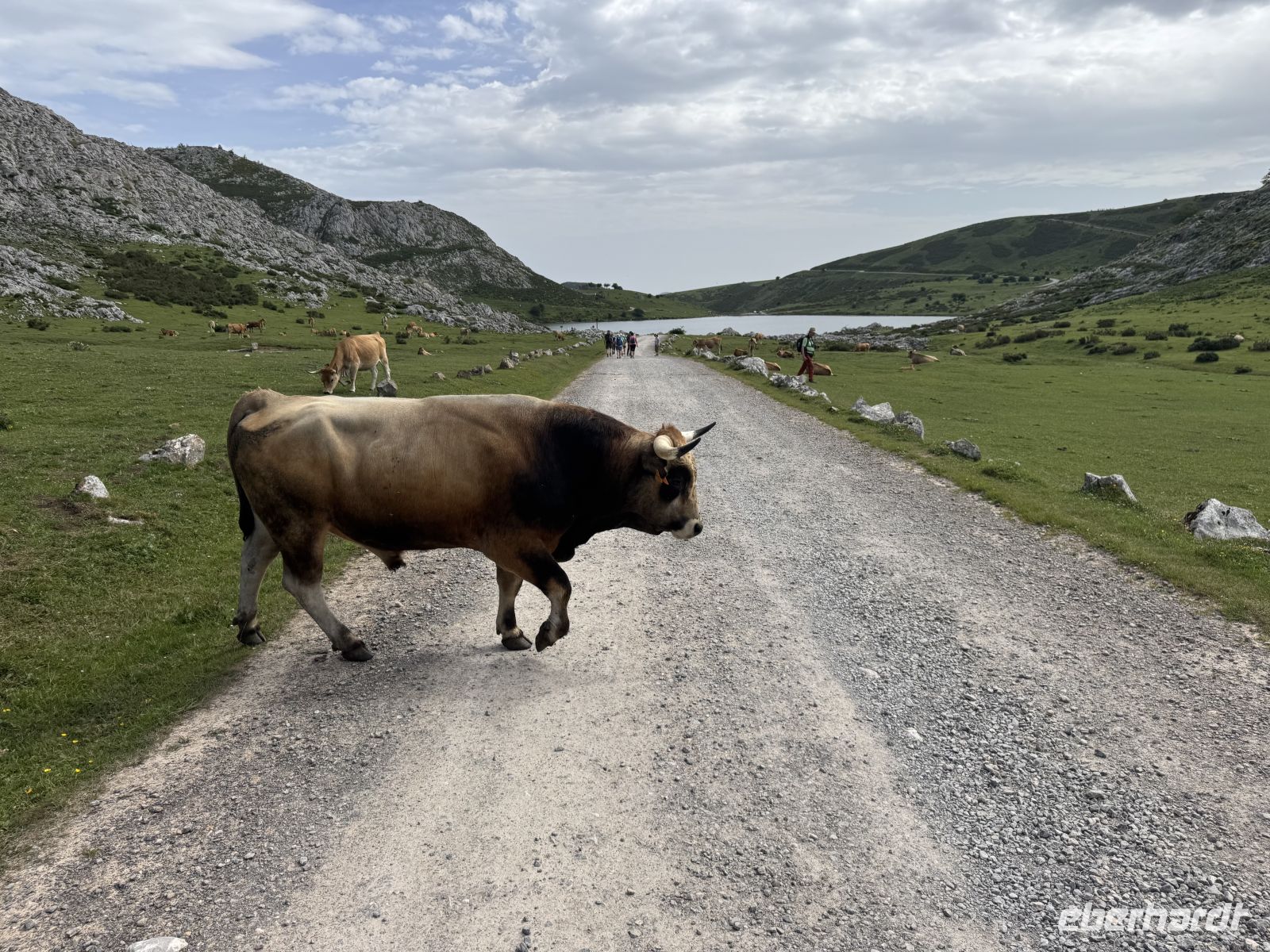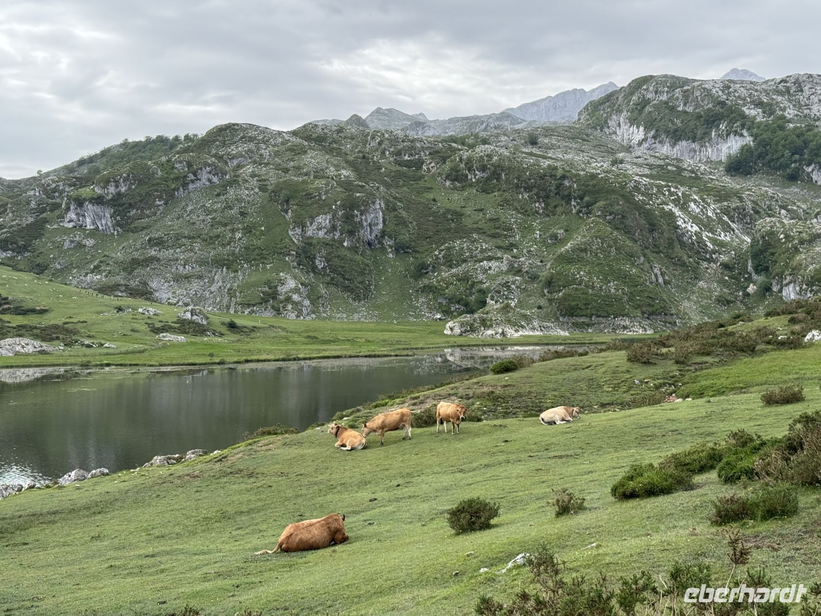 Unsere Route führte durch ein altes Bergbaugebiet, wo früher 500 Bergleute Mangan, Eisen und Quecksilber abbauten. Über grüne Wiesen erreichten wir den Ercina-See – einen der drei ehemaligen Gletscherseen von Covadonga. Ganz ruhig wanderten wir zwischen Steinen und Kühen weiter bis zum Enol-See, dem Ende unserer Route.
