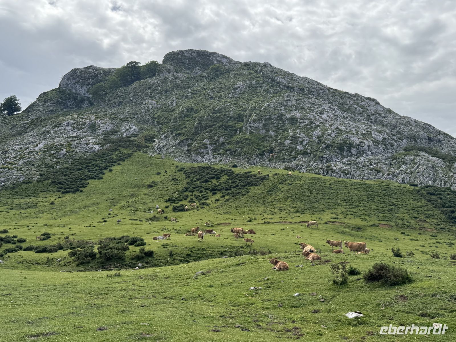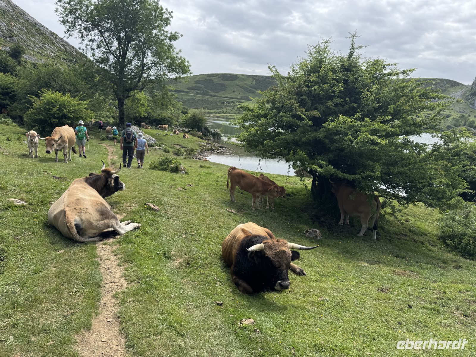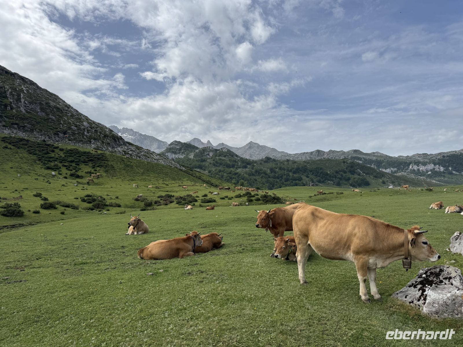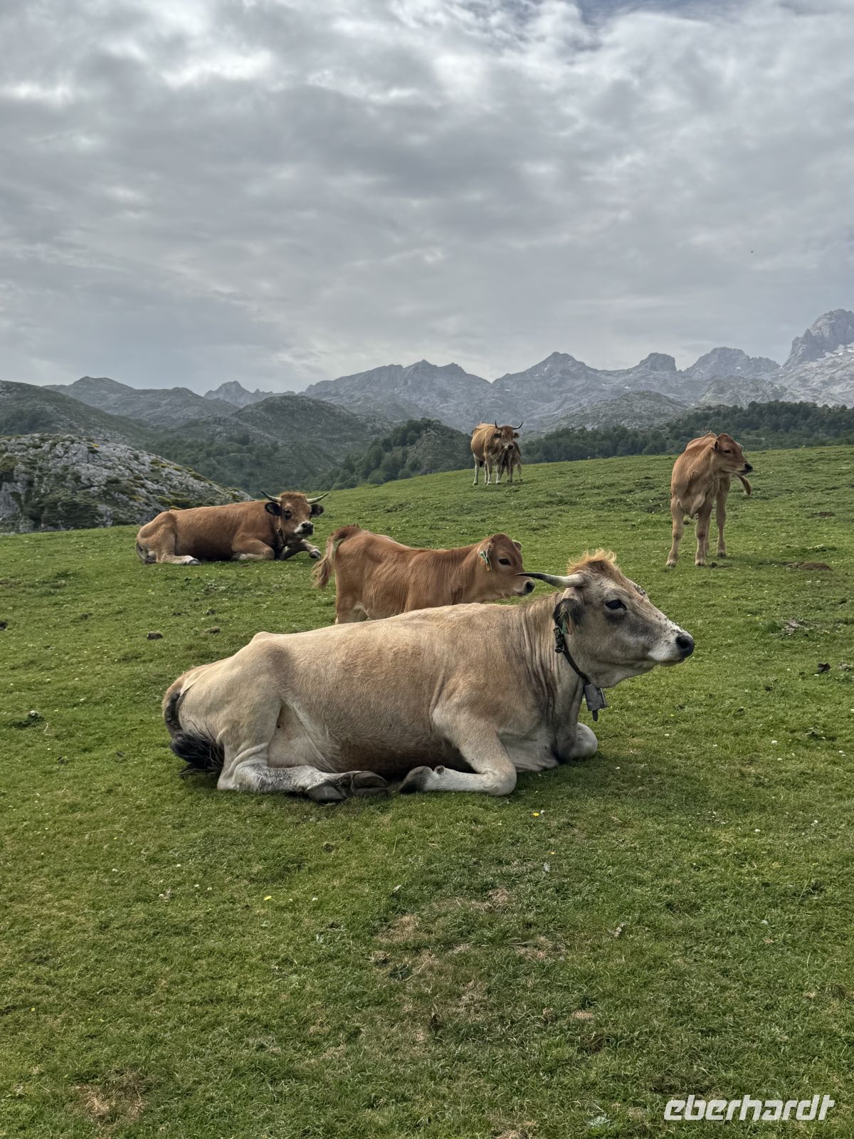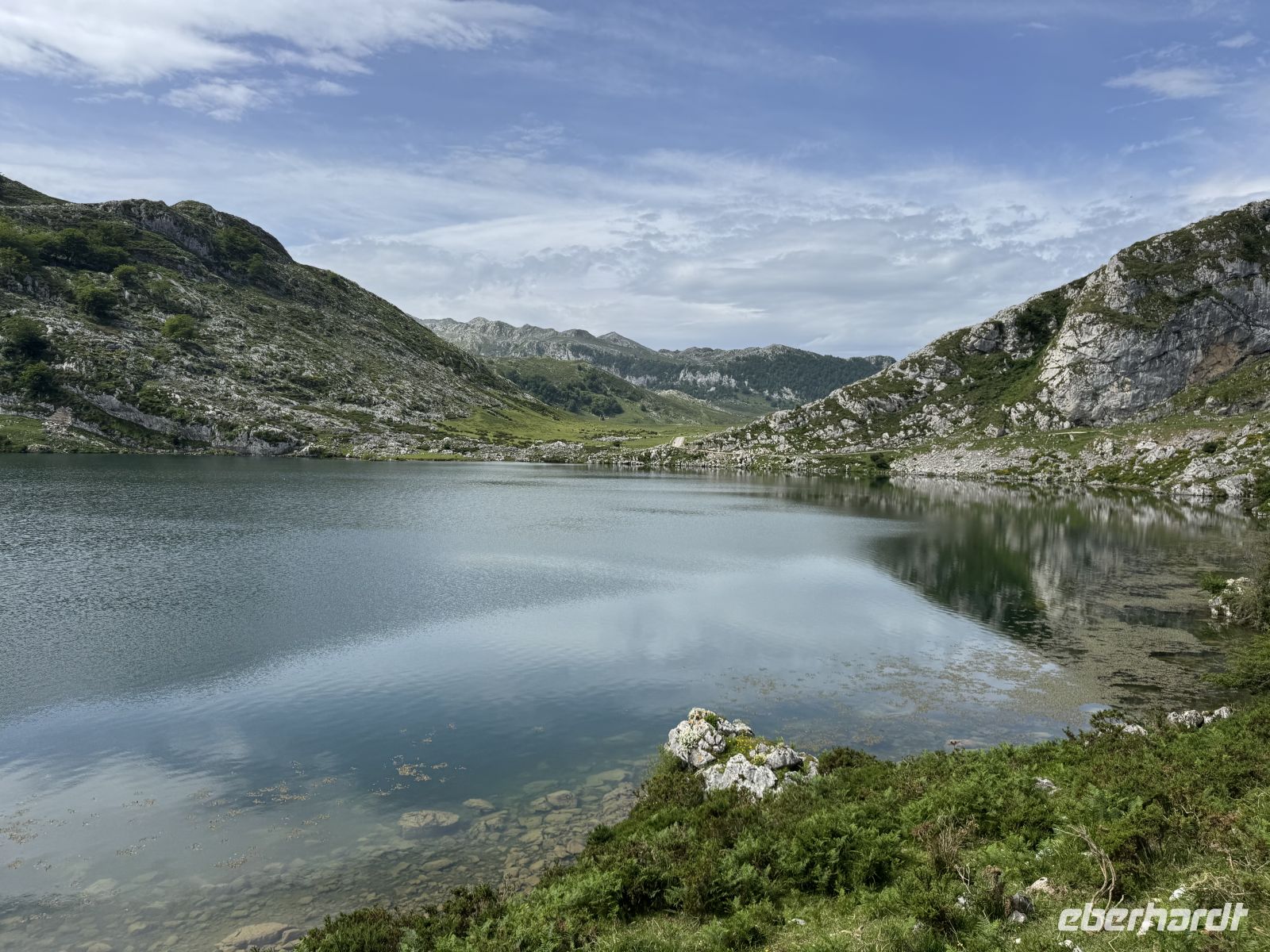 Unsere Route führte durch ein altes Bergbaugebiet, wo früher 500 Bergleute Mangan, Eisen und Quecksilber abbauten. Über grüne Wiesen erreichten wir den Ercina-See – einen der drei ehemaligen Gletscherseen von Covadonga. Ganz ruhig wanderten wir zwischen Steinen und Kühen weiter bis zum Enol-See, dem Ende unserer Route.