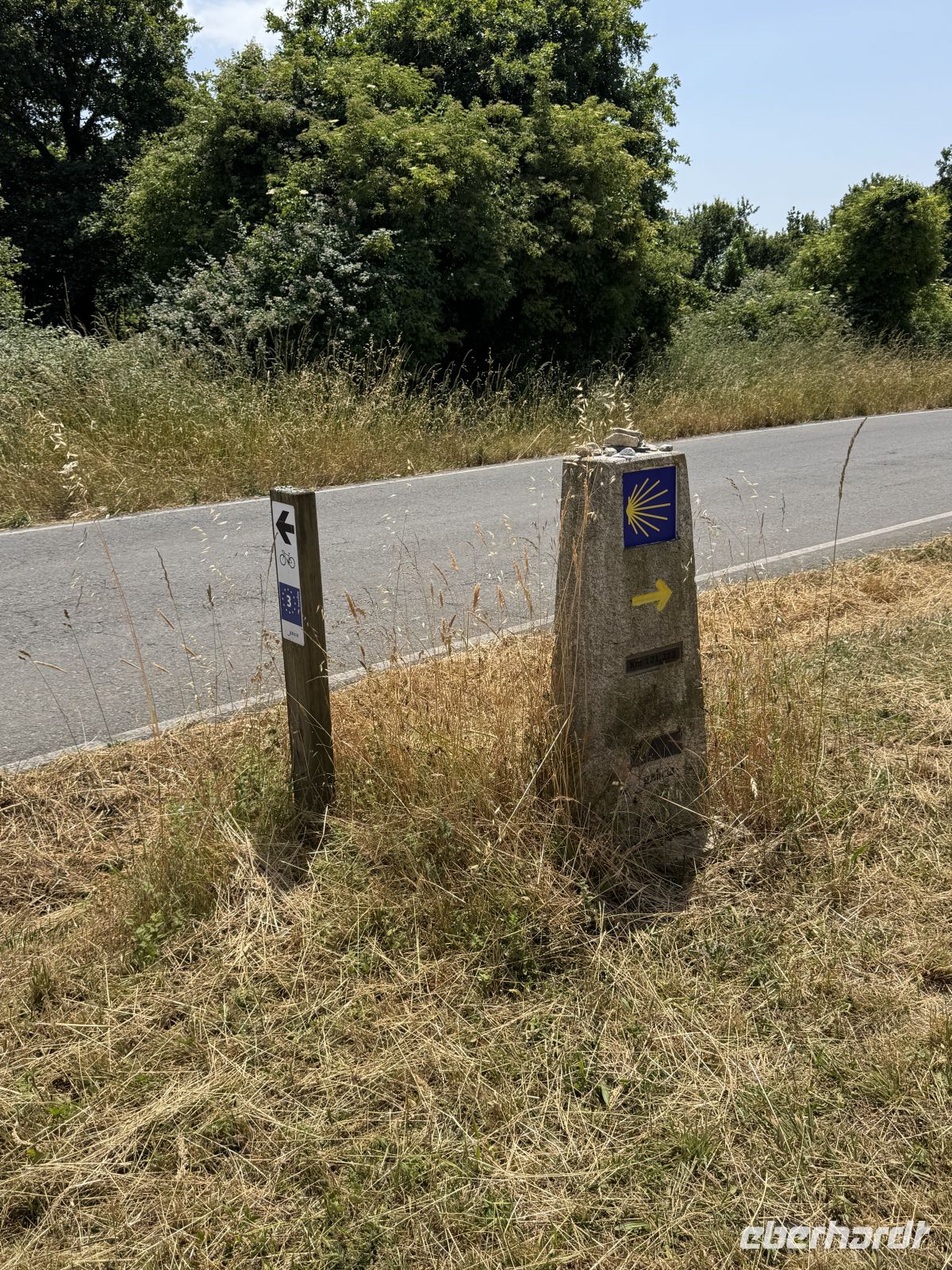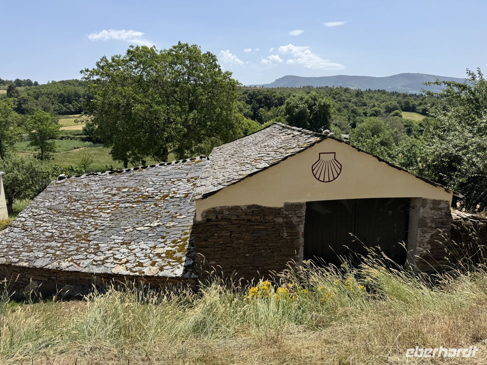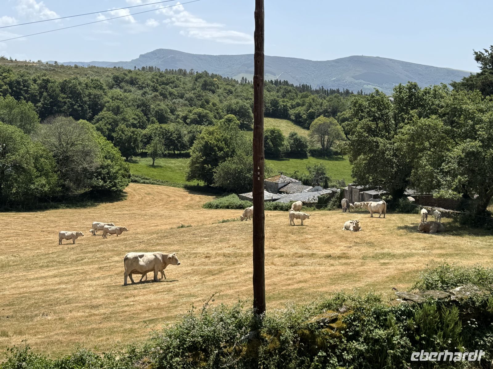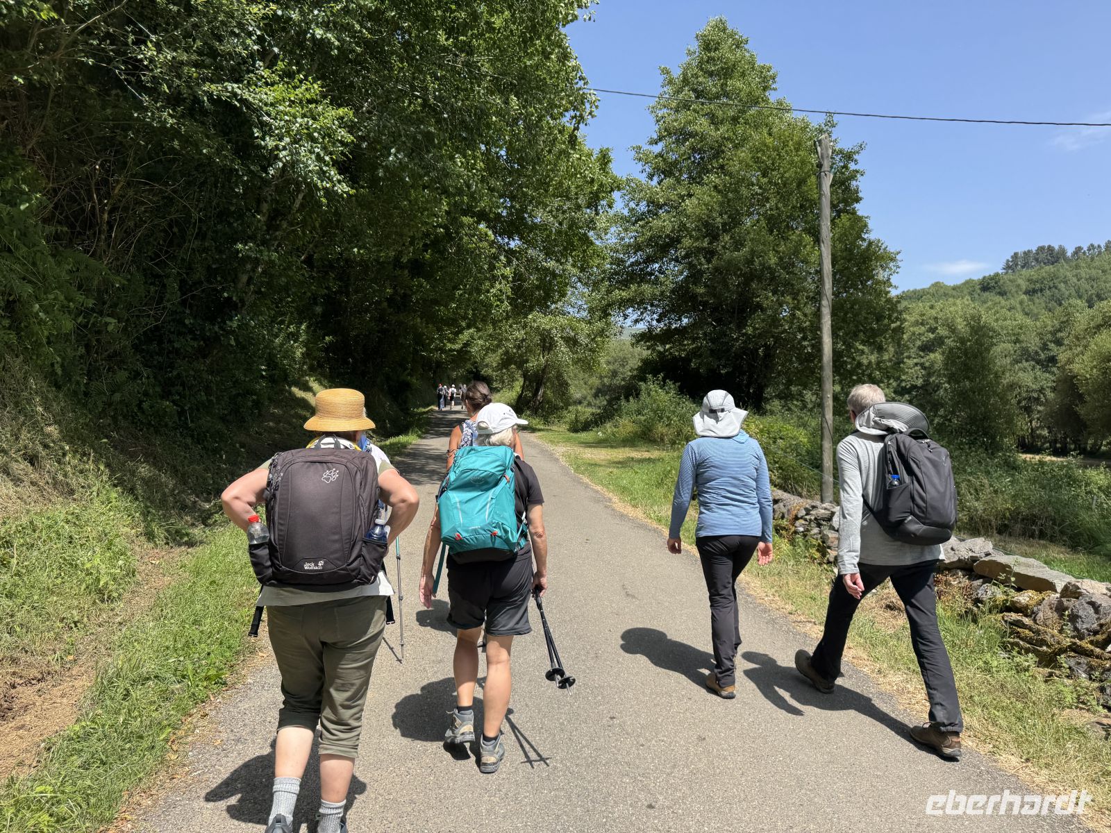 Wir starteten bei warmen Temperaturen und etwas spät – die Pilger beginnen ja normalerweise sehr früh. Die ersten 7 km führten uns über kleine Dörfer und durch Wälder bis auf 900 m Höhe. Dann ging es bergab durch weitere Dörfer, in denen wir wieder ein bisschen Zivilisation fanden.