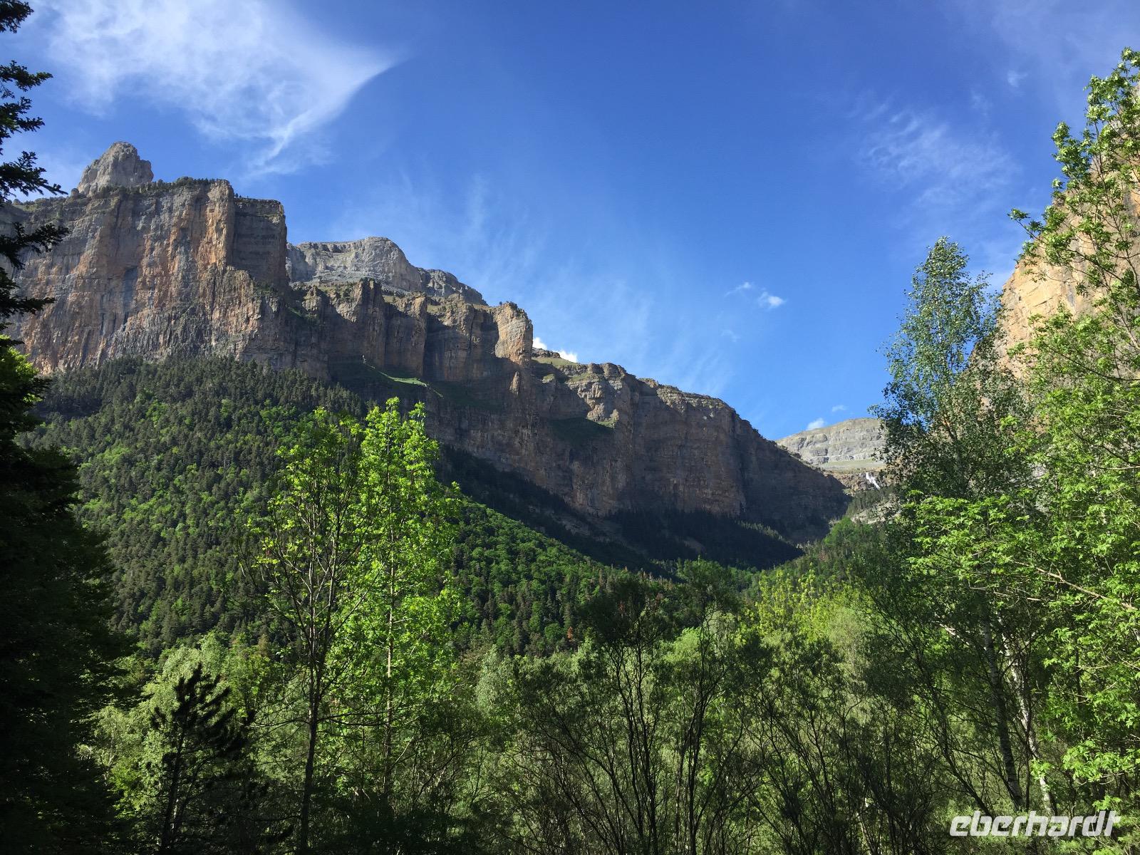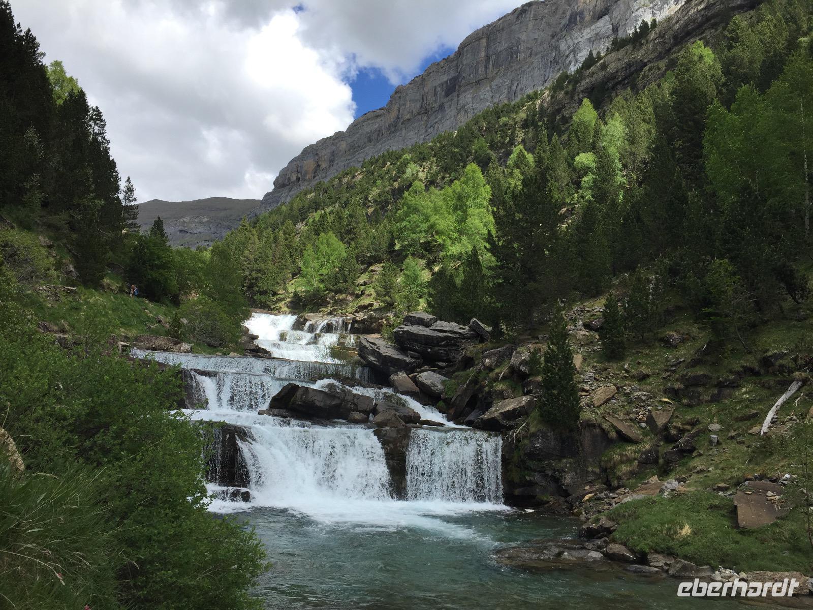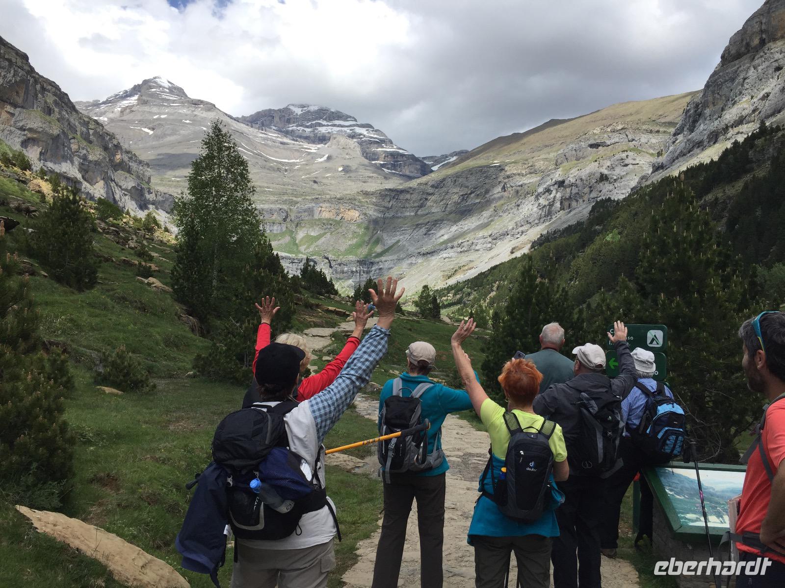 Durch den Nationalpark Ordesa führte der in Geologie, Geschichte, Flora und Fauna bestens bewanderte ortskundige Führer Eduard, erst Bergauf zu den kristallklaren Wasserfällen vorbei an Edelweiß und fleischfressenden Pflanzen bis hin zum Bergmassiv des Monte Perdido und danach auf der anderen Seite des Tales wieder bergab. Mit genügend Pausen, einem angemessenen Tempo und viel Enthusiasmus brachten wir es am Ende des Nachmittags auf 16 gewanderte Kilometer.