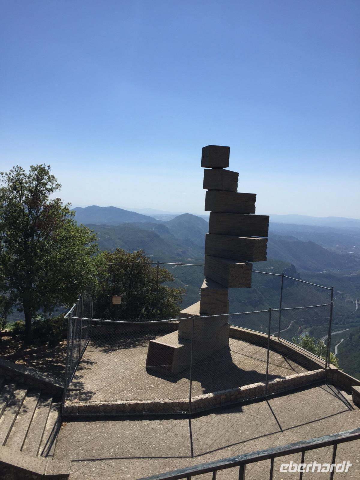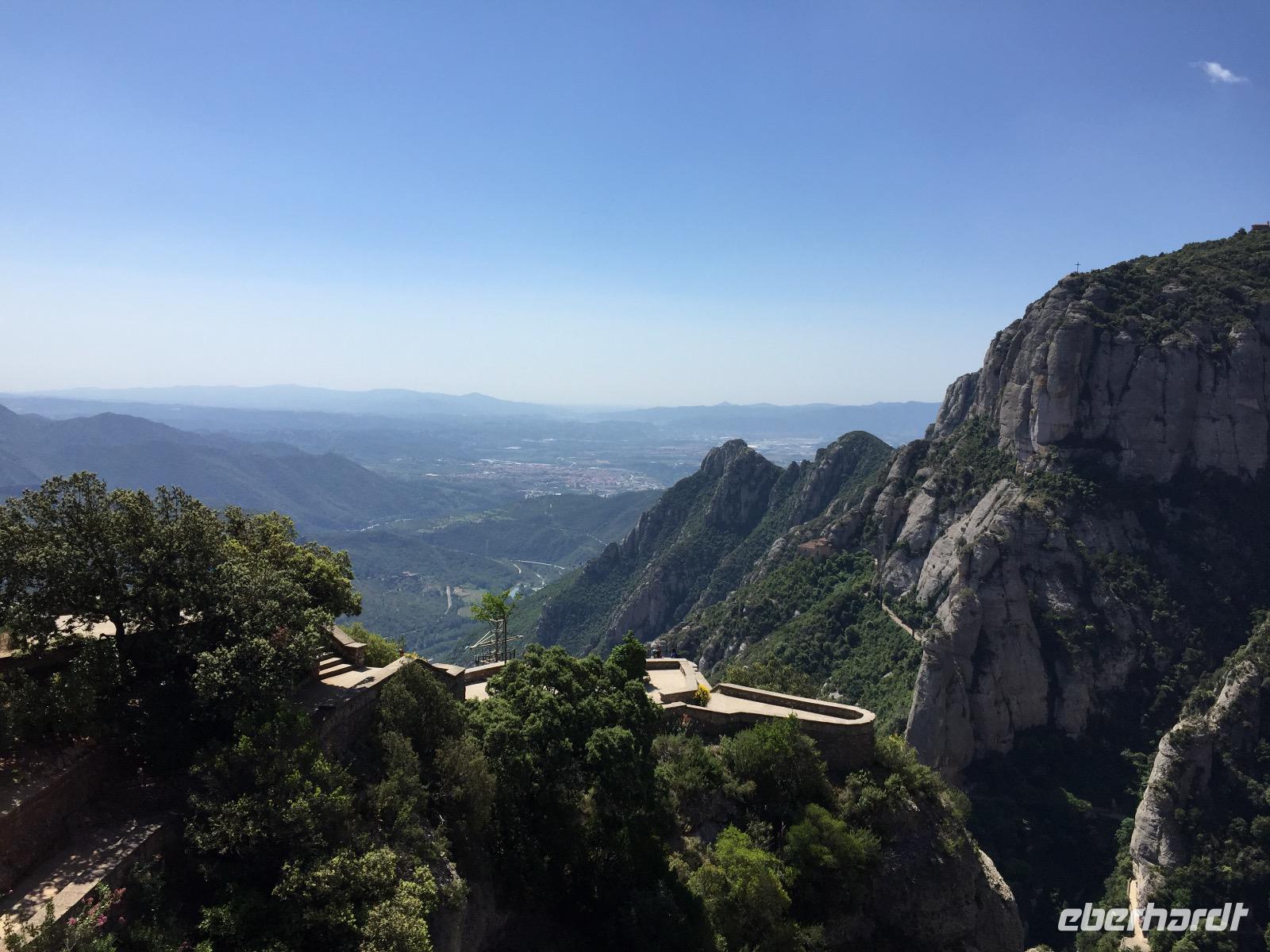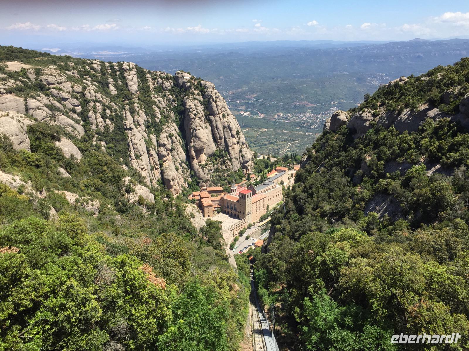Mit dem bequemen Kleinbus reisten wir weiter, schlängelten uns die Serpentinen zum Kloster Montserrat hinauf. Diese Wallfahrtsstätte Unserer Lieben Frau von Montserrat schaut auf eine lange Historie. Sie geht auf die Einsiedelei Santa Maria zurück, die Graf Guifré el Pelós im Jahr 888 dem Kloster von Ripoll schenkte. Das Kloster entwickelte sich im Laufe der Jahrhunderte in ein kulturelles Zentrum und brachte u.a. eine Musikschule hervor, welche bereits im 14. Jhd. in Dokumenten erwähnt wird und heute noch besteht. Der dazugehörige berühmte Knabenchor "Escalonía de Monteserrat" singt fast jeden Tag um 13 Uhr das "Virolai", einen Lobgesang auf die Muttergottes von Montserrat. Gern wollten wir dem Gesang lauschen, jedoch warteten mehrere hundert Menschen ebenfalls darauf. Wir nahmen deshalb lieber die Standseilbahn "Funicular de Sant Joan" in Richtung Gipfel auf eine Höhe von 1000 m. Während einer kurzen Wanderung genossen wir den spektakulären Blick auf das Hinterland von Barcelona sowie auf den gesamten Klosterkomplex der Heiligen Jungfrau, die seit 1881 Schutzpatronin von Katalonien ist.