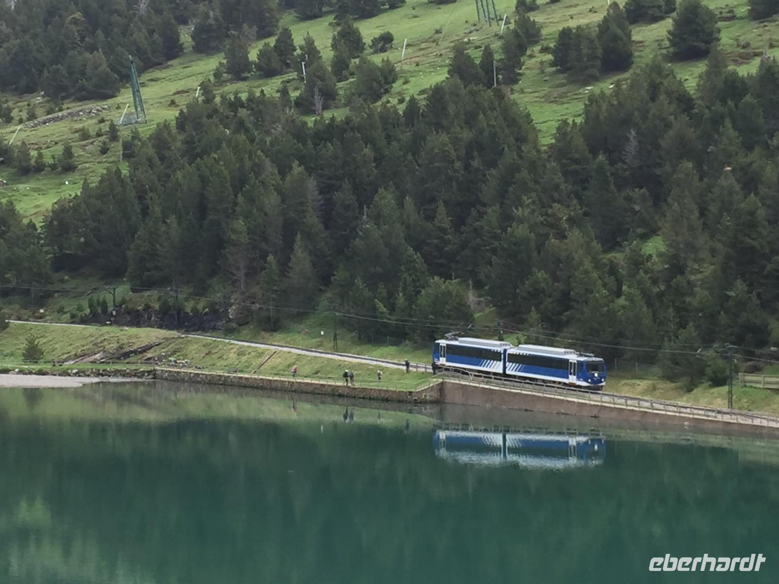 Am Nachmittag wechselten wir das Transportmittel und stiegen vom Bus in die Cremallera, in die seit 1931 existierende Zahnradbahn um. 1059 Höhenmeter überwanden wir so spielend leicht, genossen die ca. 12 km lange Fahrt hinauf ins Tal der Träume. Staunend schauten wir nach der Ausfahrt aus einem Tunnel auf das sich bietende Panorama: unser heutiges Ziel: "El Santuario de Nuria", malerisch an einem aufgestautem See gelegen. Bei so viel Schönheit verpassten wir beinahe das Aussteigen.