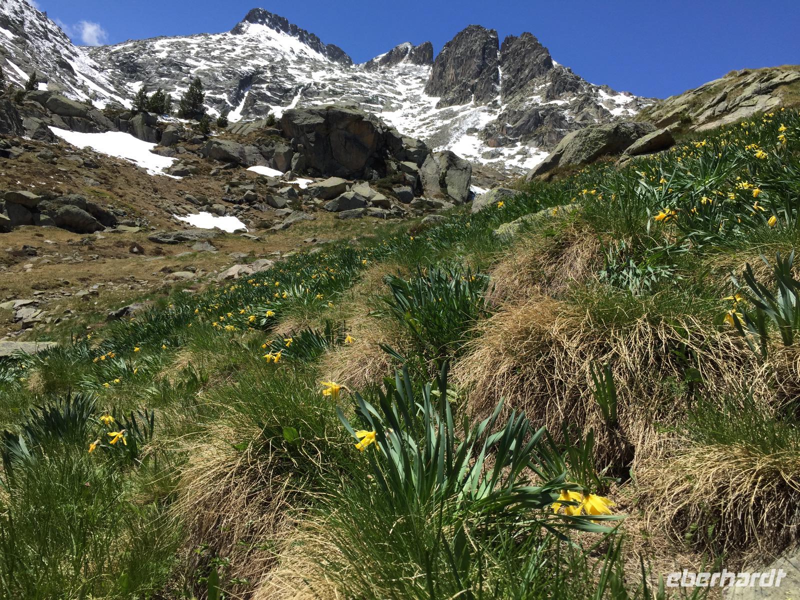 Aber dieser Tag wurde für einige Gäste das bisherige Highlight der Reise. Eine nur 6 km lange, aber anspruchsvollere Wanderung mit ständigem bergauf und bergab, die jedoch immer Zeit lies, die beeindruckende Bergwelt der Pyrenäen in sich aufzunehmen. Panoramabilder, Bergmassive, dunkelblaue oder türkis-grünlich schimmernde Seen, über Schneefelder laufend, an riesigen Gesteinsbrocken vorbei, die wilden Narzissen bestaunend oder den Enzian fotografierend - hinter jeder Biegung erwartete uns etwas anders Faszinierendes.
