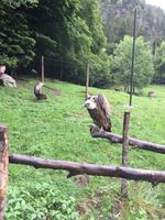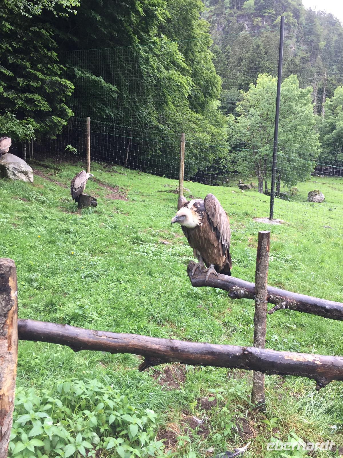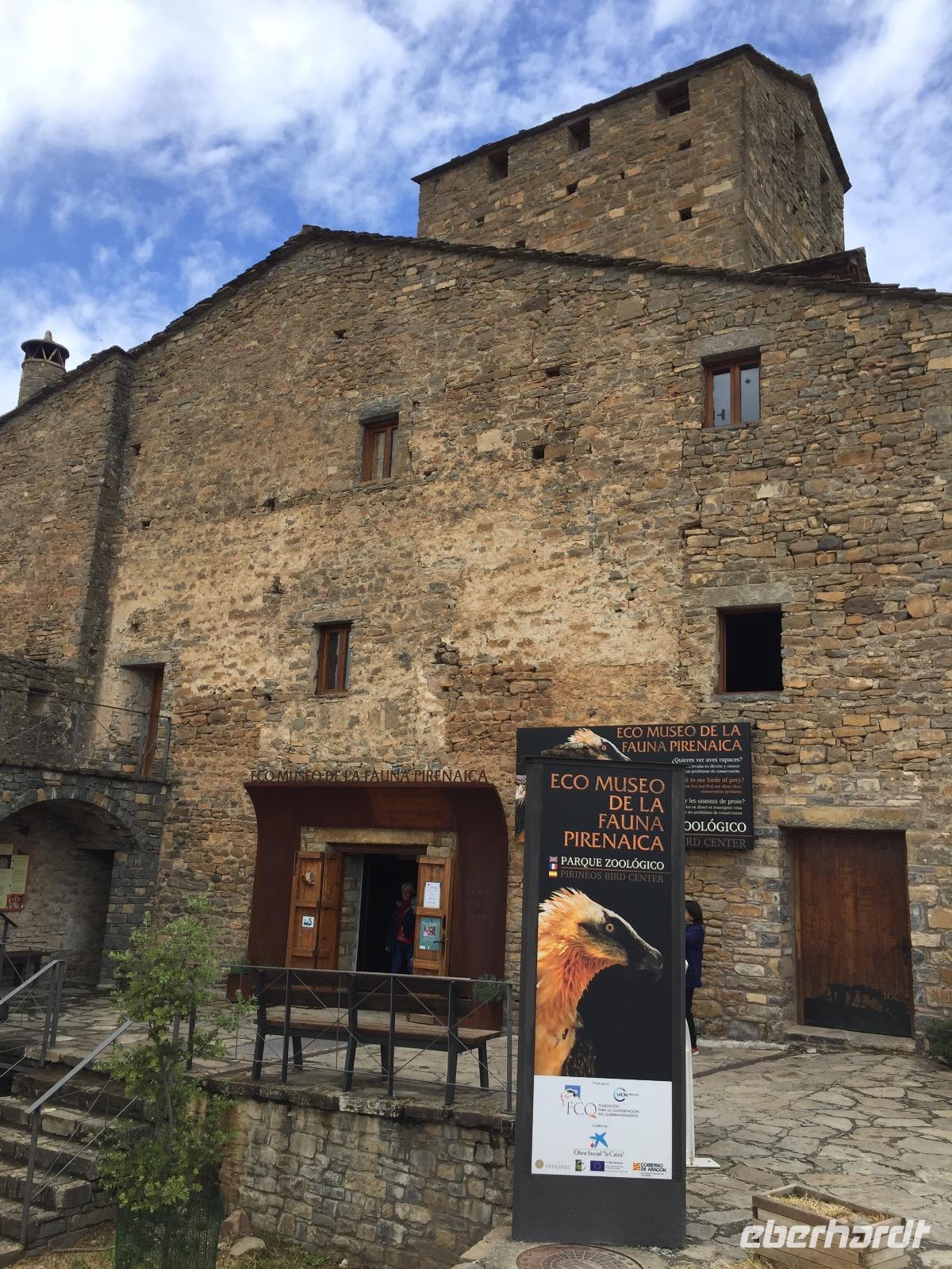 Nach einem entspanntem Frühstück ging es am darauffolgenden Tag weiter, vorbei an kleinen Bergdörfern, fast alle mit einer im romanischen Stil gebauten Kirche, Rinder- und Schafherden bis zum Dorf Aínsa mit seinem Ecomuseum und einer ornithologischen Tierauffangstation, vorrangig für kranke oder verletzte Geier gedacht. Hier erhielten wir einen tieferen Einblick in die Biodiversität der Pyrenäen. Was vorher sehr abstrakt erschien, erhielt hier plötzlich ein Gesicht. Das Modell eines fliegenden Bartgeiers und das an Malaria erkrankte echte Exemplar dieser Geierart, zeigte diese majestätischen Tiere in ihrer immensen Grösse aus nächster Nähe und sensibilisierte gleichzeitig für das Thema des Artensterbens auch hier in den Pyrenäen.