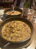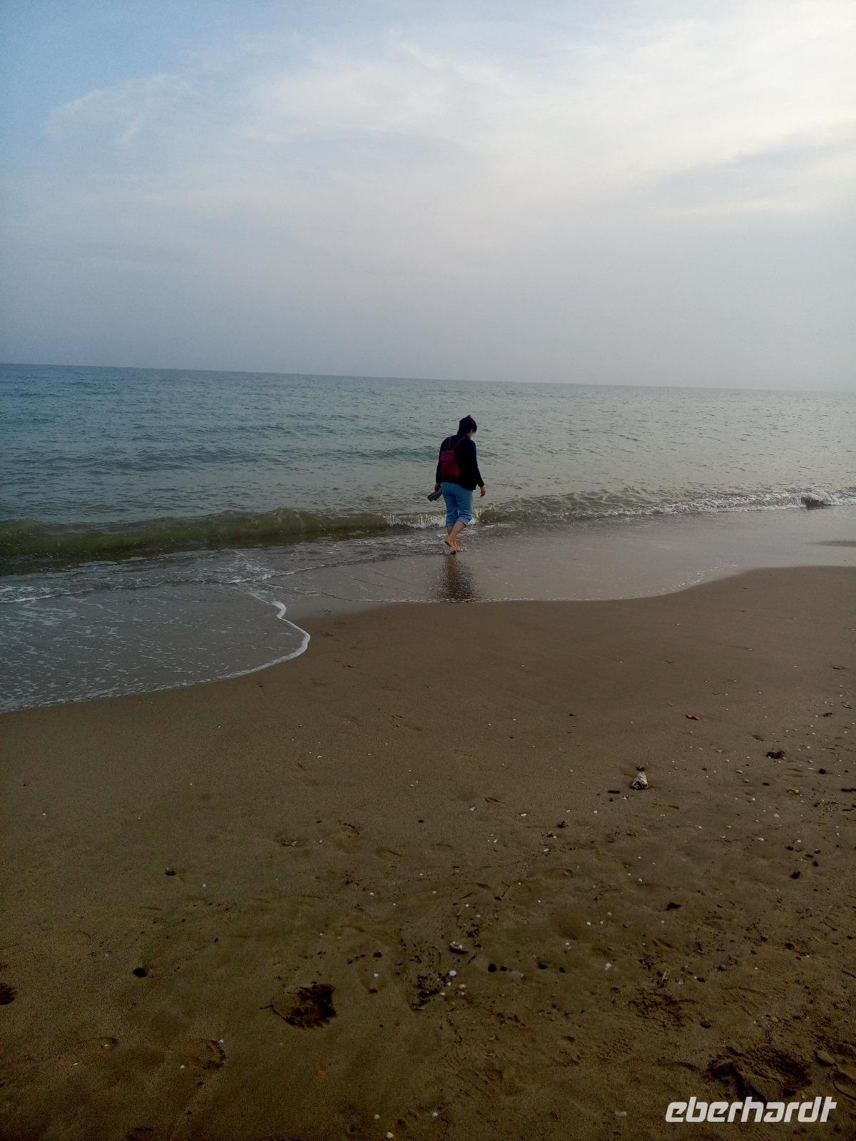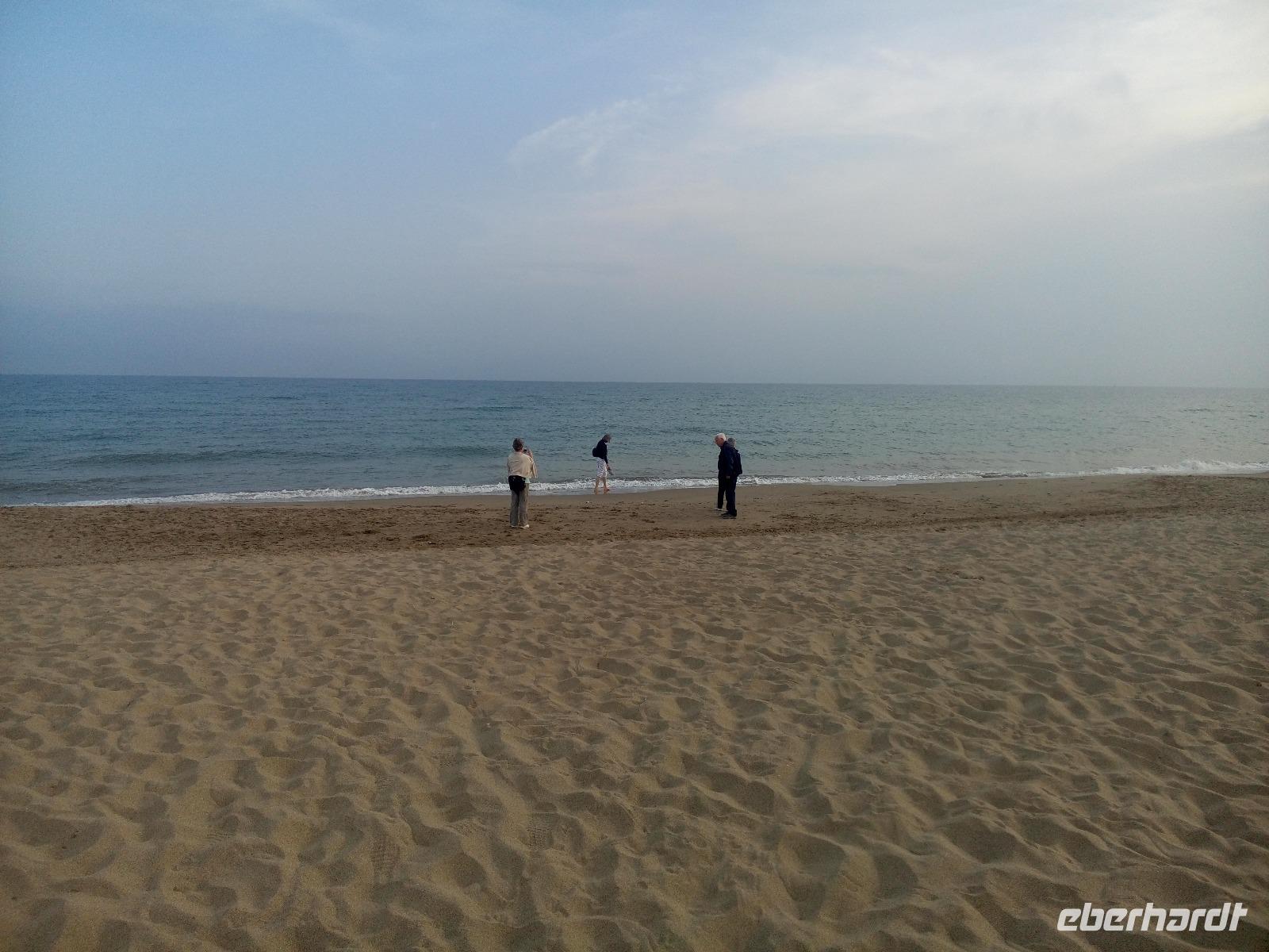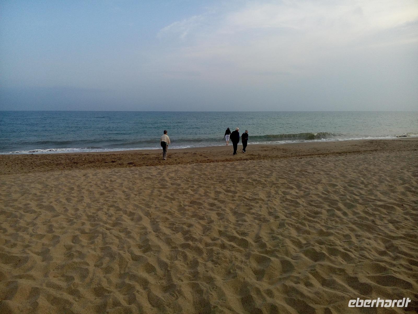 Nach der Verkostung schlug Yan uns vor, die Serpentinenstrasse von Sitges nach Castelldefels zu fahren. Mit unserem kleinen Bus war es möglich! In Castelldefels haben wir uns von dem Busfahrer Yan verabschiedet. Wir haben uns für einen weiteren Spaziergang am Strand und ein Essen außerhalb von Barcelona entschieden. Das Wasser war mit 18 Grad schon sehr warm für diese Zeit. Einige aus unserer Gruppe sind sogar ins Wasser gegangen. Unser heutiger Abend war in einem Restaurant aus Galizien. Als wir mit dem ersten Gang fertig waren, haben wir gedacht, es sei alles. Aber es war nur ein Anfang: Lobster, schwarzer Reis, Dorada, zarter Rindfleisch, cremiger Reis mit Hummer haben auf uns gewartet. An diesem Abend haben wir nicht mal mehr den Kaffee und Kuchen geschafft.
