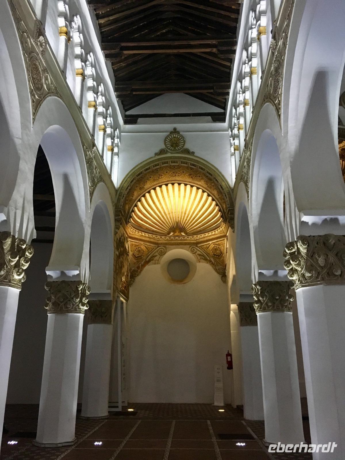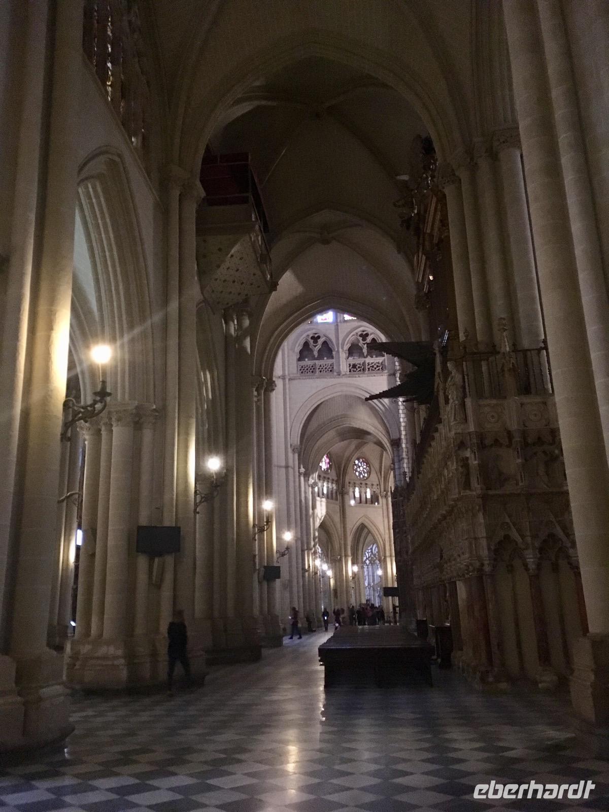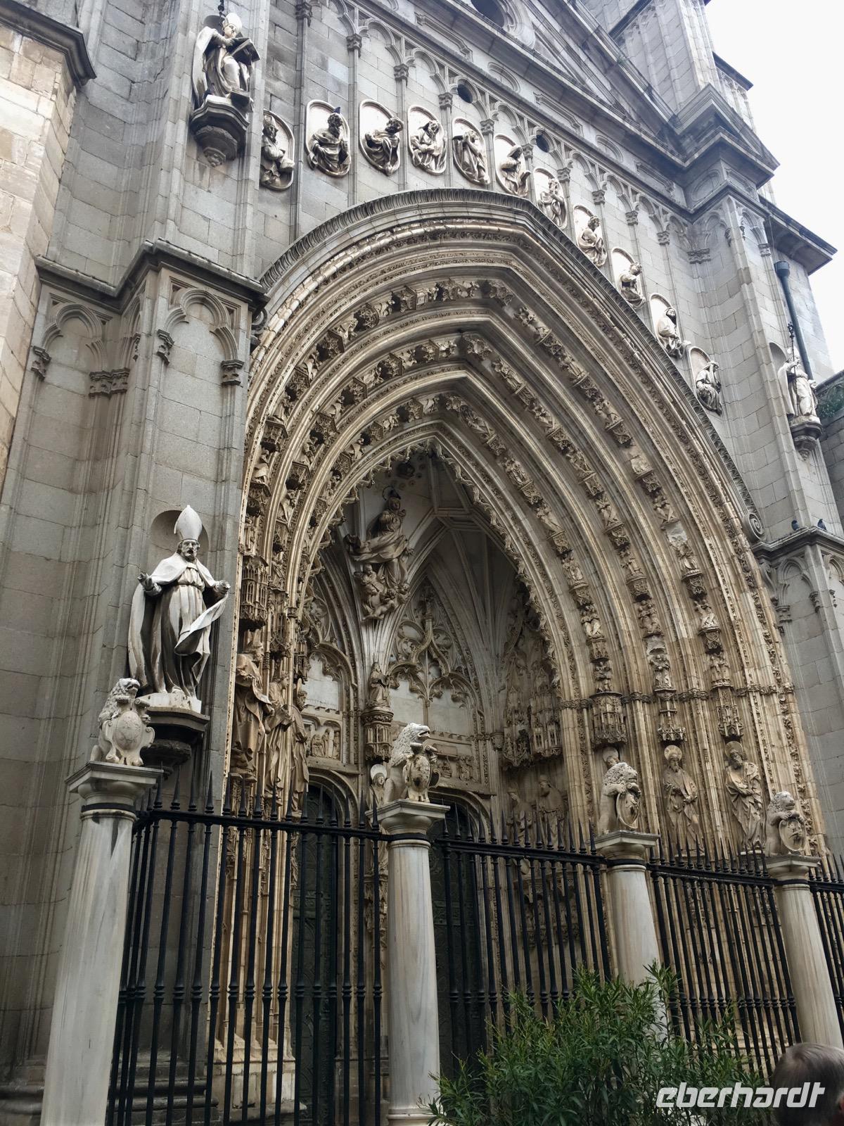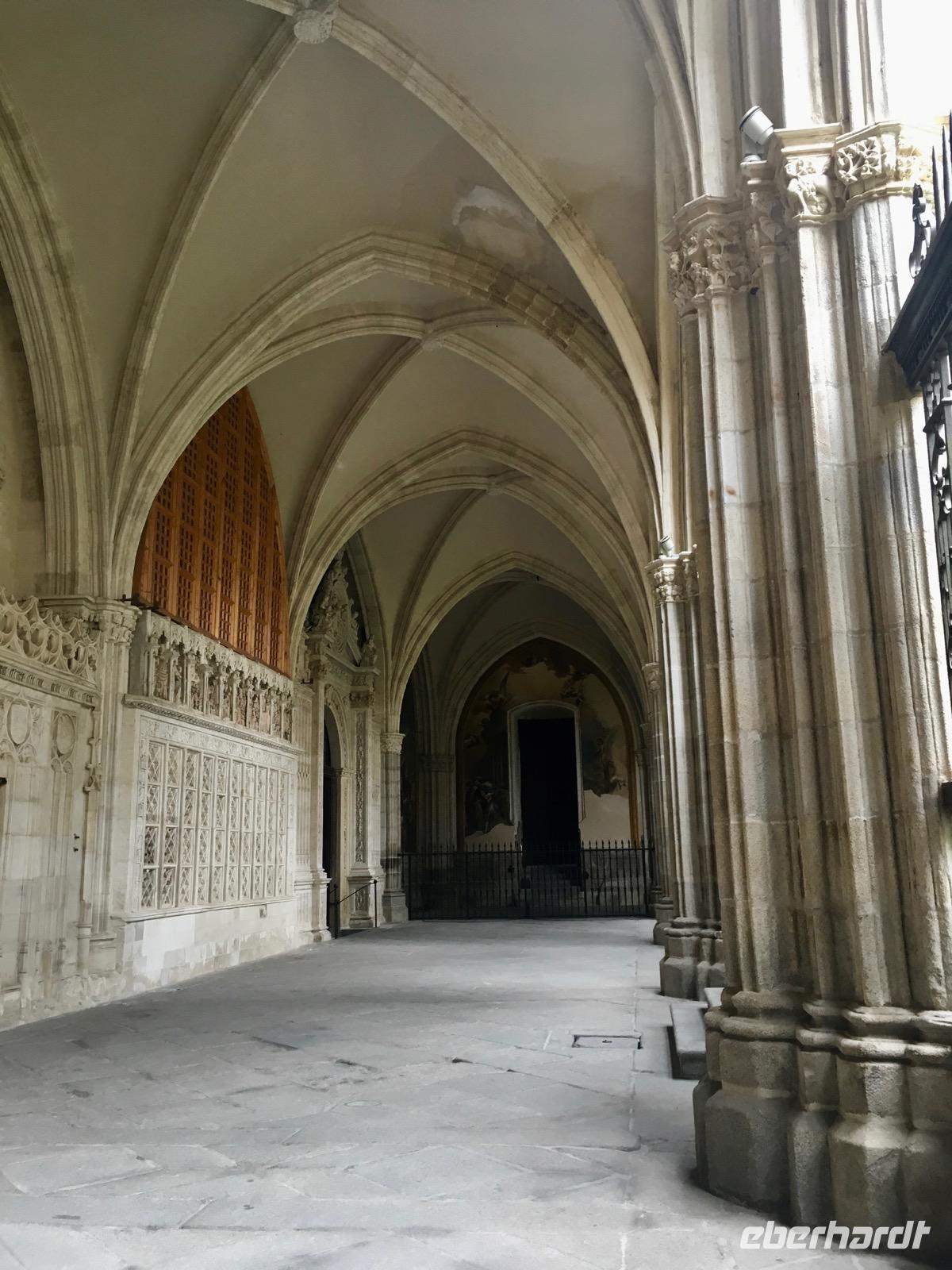 Als wir Toledo erreichen, fährt uns der Busfahrer José Miguel zunächst auf einen höher gelegenen Aussichtspunkt, von dem aus wir eine faszinierende Aussicht über Toledo bestaunen. Nachdem die ersten Fotos geschossen sind, geht es schließlich in das Stadtzentrum. Sehr komfortabel fahren wir mit einer meterlangen Rolltreppe hoch in den Stadtkern und gelangen zunächst zum Marktplatz, auf dem sich auch die Kathedrale befindet. Wir besichtigen die Kathedrale de Santa María nicht nur von außen, sondern auch von innen. Dabei lassen wir uns reichlich Zeit, da die Kathedrale von Toledo in gotischem Stil viel zu bieten hat. Petra erklärt uns, dass dennoch Elemente im Mudejar-Stil, also nach maurischem Vorbild, vorhanden sind. Dieser Stil soll uns auch noch in den folgenden Monumenten begegnen und unterstreicht dadurch insbesondere die kulturelle Bedeutung dieser Stadt. Bis zum 13. Jahrhundert galt Toledo als die Stadt der drei Kulturen. So lebten Christen, Juden und Muslime friedlich zusammen.