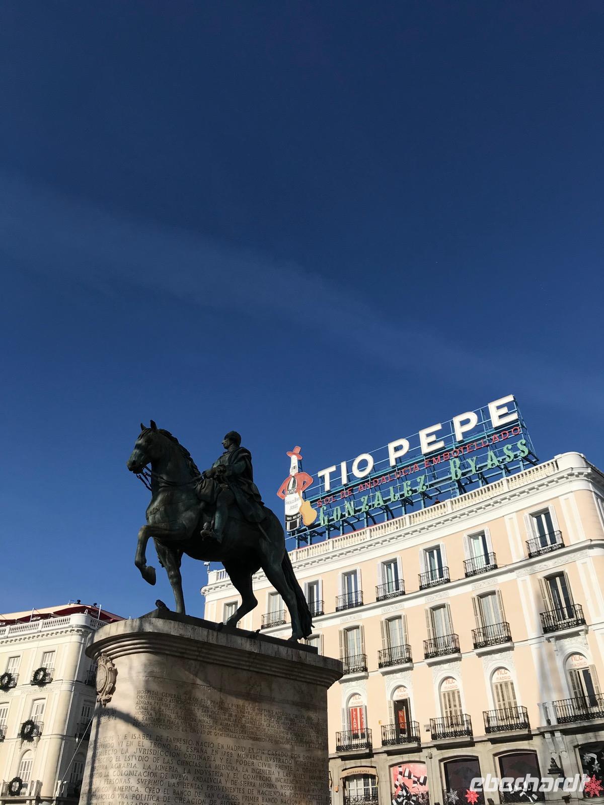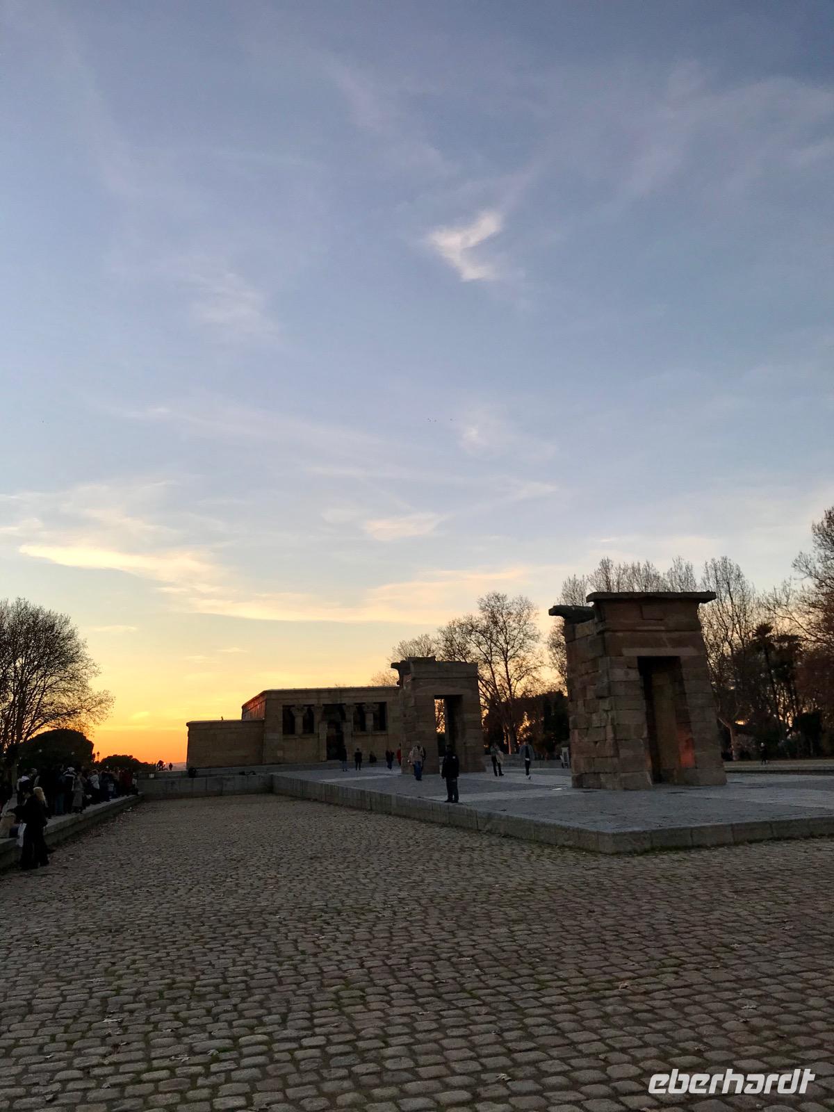 Ende Dezember startete unsere Eberhardt-Gruppe in die Hauptstadt Spaniens, um einen Jahreswechsel der besonderen Art zu feiern. Der Großteil unserer Gruppe traf sich am sonntagmorgen in Frankfurt, um gemeinsam nach Madrid zu fliegen. Die Hauptstadt hieß uns nach einem kurzweiligen zweistündigen Flug mit strahlendem Sonnenschein und herrlich blauem Himmel willkommen. Sodann wurden wir zu unserem Boutique Hotel Casa de la Lírica transferiert, das inmitten des Stadtzentrums gelegen ist. Rasch zählte sich unsere Gruppe vollständig, als unsere zwei Münchener Gäste eintrafen. Nach einer kurzen Verschnaufpause trafen wir uns am Nachmittag, um gespannt einen ersten Eindruck von Madrid zu erhalten. Über die Puerta del sol schlenderten wir zunächst zum Plaza Callao. In der gesamten Innenstadt herrscht reges Treiben, denn auch die Madrileños zieht es zwischen den Jahren auf die Straße. Der Gran Vía folgend, die mit ihren prächtigen Bauten und breiter Straße an den Time Square erinnert, erreichen wir den Plaza España. Wo sonst die Statue des Don Quijote mit Sancho Panza den Platz ziert, erstreckt sich derweil ein abgesperrter Bereich, in dem Ausgrabungen stattfinden. Was uns aber noch viel mehr interessieren soll, liegt aber erst dahinter. Auf einer Anhöhe befindet sich der Tempel von Debod, von dem aus sich der Sonnenuntergang hervorragend bewundern lässt. Das altägyptische Bauwerk stellt eine Schenkung an die Stadt Madrid dar. Durch den Bau des Assuan-Staudamms 1960 drohte der Tempel geflutet zu werden. Durch die tatkräftige Unterstützung von spanischen Archäologen konnte das bedeutende Bauwerk gerettet werden. Seit Ende der sechziger Jahre ziert der Tempel nun den westlichen Teil des madrider Zentrums und bietet bei untergehender Sonne eine beeindruckende Kulisse.