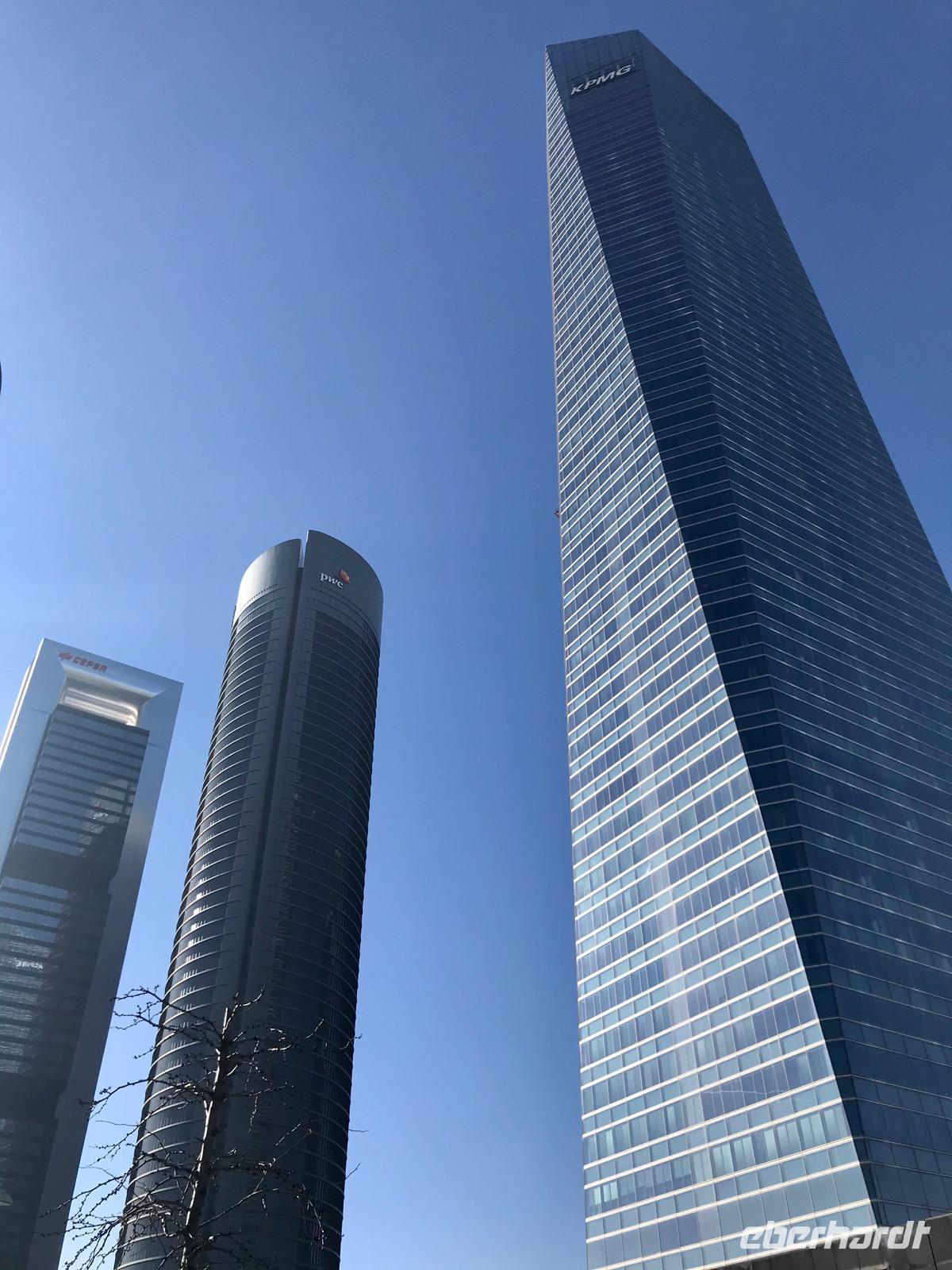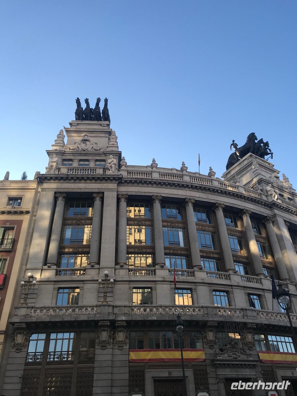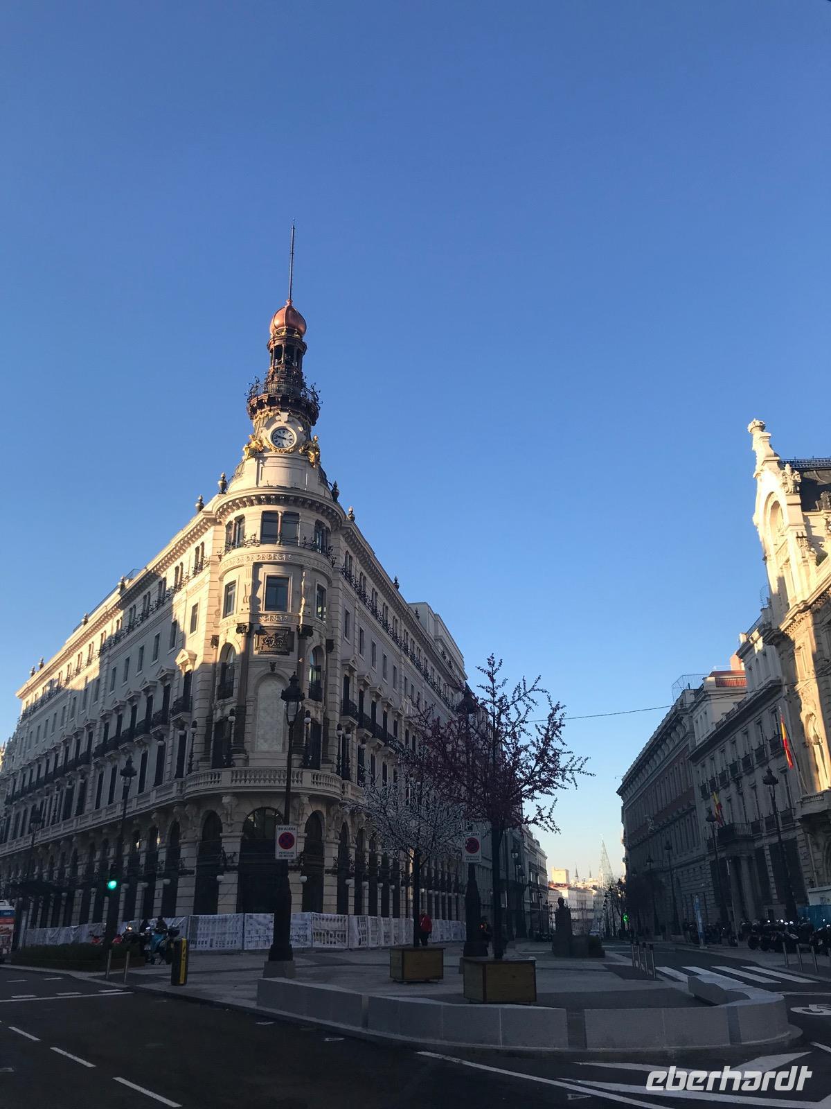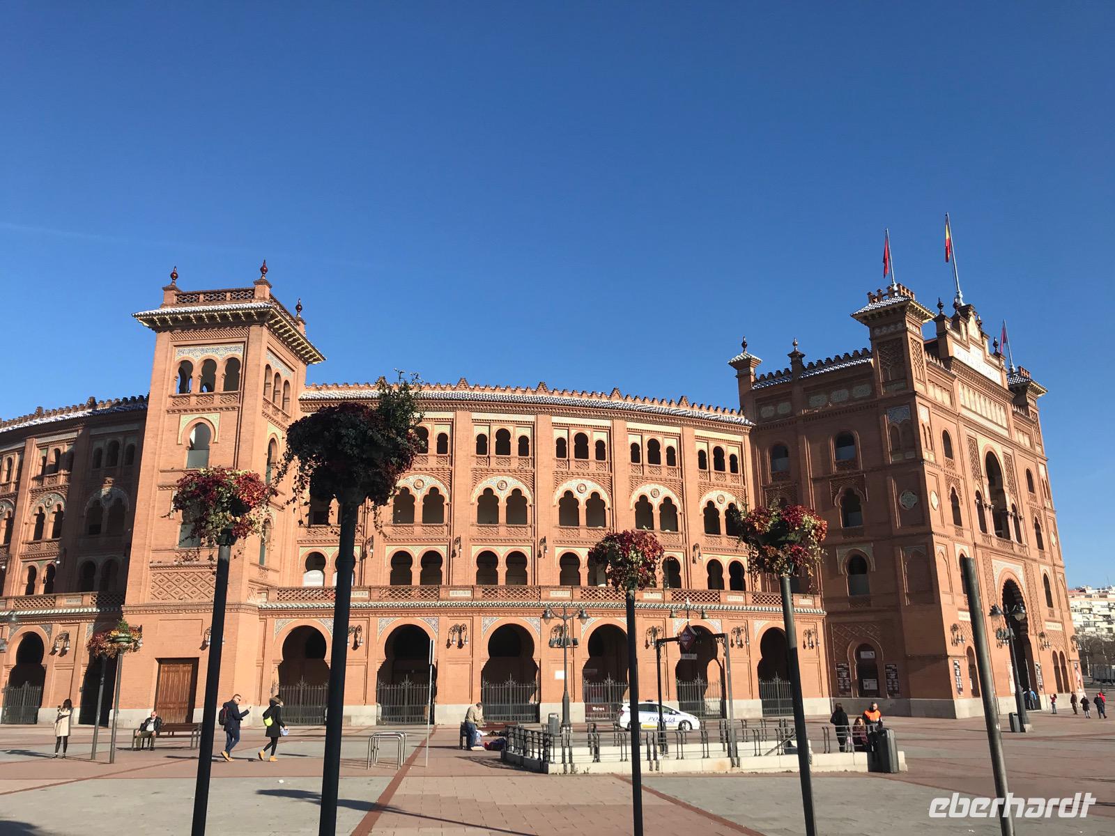 Heute lässt es unsere Eberhardt-Gruppe gemütlicher angehen. Nach einem ausgiebigen Frühstück starten wir am späten Vormittag mit unserer Reiseleiterin Christine zur Stadtrundfahrt. Der längsten Straße Madrids, der Calle de Alcalá, folgend, passieren wir den Plaza de Cibeles. Den verkehrsreichen Platz ziert ein Springbrunnen, der griechischen Göttin Kybeles gewidmet, sowie würdige Gebäude wie die spanischen Nationalbank. Sodann gelangen wir zur Stierkampfarena. Mit Elementen im Mudéjar-Stil begeistert uns die Arena durch ihre Architektur. Wir führen unsere Rundfahrt weiter fort und sehen das Bernabeu-Stadion von Real Madrid. Bevor wir wieder in das Stadtzentrum zurückkehren, machen wir noch einen Abstecher zum Stadtrand, wo zahlreiche Wolkenkratzer, die in den Himmel ragen, das Bild prägen. Wir fahren anschließend den Atocha-Bahnhof an und kehren zurück auf die längste Straße Madrids, die Calle de Alcalá.
