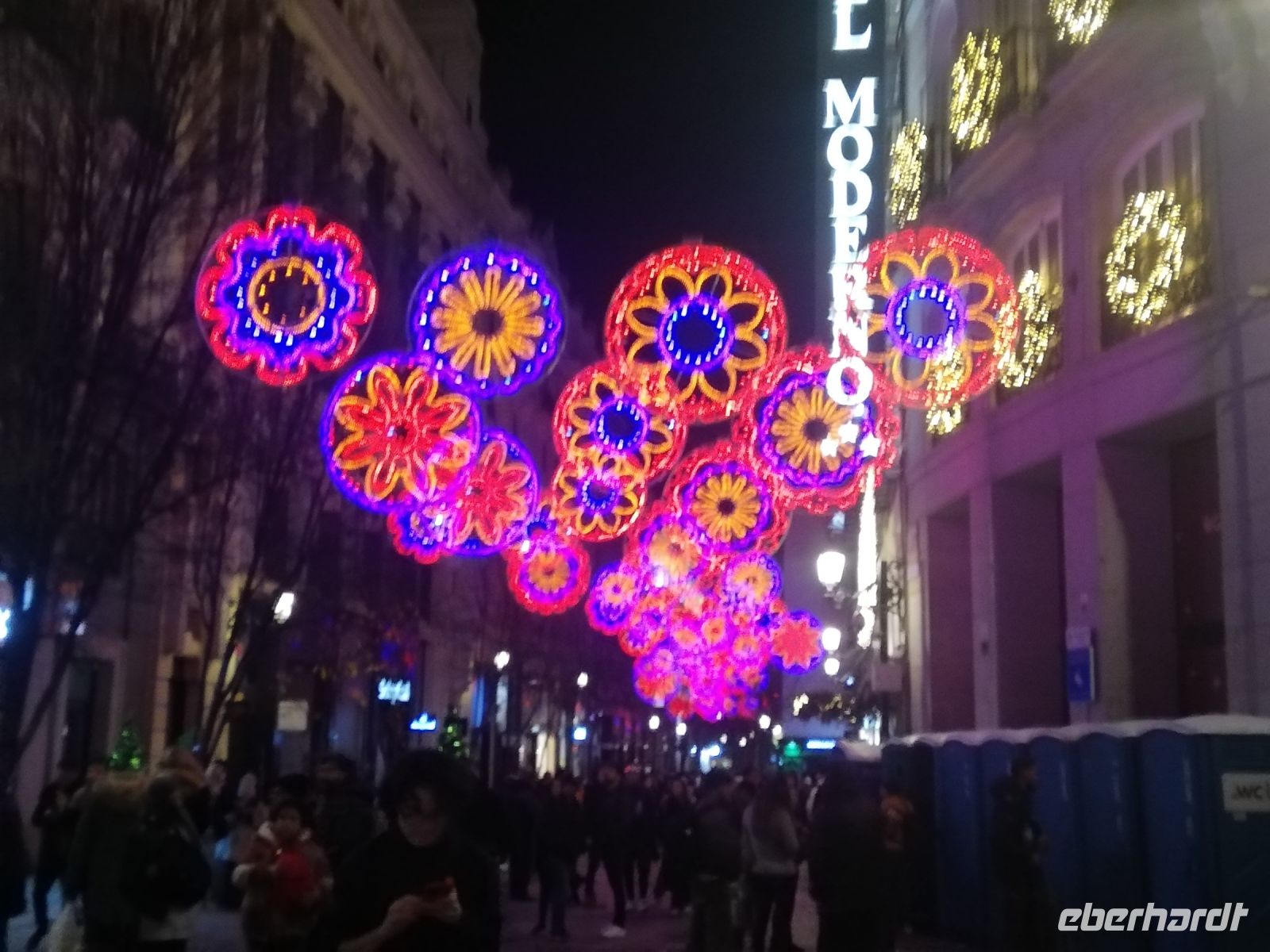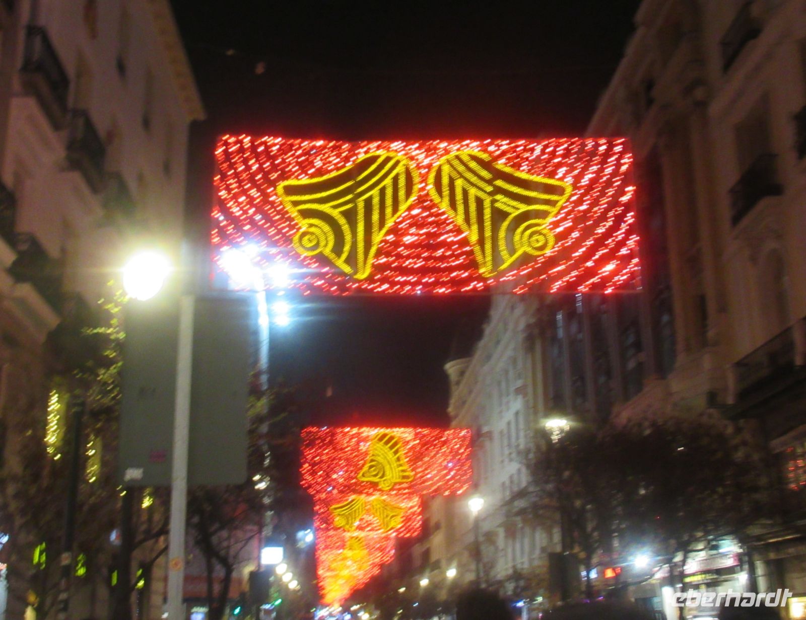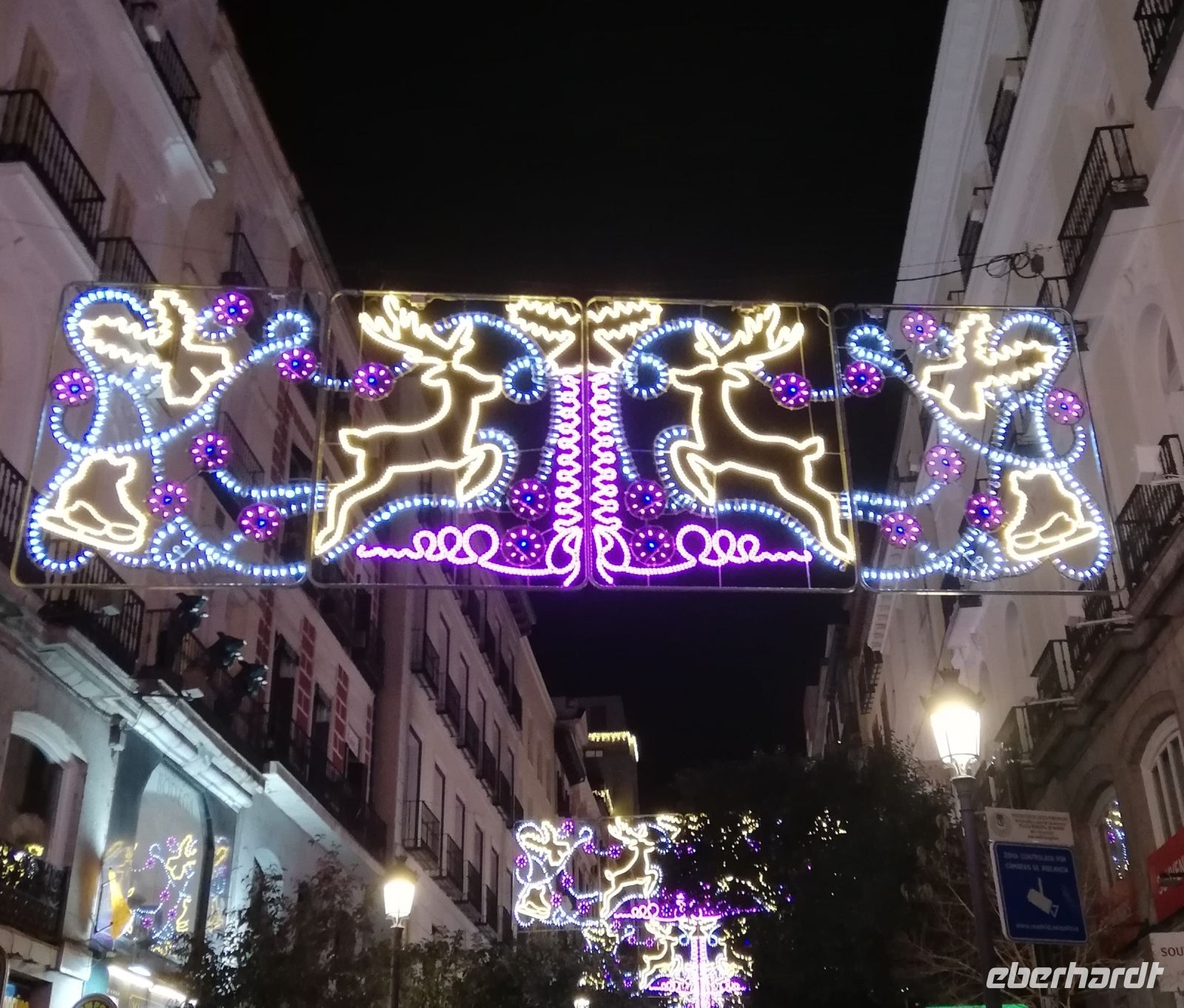 Wir bewundern die weihnachtliche Beleuchtung der Straßen die in Puerto del Sol münden. Jede Straße hat andere Motive, andere Farben – einfach herrlich. Die festliche Beleuchtung mit Millionen von Lämpchen erstrahlt in Madrid von Ende November bis zum Dreikönigstag und wird von mehreren spanischen Architekten und Designern kreiert. Dennoch werden hier strengste Anforderungen an Umweltschutz und Energieeffizienz beachtet.
