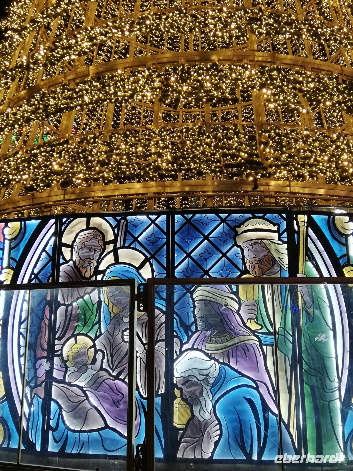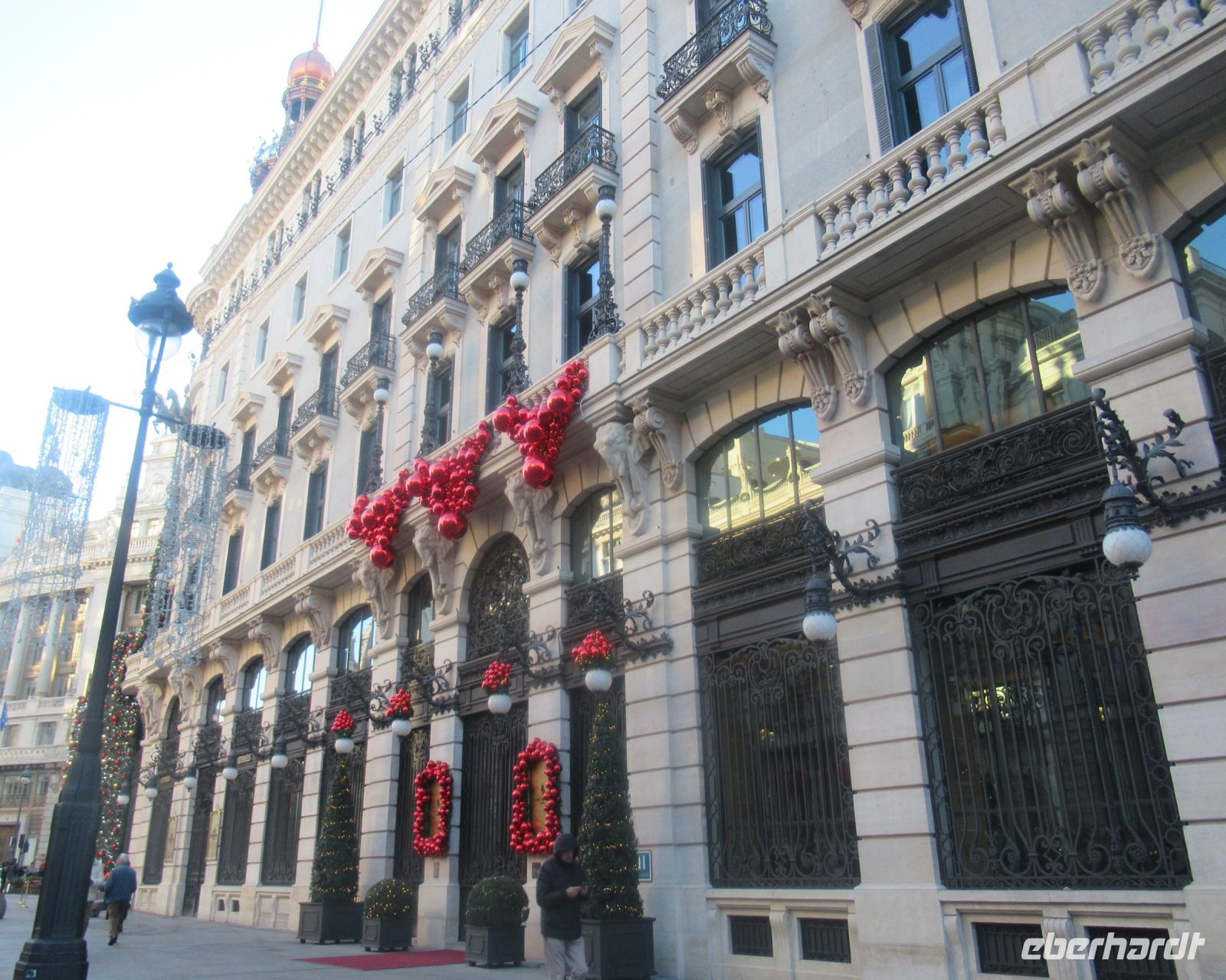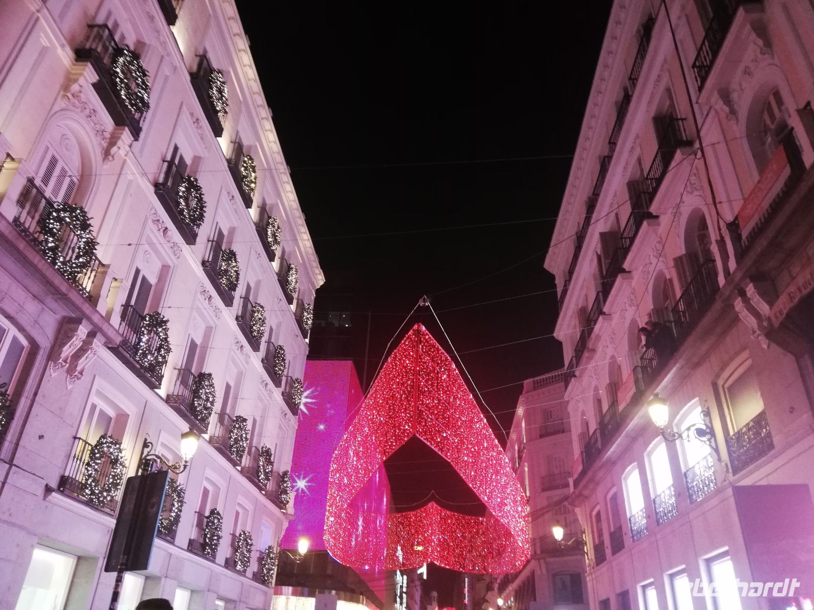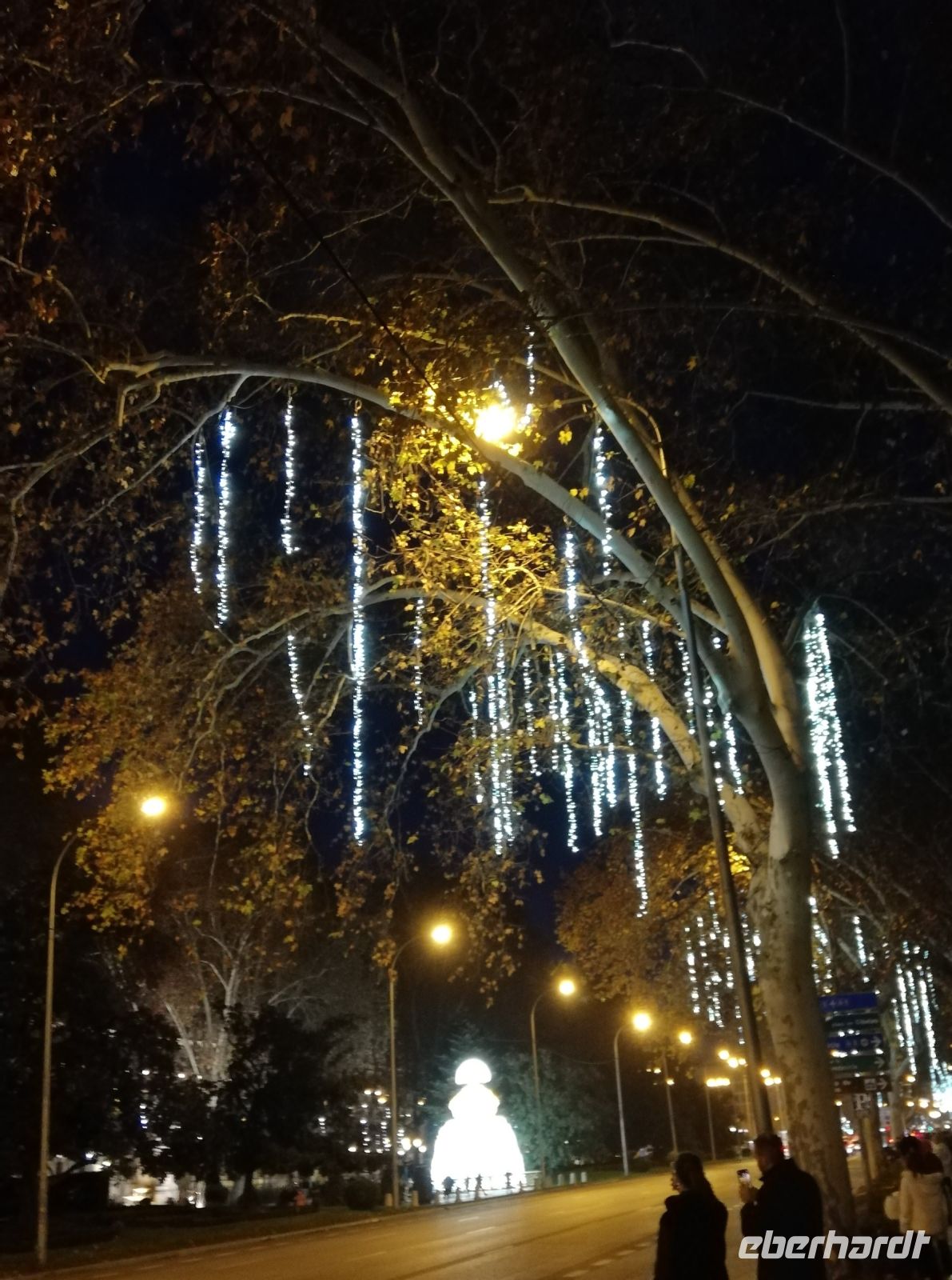 Wir bewundern die weihnachtliche Beleuchtung der Straßen die in Puerto del Sol münden. Jede Straße hat andere Motive, andere Farben – einfach herrlich. Die festliche Beleuchtung mit Millionen von Lämpchen erstrahlt in Madrid von Ende November bis zum Dreikönigstag und wird von mehreren spanischen Architekten und Designern kreiert. Dennoch werden hier strengste Anforderungen an Umweltschutz und Energieeffizienz beachtet.