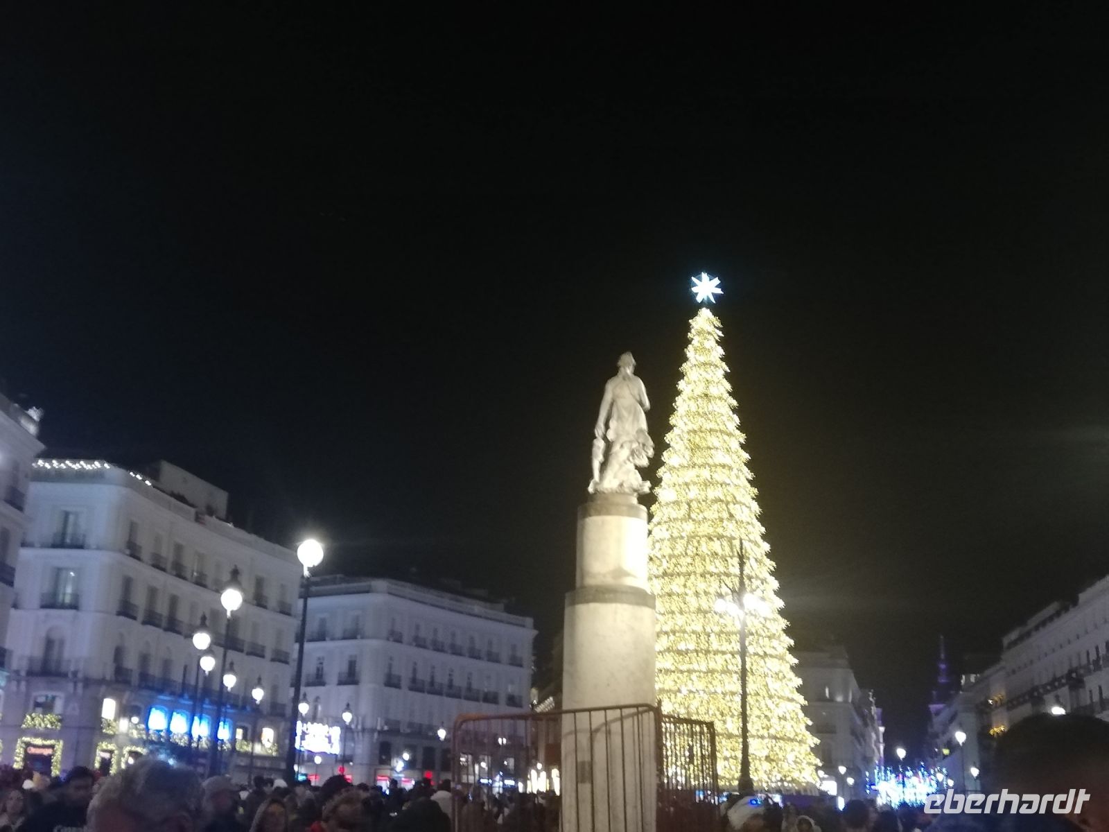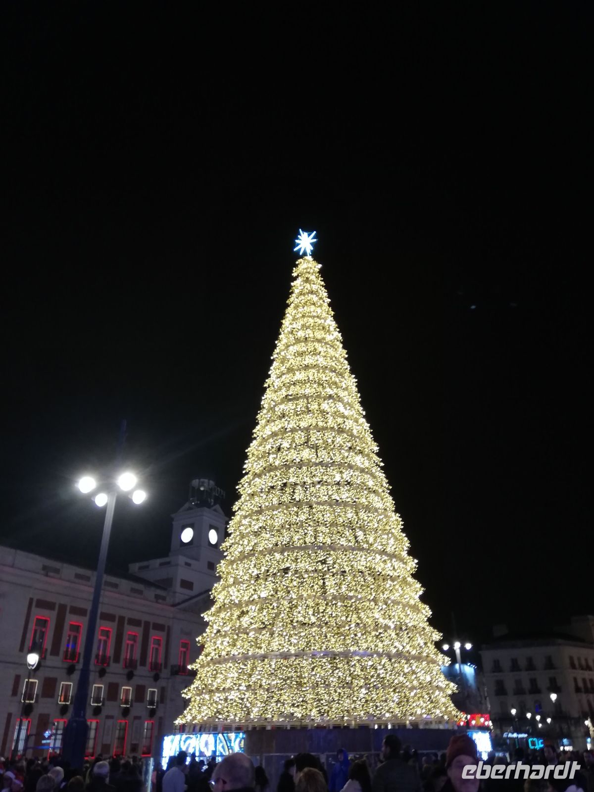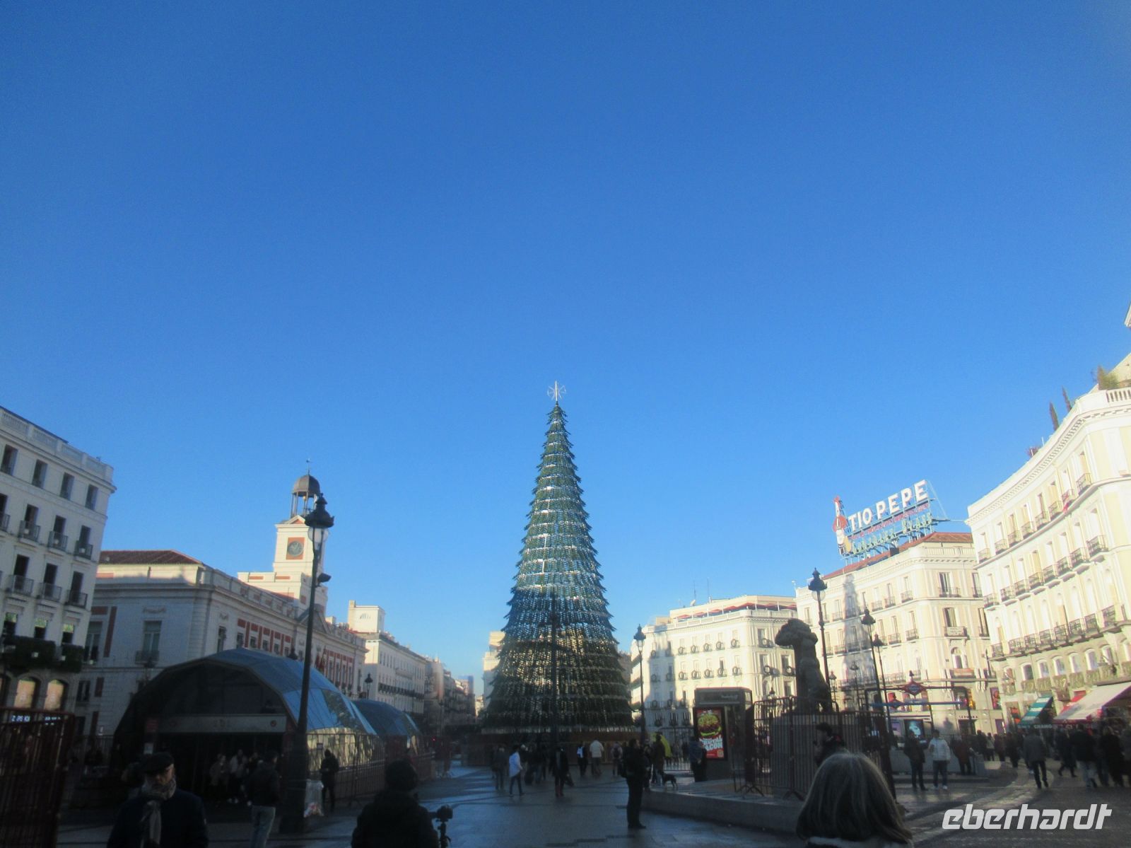 So gestärkt geht es in die City. Nur ein paar Schritte und schon stehen wir im Herzen der Stadt, Puerta del Sol. Ein über 20 Meter hoher goldener Christbaum dominiert den Platz. Es ist bereits fast dunkel, der Platz ist voller Menschen, die die Stimmung hier genießen.