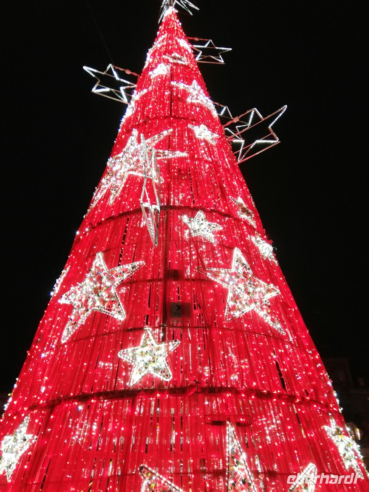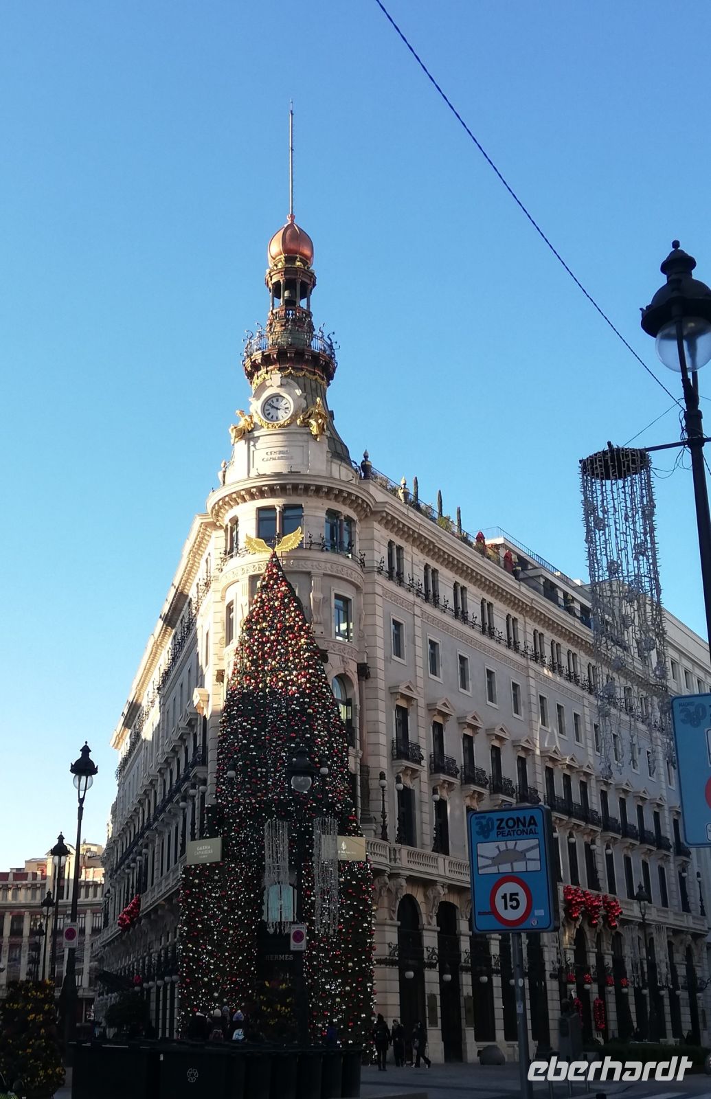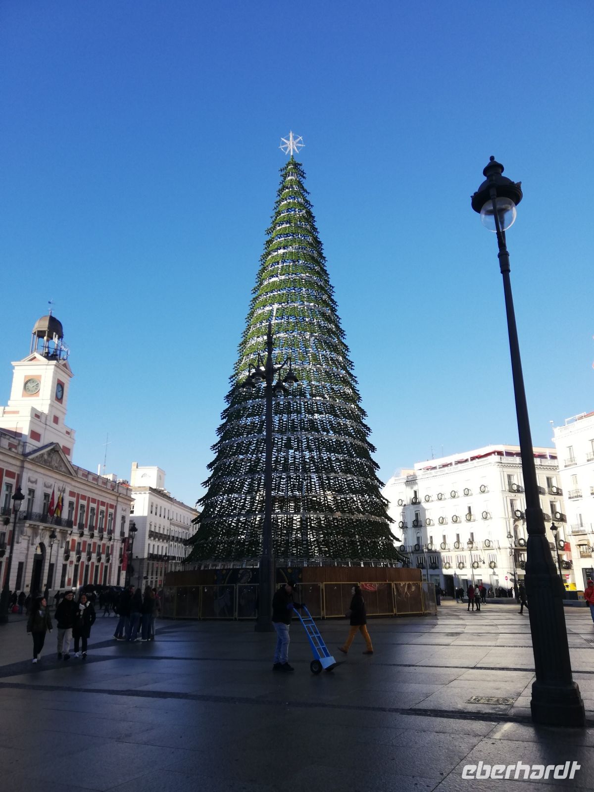 So gestärkt geht es in die City. Nur ein paar Schritte und schon stehen wir im Herzen der Stadt, Puerta del Sol. Ein über 20 Meter hoher goldener Christbaum dominiert den Platz. Es ist bereits fast dunkel, der Platz ist voller Menschen, die die Stimmung hier genießen.