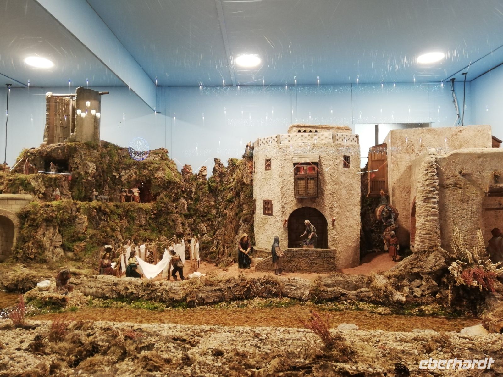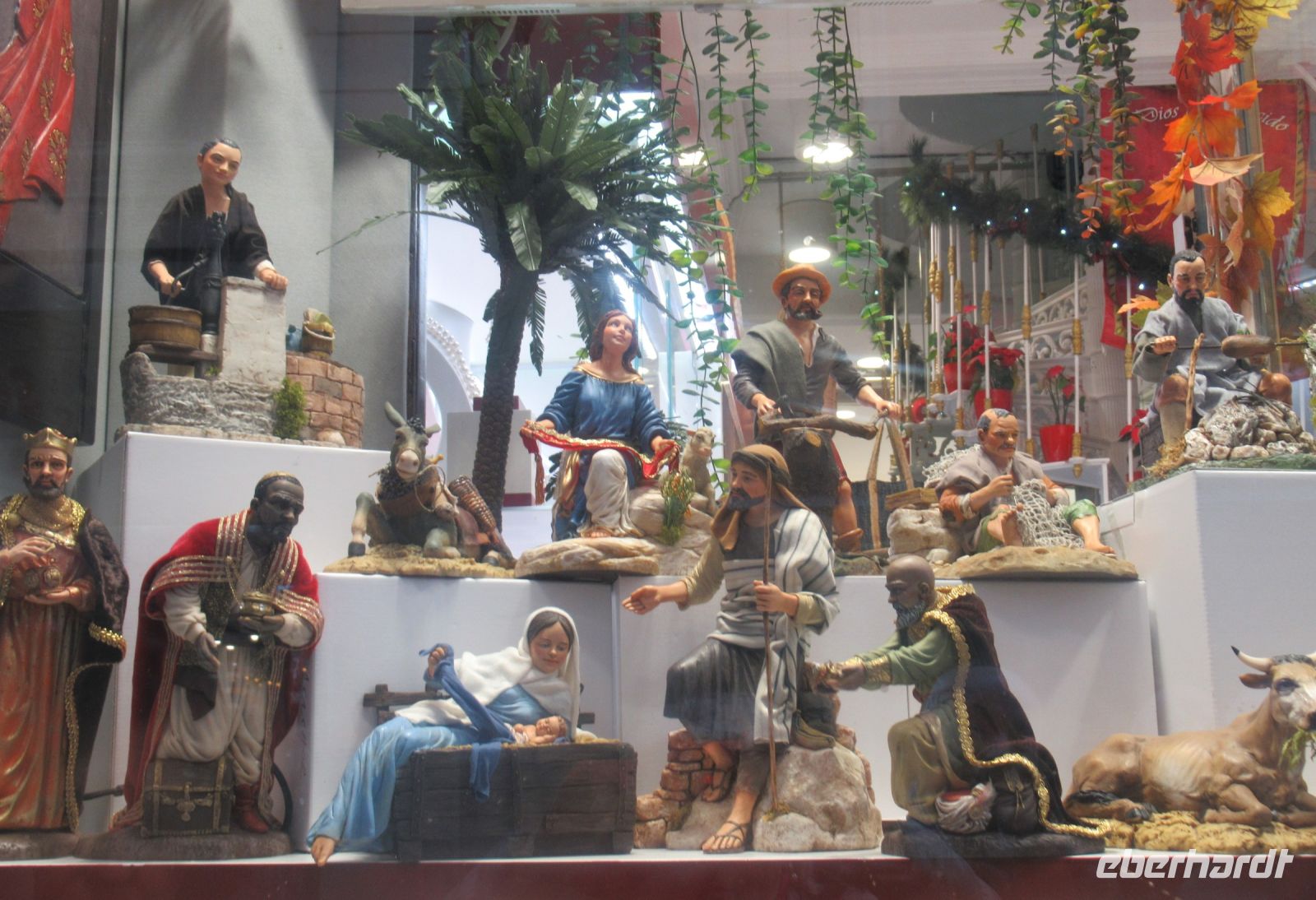 Wir laufen über die Calle Mayor Richtung Plaza Mayor, wo wir kleinen Streifzug durch den Weihnachtsmarkt mit roten Ständen machen. Sehr interessant ist die künstlerische Gestaltung des Christi Geburtsort in einige verglasten Ständen.