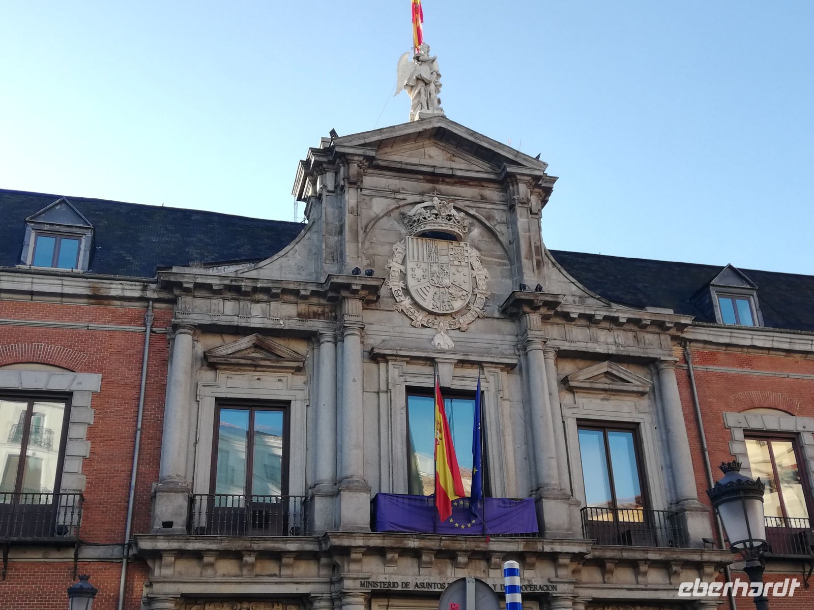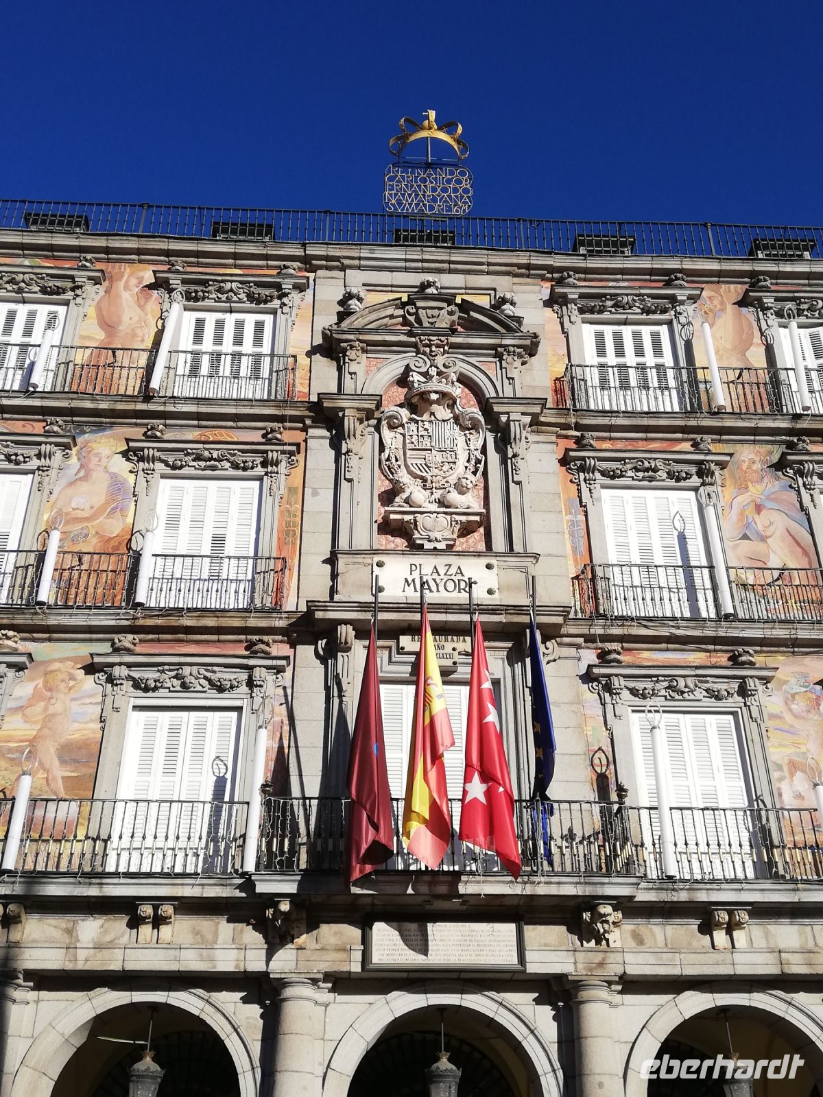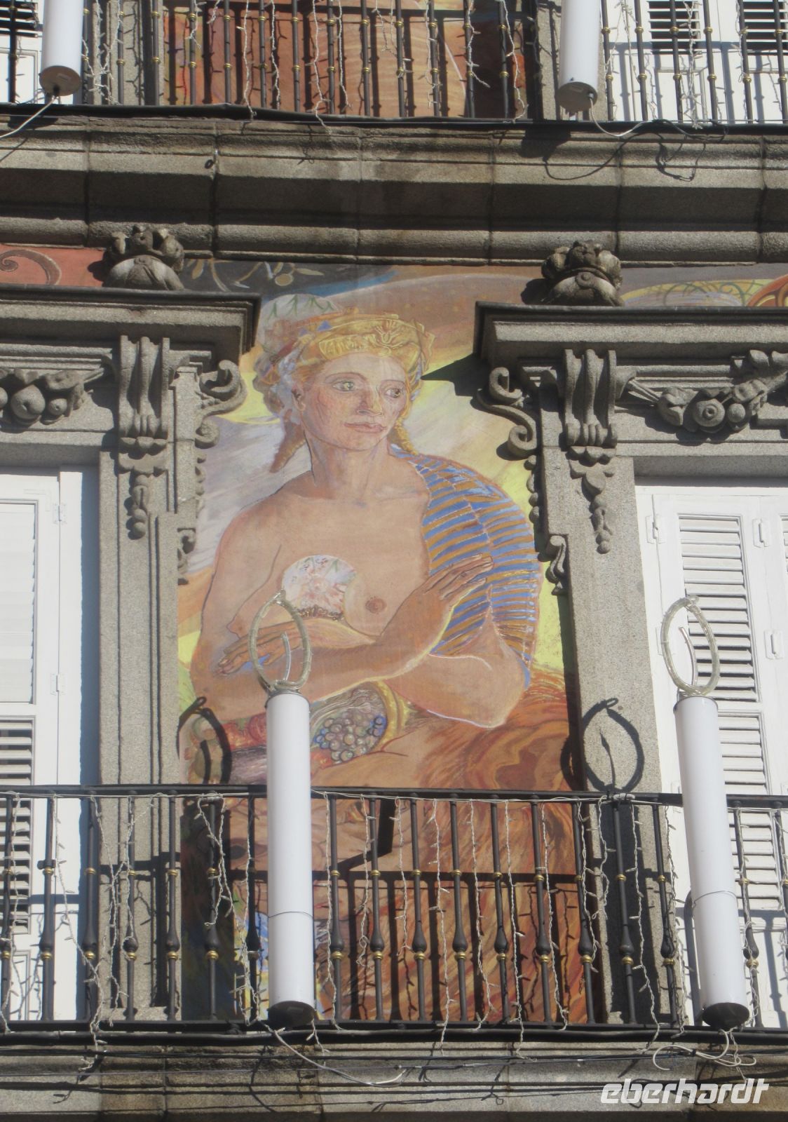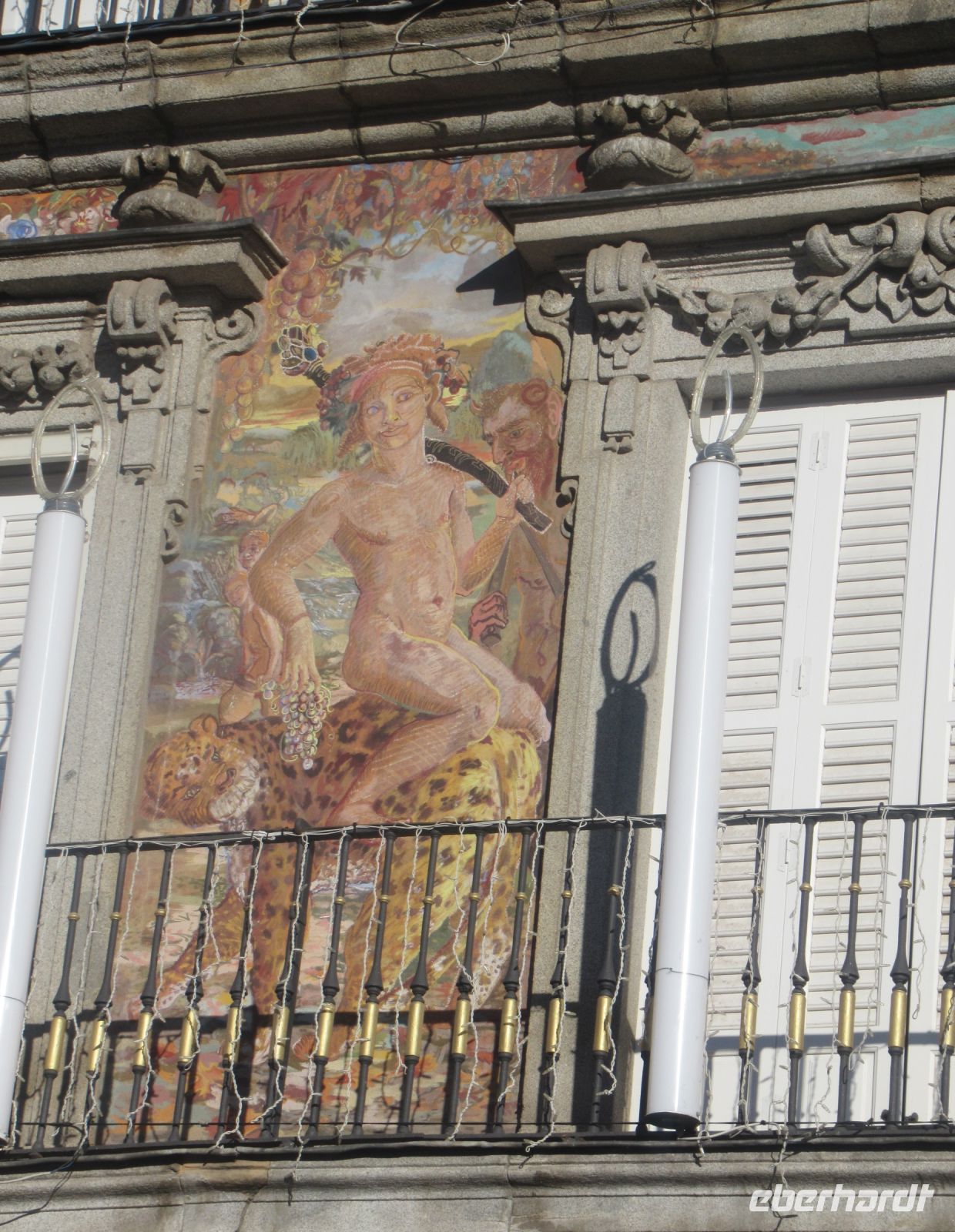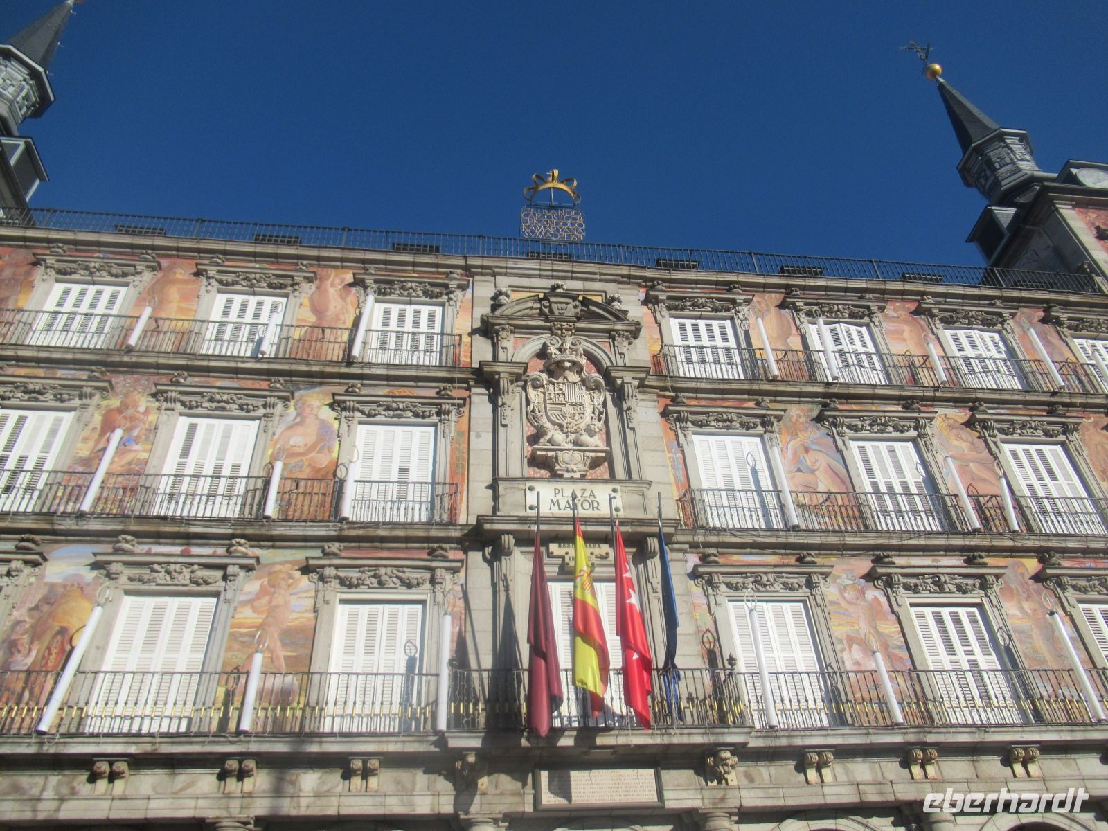 Angela erzählt uns über die Geschichte des Plaza: Philipp II. verlegt die Hauptstadt Spaniens nach Madrid (1561) und lässt die Plaza Mayor bauen; fertig gestellt wurde Plaza unter Philipp III. im 1619. Im 1848 wurde das Reiterstandbild zu Ehren Philipps III. in der Mitte des Platzes aufgestellt. Wir stehen vor dem dominierenden Gebäude „Casa de la Panadería“ mit sehr schönen Wandmalereien. Wie der Name schon sagt, war in dem Gebäude aus dem Jahr 1590 die wichtigste Bäckerei des alten Madrids angesiedelt, später wurden die Räume als öffentliche (Eich-)Waage genutzt. Im 18. und 19. Jahrhundert wurde hier zunächst die Real Academia de Bellas Artes de San Fernando untergebracht, später dann die Real Academia de la Historia. Im oberen Geschoss Räumlichkeiten der Königsfamilie.