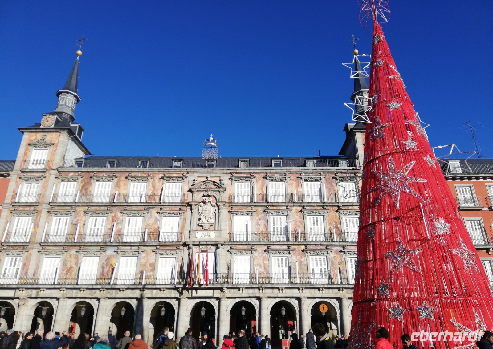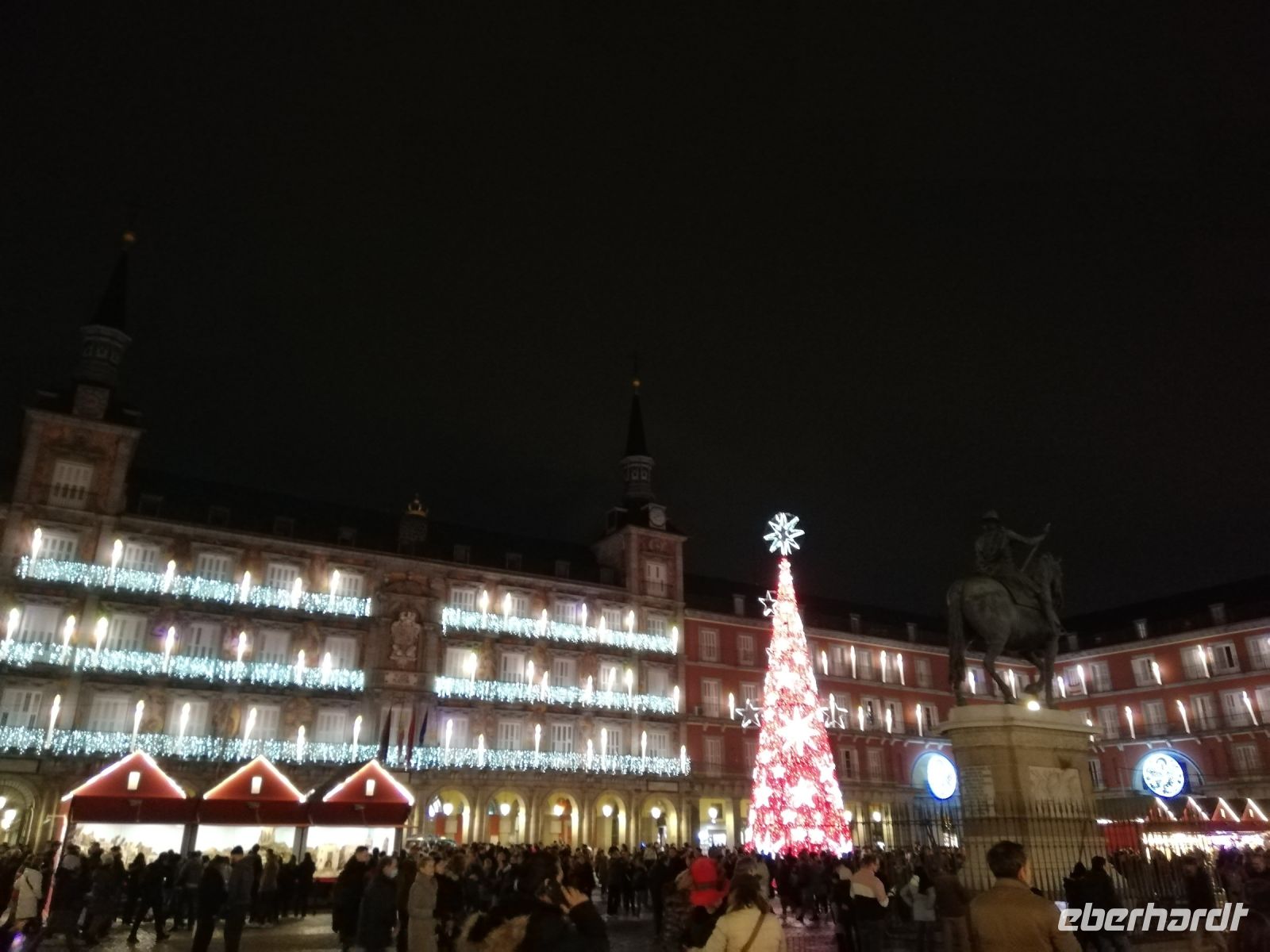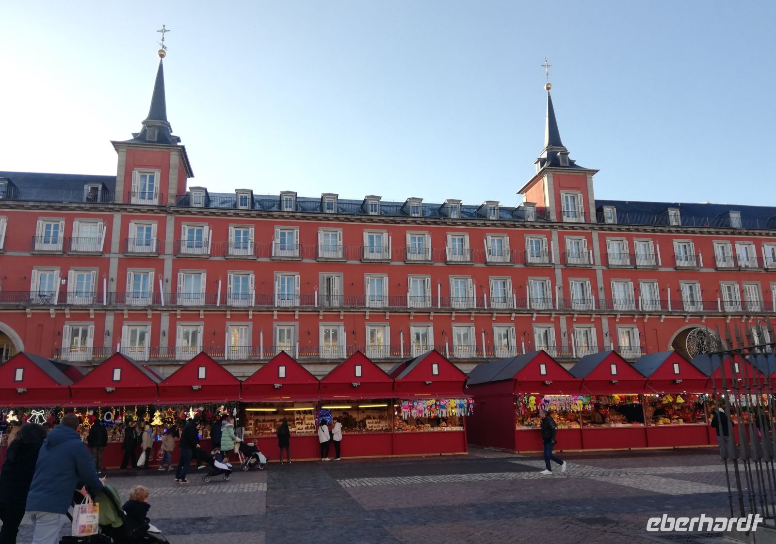 Ein viereckiger Platz, 129 m lang und 94 Meter breit, der einheitlich mit viergeschossigen Gebäuden umbaut ist. Heute stehen auf den Marktplatz die roten Weihnachtsmarktstände mit vielen schönen oder auch kitschigen Weihnachtsartikel. Auf den spanischen Weihnachtsmärkten sind Essensstände eher eine Seltenheit.