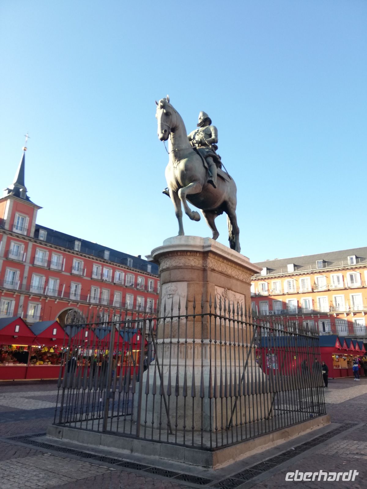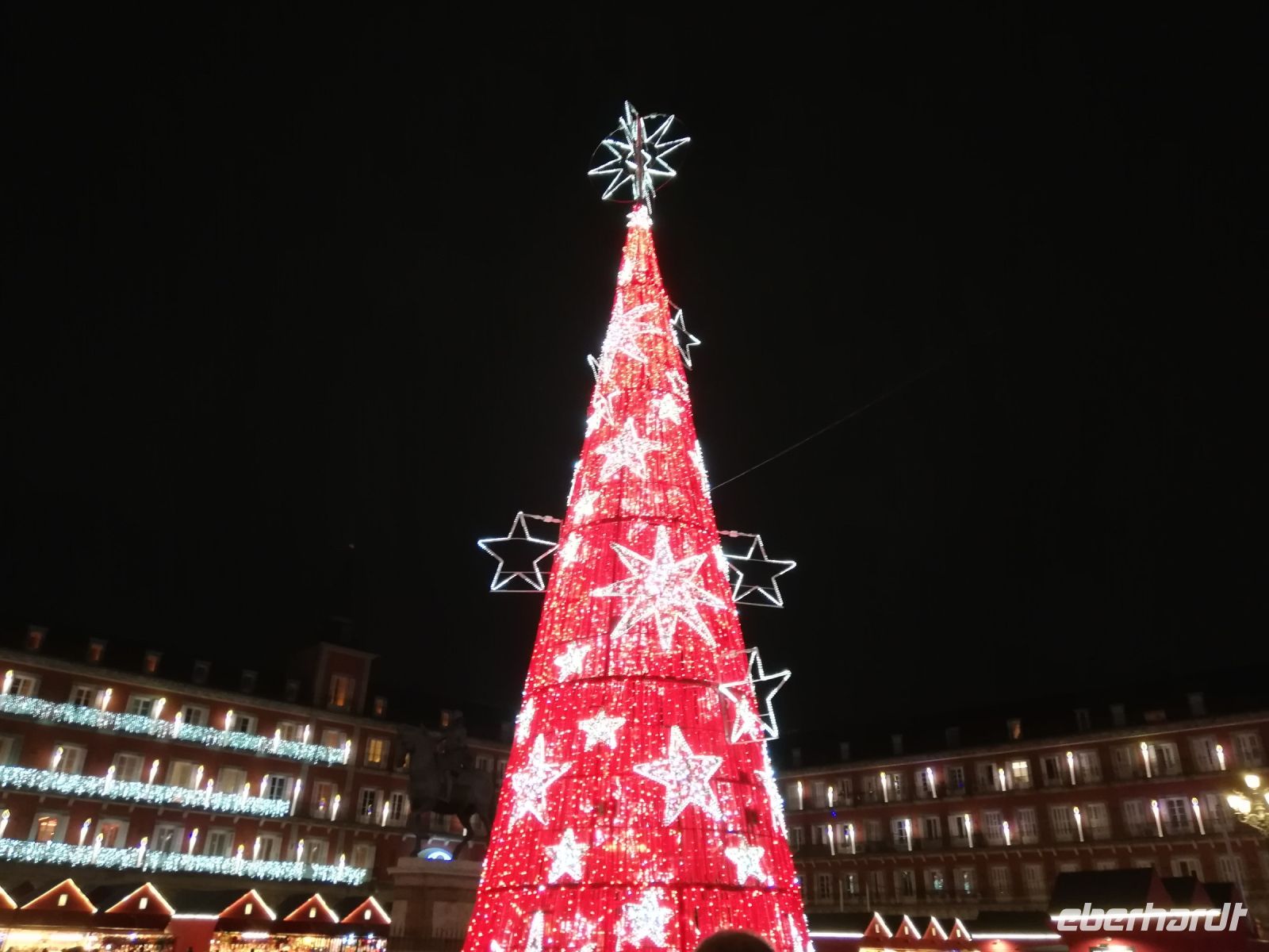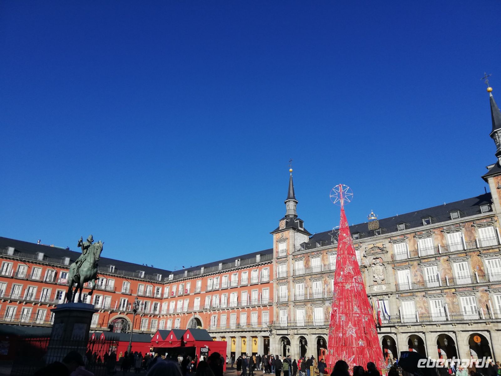 Ein viereckiger Platz, 129 m lang und 94 Meter breit, der einheitlich mit viergeschossigen Gebäuden umbaut ist. Heute stehen auf den Marktplatz die roten Weihnachtsmarktstände mit vielen schönen oder auch kitschigen Weihnachtsartikel. Auf den spanischen Weihnachtsmärkten sind Essensstände eher eine Seltenheit.
