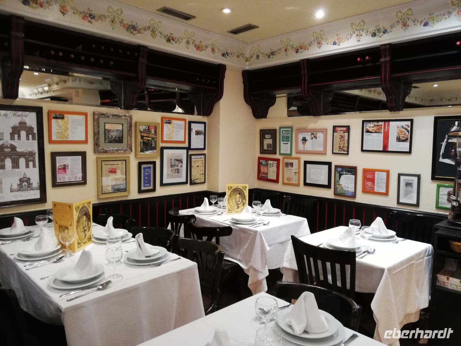 Wir, bzw. Eberhardt Travel hat für uns die angenehmere Variante gebucht und wir laufen den bereits bekannten Weg zu dem Traditionsrestaurant „Los Galayos“ in einer Ecke der Plaza Mayor. Und es ist nicht irgendein Restaurant – sondern ein Traditionsrestaurant. Die Geschichte des Restaurants geht zurück bis 1894. Ein Familien-Traditionsrestaurant, das sich von einem Wirtshaus zu traditionellem Madrider Restaurant mit galizischer Küche entwickelt hat. Hier trafen sich die Dichter und Denker der „Generation 27“ in 1936, kurz vor dem Bürgerkrieg. Das Treffen wurde geführt von Federico García Lorca, der 1936 erschossen wurde. Weitere bekannte Dichter wie Rafael Alberti oder auch Pablo Neruda waren bei dem Treffen in Los Galayos zu Gast.