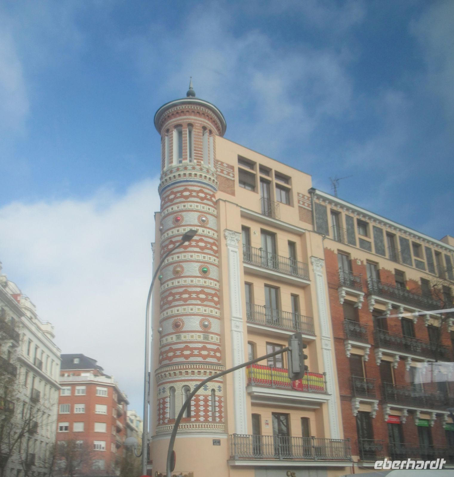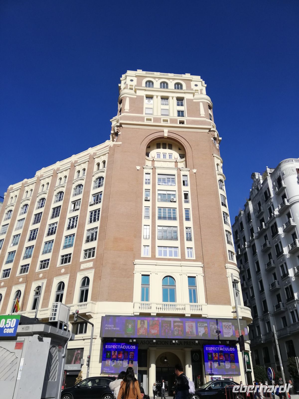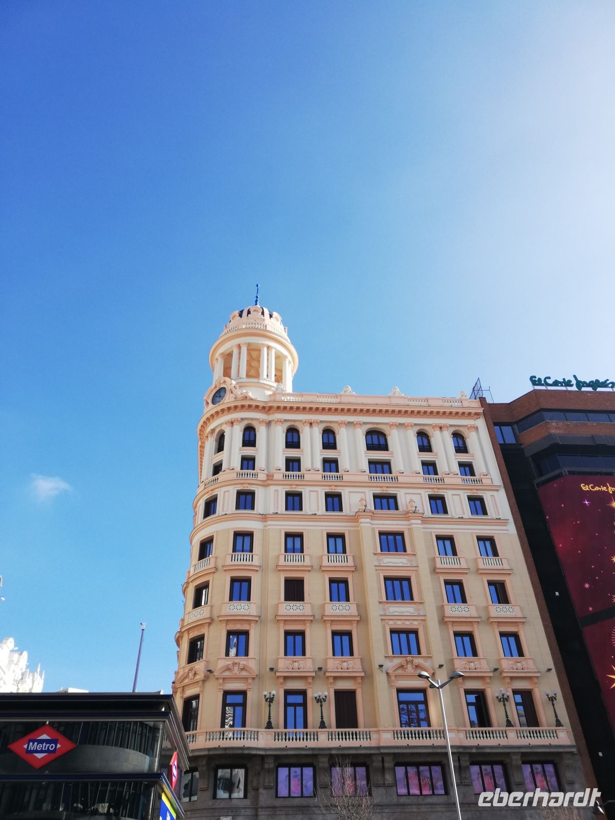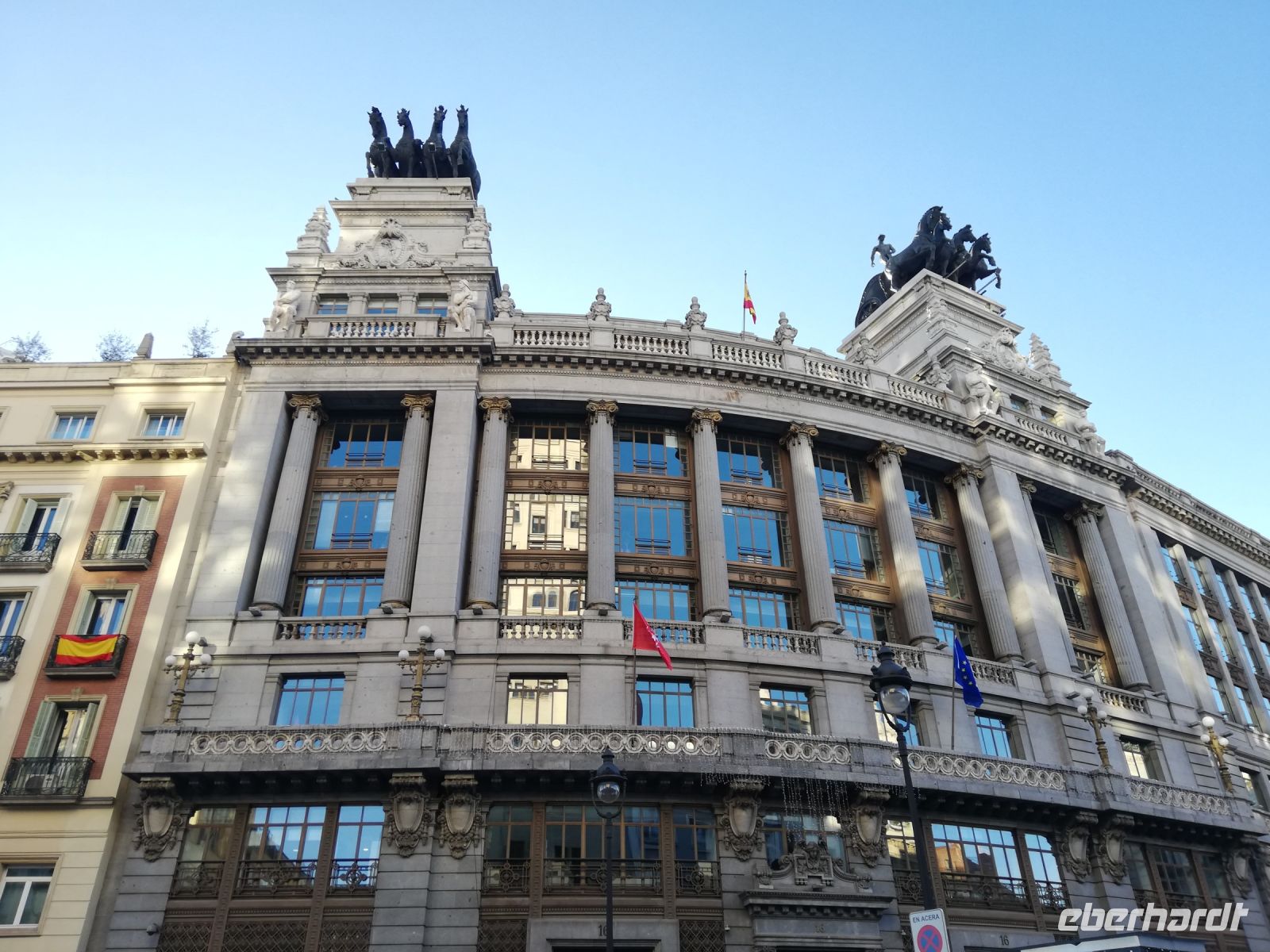 Von dem Kreisel vor dem Cibeles Brunnen versuchen wir noch die Bilder, die imposante Kulisse der Palacio Cibeles - des historischen Postgebäude vom 1909 - heute Sitz der Madrider Stadtverwaltung – in unsere Fotoapparate einzufangen. Durch die vielen Autos – nicht leicht…