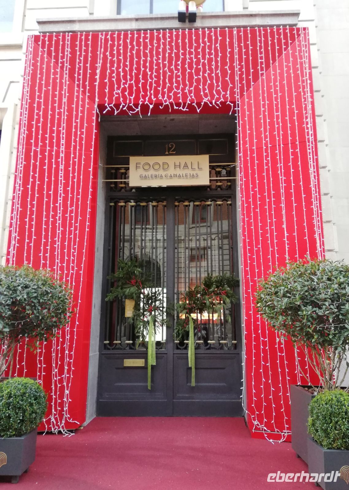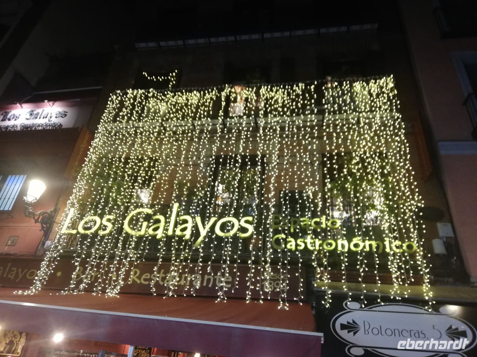 Rot erstrahlt hier der Weihnachtsbaum mit weißen Sternen, passend zu der Farbe der Gebäude an der Plaza. Wir werden Plaza Mayor morgen mit unserer Reiseleiterin bei Tageslicht besuchen und auch etwas mehr erfahren, daher führt unser Weg in das berühmte Sträßchen „Calle de Cuchilleros, wo wir heute das Abendessen genießen werden.