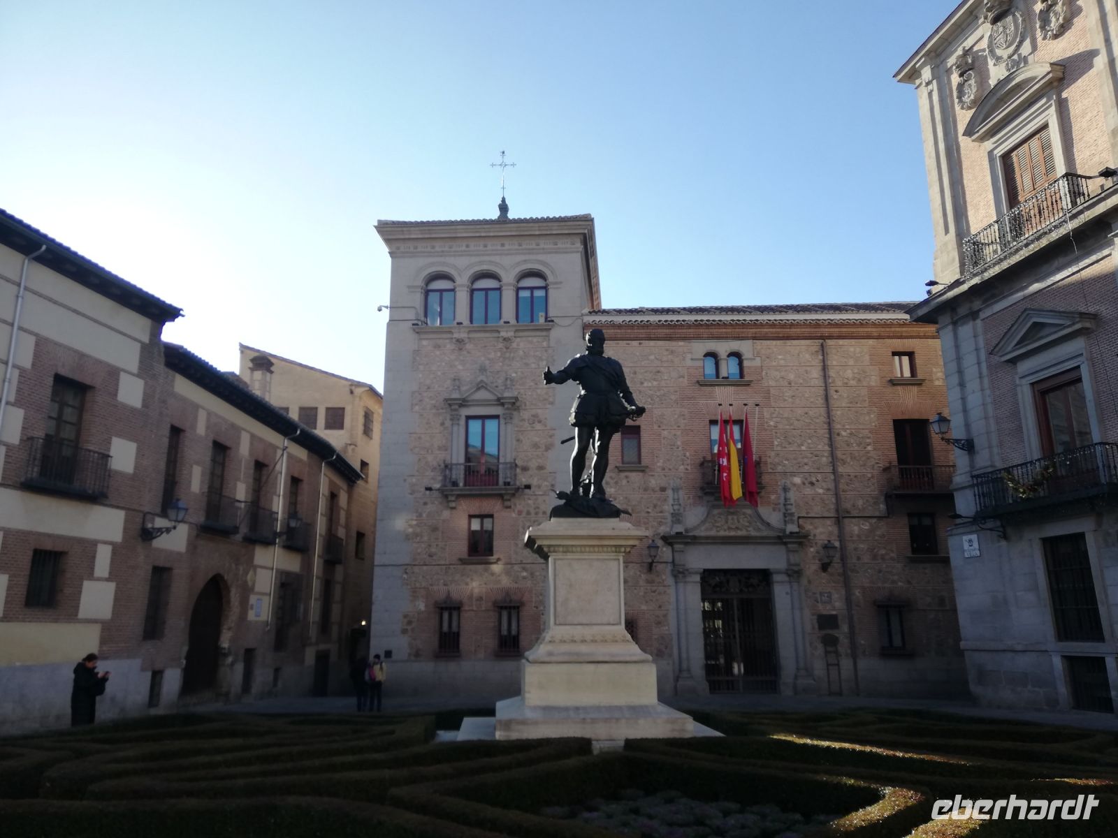 Hier können wir noch von oben auf die Sabatini Gärten runterblicken und schon sind wir auf der Plaza de España mit dem berühmten Cervantes-Denkmal und Brunnen.