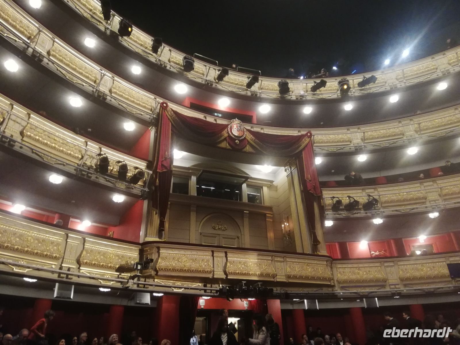 An der Plaza de Isabel II. ist auch ein kleinerer gemütlicher Weihnachtsmarkt, so können die Gäste noch etwas stöbern. Wir betreten bald das historische Gebäude des Teatro Real – auch hier müssen aus Sicherheitsgründen unsere Taschen durch den Scanner. Wir betreten das recht kleine Foyer, das ein schöner Christbaum schmückt. Hier noch ein Foto der Gäste als Erinnerung an den Moment. Wir nehmen unsere Plätze in dem vorderen Reihen ein, mit einem sehr guten Blick auf die Bühne.