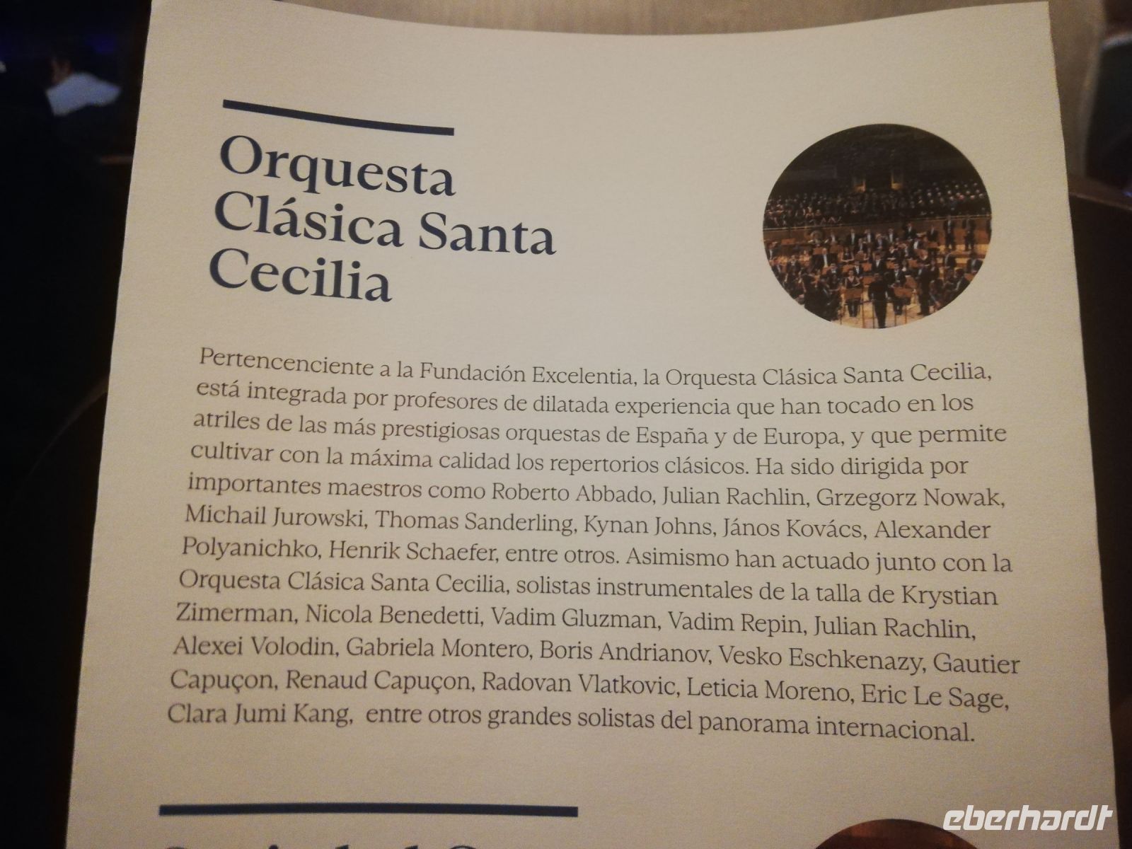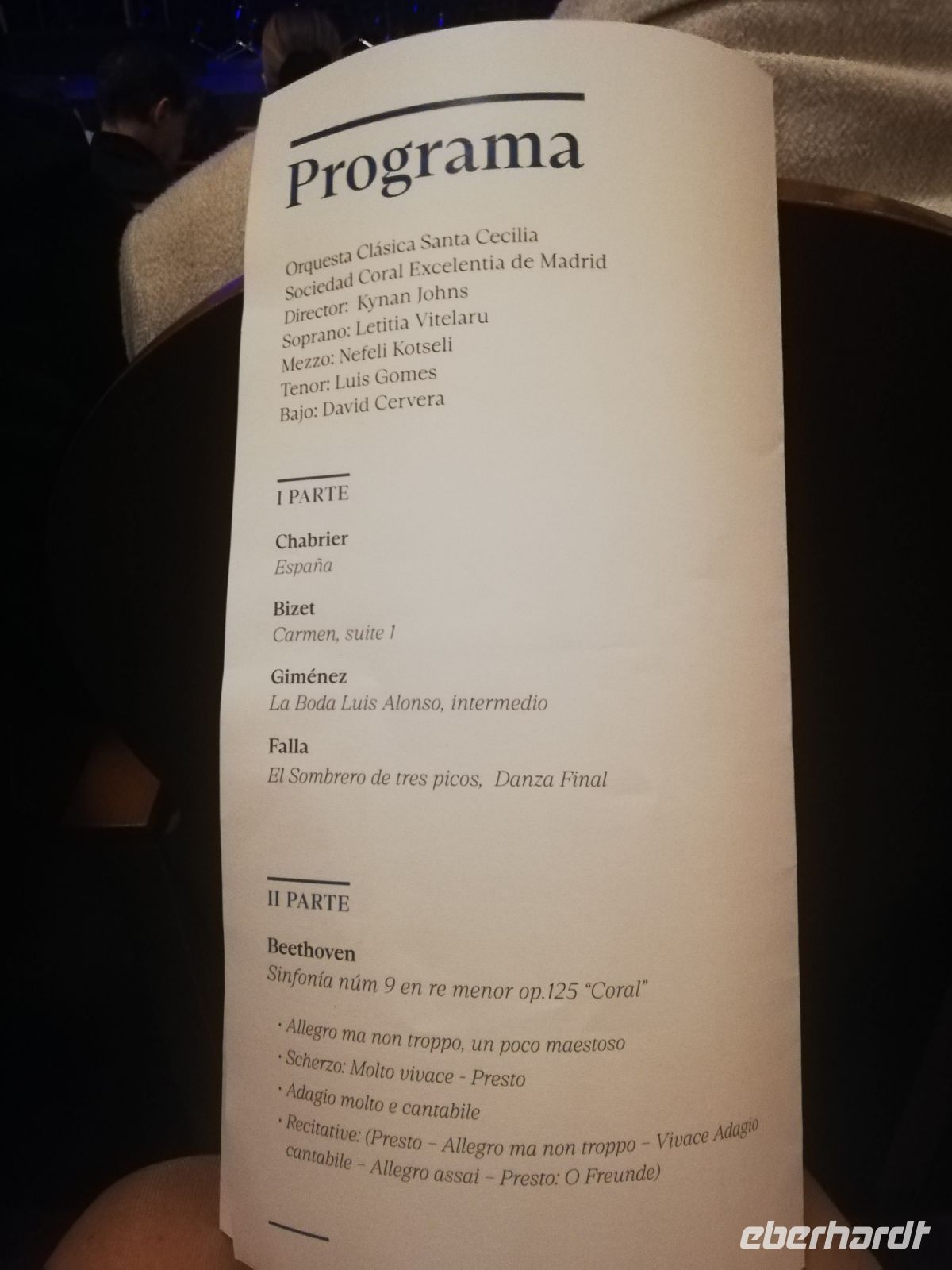 Das Konzert beginnt. Das „Orquesta Clásica Santa Cecilia“ – ein Ensemble von sehr jungen Künstlern unter der Führung des Dirigenten Kynan Johns, gebürtiger Australier, der auf vielen Bühnen der Welt zu Gast ist. Von der ersten Minute begeistert uns das Konzert und erzeugt „Gänsehaut“. Im ersten Teil erklingen unter anderem die Suite 1 von Bisets Carmen und im Hauptteil begeistert uns die „9te Sinfonía“. Das grandiose Finale wird von vier Opernsolisten und einem Chor „Coral Excelentia de Madrid“ begleitet. Ein unvergessliches Erlebnis als Abschluss des Jahres 2023.