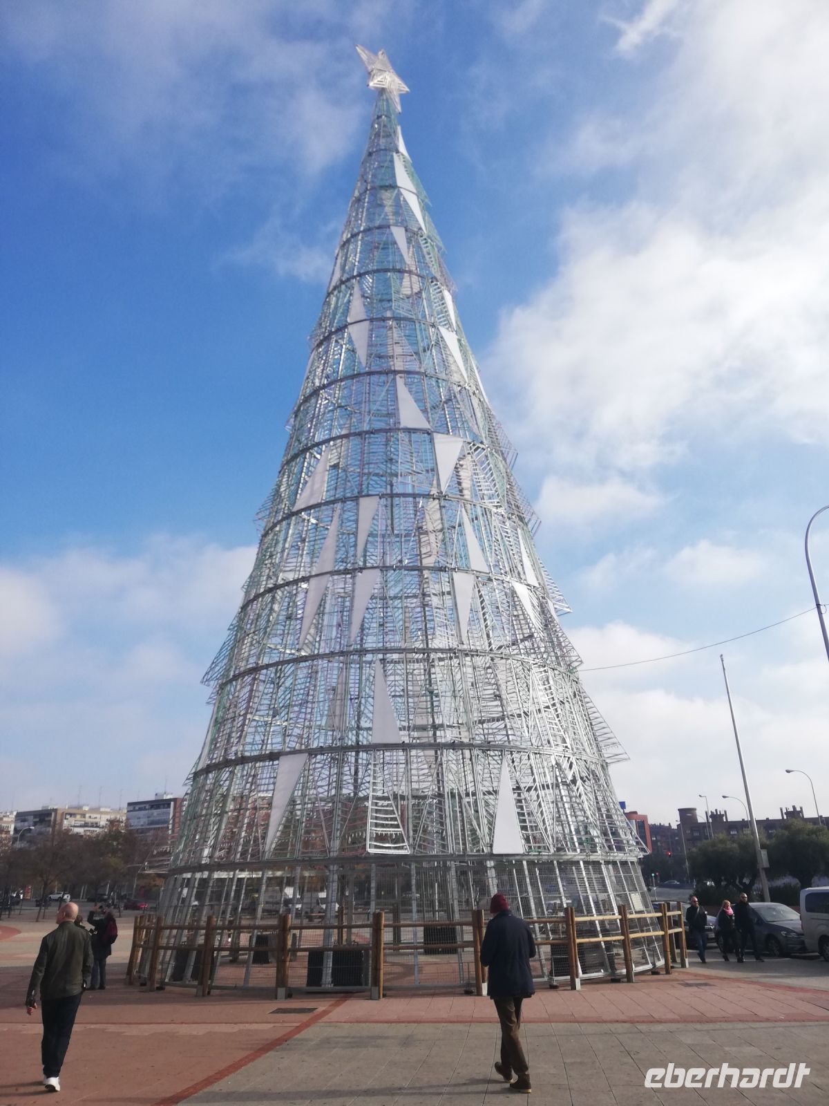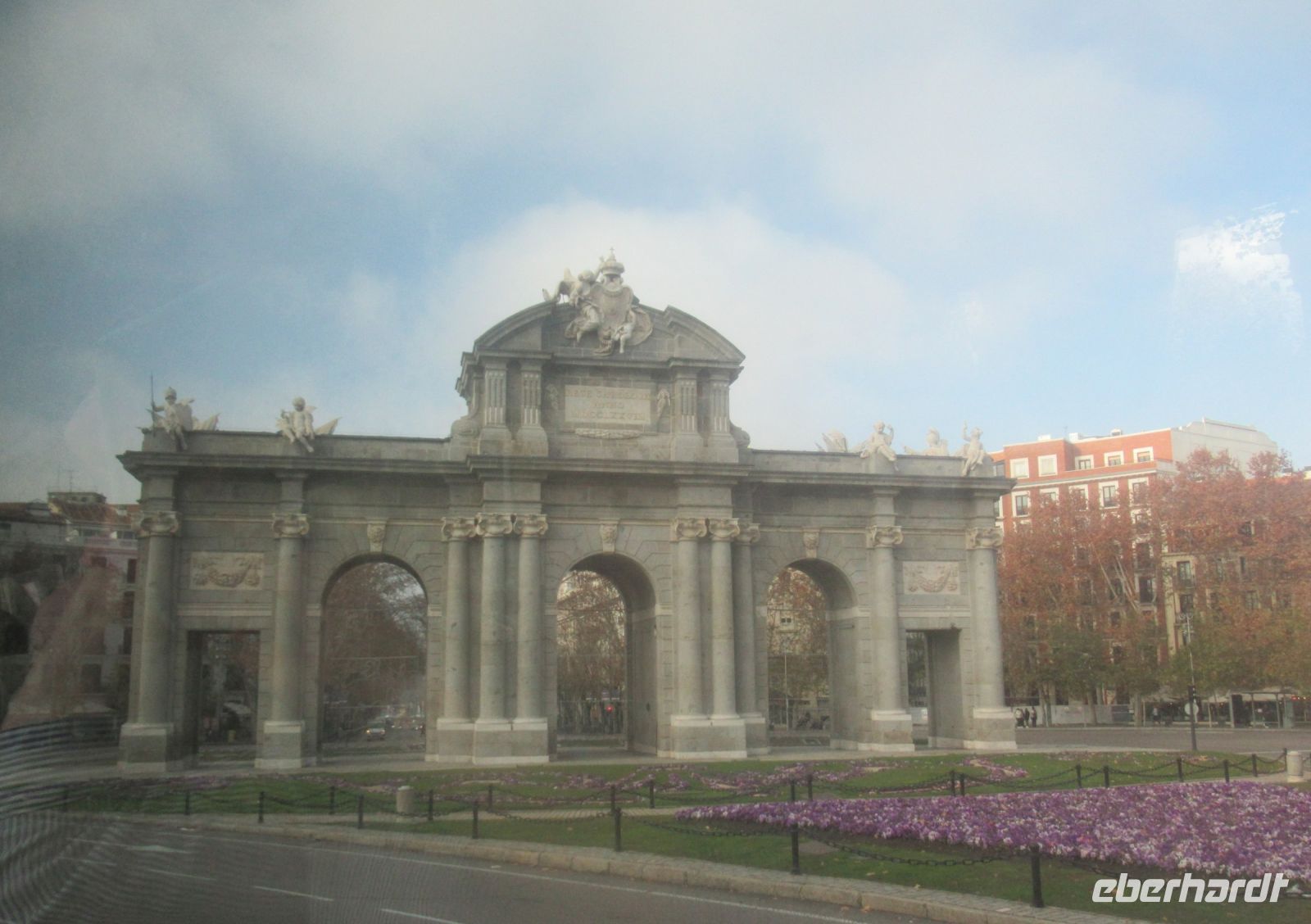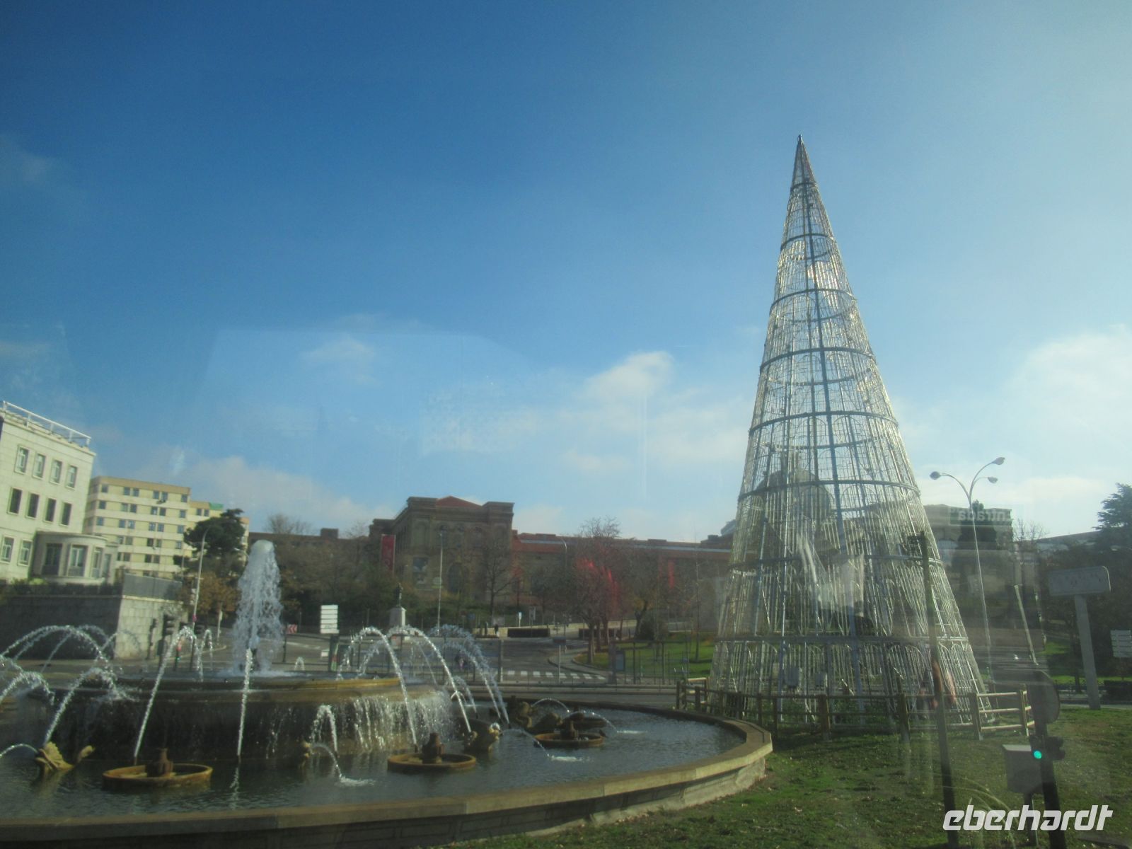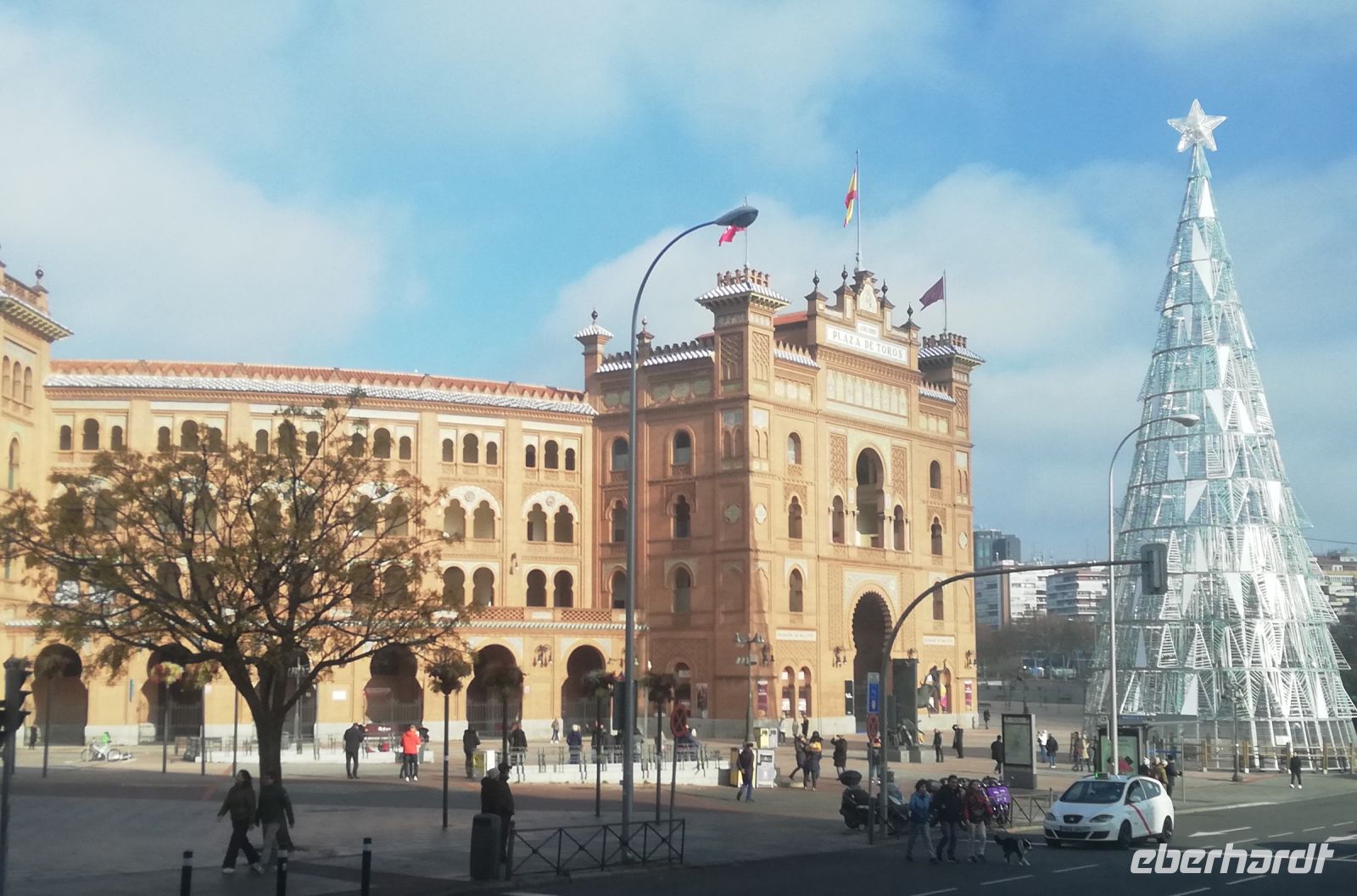 Jetzt tagsüber fahren wir an schon bekannten Punkten von Madrid, an Cibeles Brunnen und Prado Puerto de Alcala vorbei, Richtung Stierkampfarena – „Live Las Ventas“. Thomas erzählt uns über Entwicklung der Stadt und die Bebauung der Außenbezirke, der vorher auf die heutige Innenstadt begrenzte Stadt Madrid. Unterschiedliche Baustile zeichnen die vielfältige Stadt und deren Entwicklungsepochen. Wir landen bei der Stierkampfarena am Las Ventas. Die Sonne scheint und der erste Tag des Jahres begrüßt uns mit blauem Himmel. Auf hier auf dem Platz Las Ventas steht ein vom Metall konstruierte Weihnachtsbaum, der sicher abends schön beleuchtet ist.