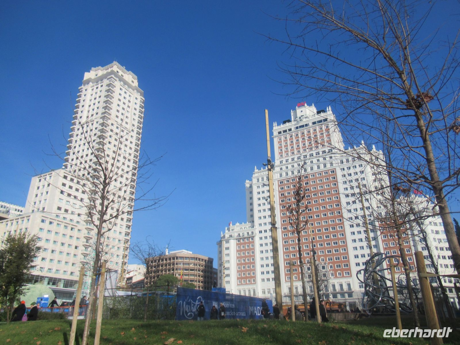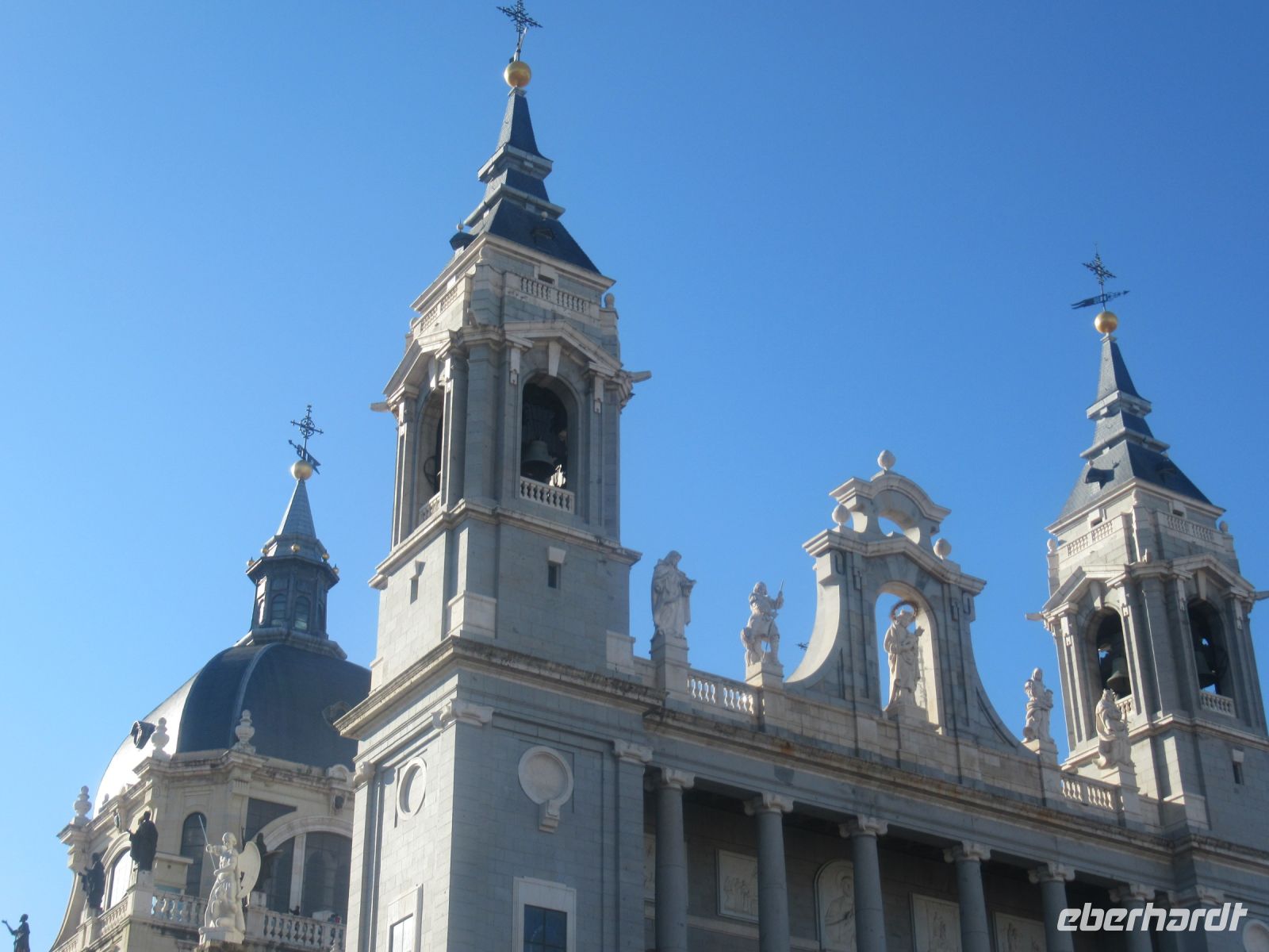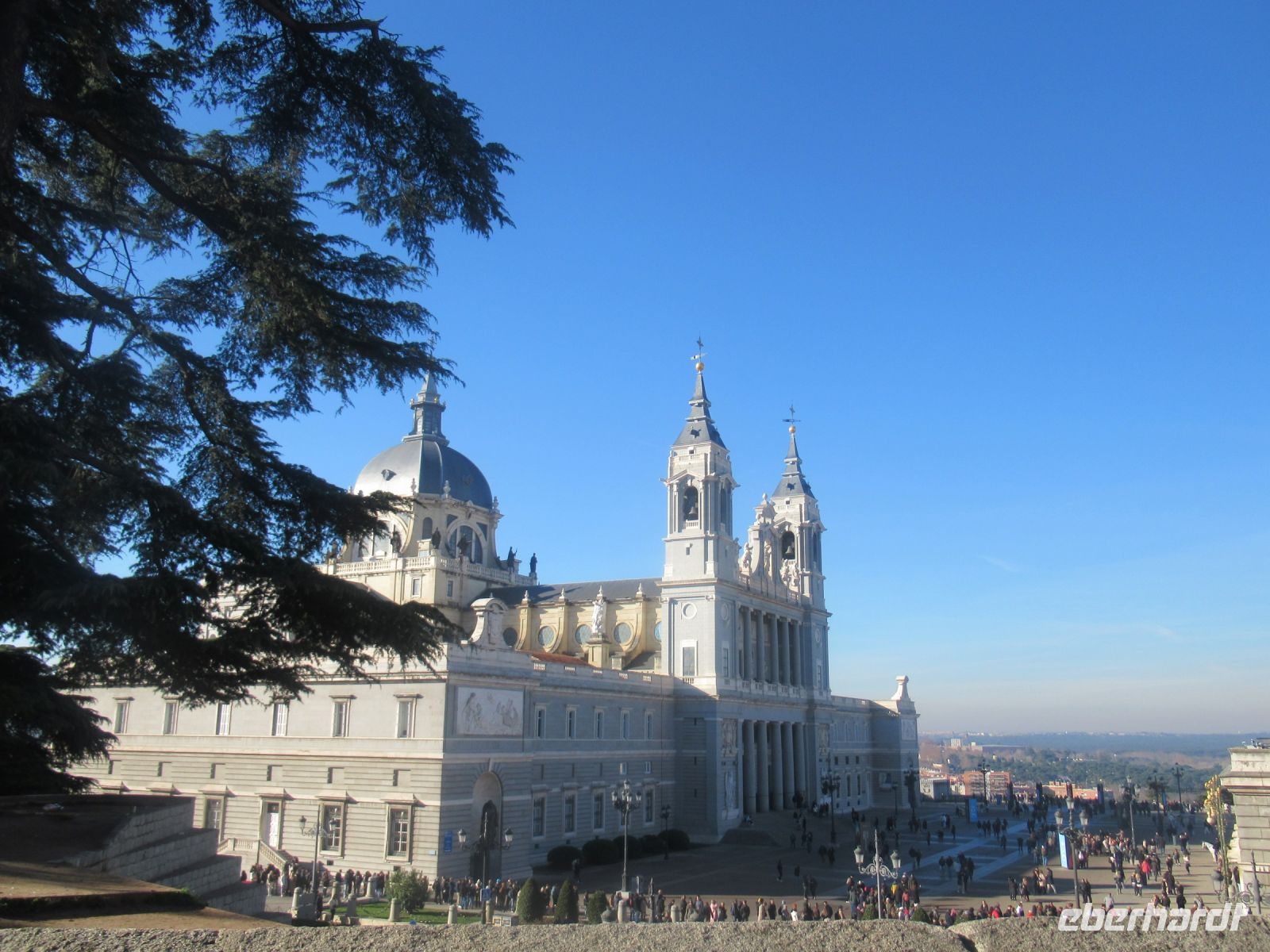 Die Geschichte des Baus: „Ende des 19. Jahrhunderts wurde begonnen, auf der alten Kirche Santa María la Mayor die Almudena-Kathedrale zu errichten, die der Schutzpatronin der Stadt Madrid geweiht ist. Im Jahre 1883 wurde der Grundstein für dieses eindrucksvolle Bauwerk gelegt. Die Kathedrale wurde nach vielen Jahren dann endlich im Jahre 1993 vom Papst Johannes Paul II. geweiht. Im Inneren der Kirche wird ein gotischer Stil bewahrt, auch wenn sie von außen klassizistisch ist.“ In der Almudena Kathedrale heirateten im Mai 2004 der Kronprinz Felipe von Spanien und Letizia Ortiz. Das war die erste königliche Hochzeit in der Kathedrale. Wir bewundern noch die außergewöhnliche Bronzetür und laufen noch mal am Palacio vorbei Richtung Plaza de España.