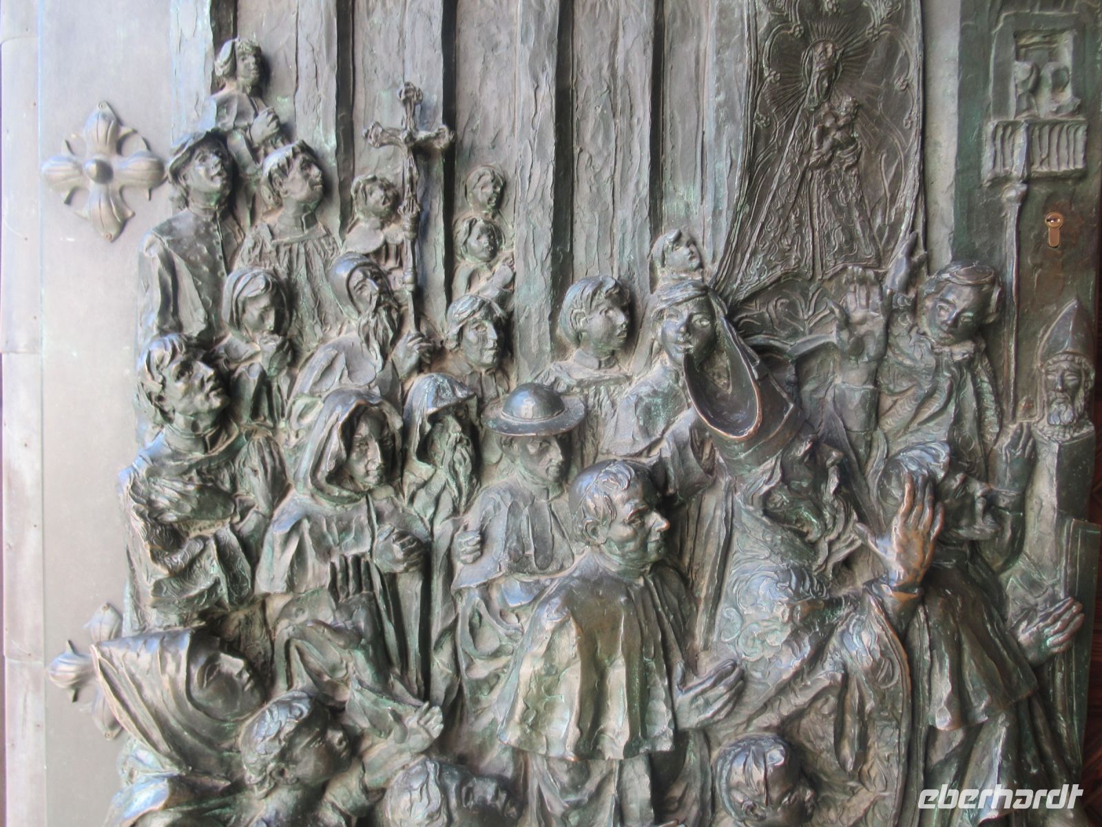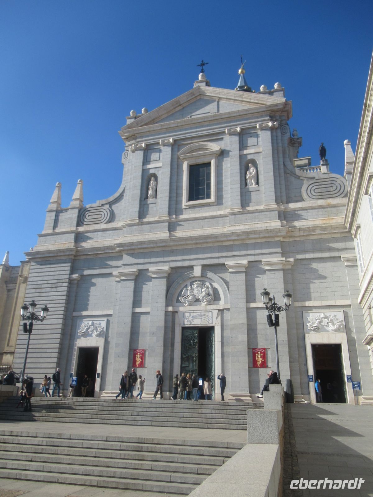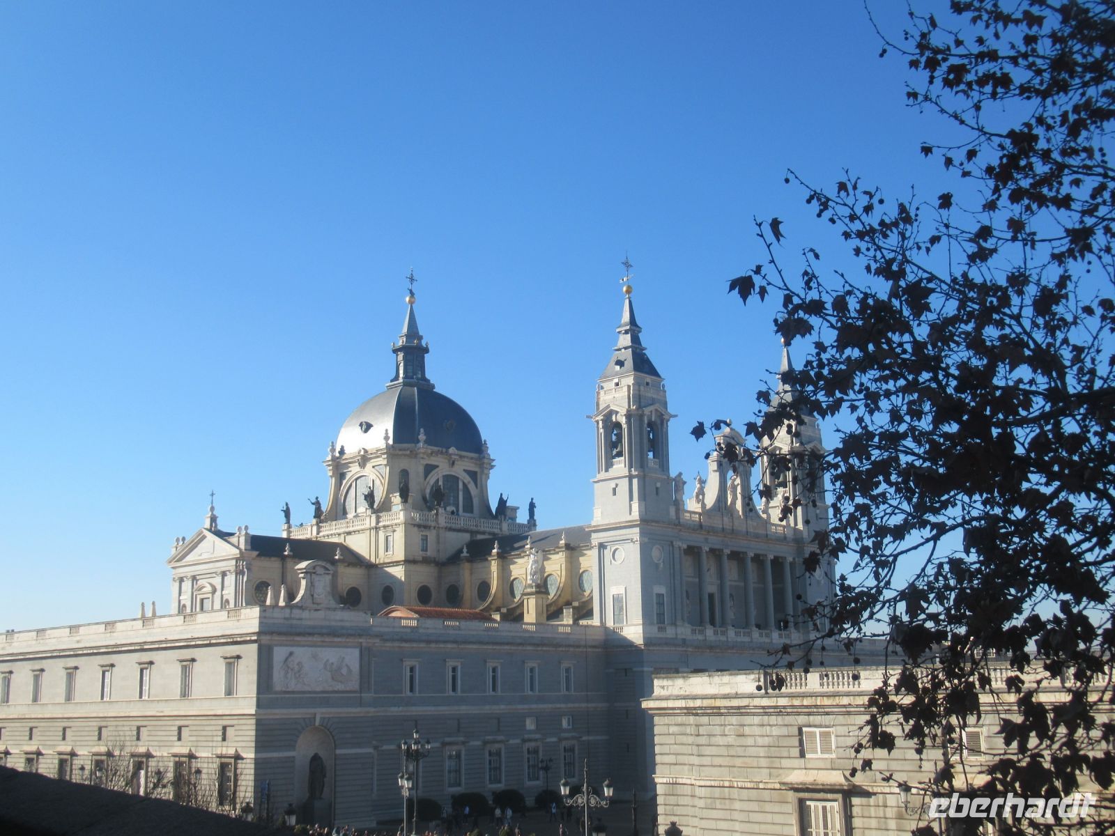 Die Geschichte des Baus: „Ende des 19. Jahrhunderts wurde begonnen, auf der alten Kirche Santa María la Mayor die Almudena-Kathedrale zu errichten, die der Schutzpatronin der Stadt Madrid geweiht ist. Im Jahre 1883 wurde der Grundstein für dieses eindrucksvolle Bauwerk gelegt. Die Kathedrale wurde nach vielen Jahren dann endlich im Jahre 1993 vom Papst Johannes Paul II. geweiht. Im Inneren der Kirche wird ein gotischer Stil bewahrt, auch wenn sie von außen klassizistisch ist.“ In der Almudena Kathedrale heirateten im Mai 2004 der Kronprinz Felipe von Spanien und Letizia Ortiz. Das war die erste königliche Hochzeit in der Kathedrale. Wir bewundern noch die außergewöhnliche Bronzetür und laufen noch mal am Palacio vorbei Richtung Plaza de España.