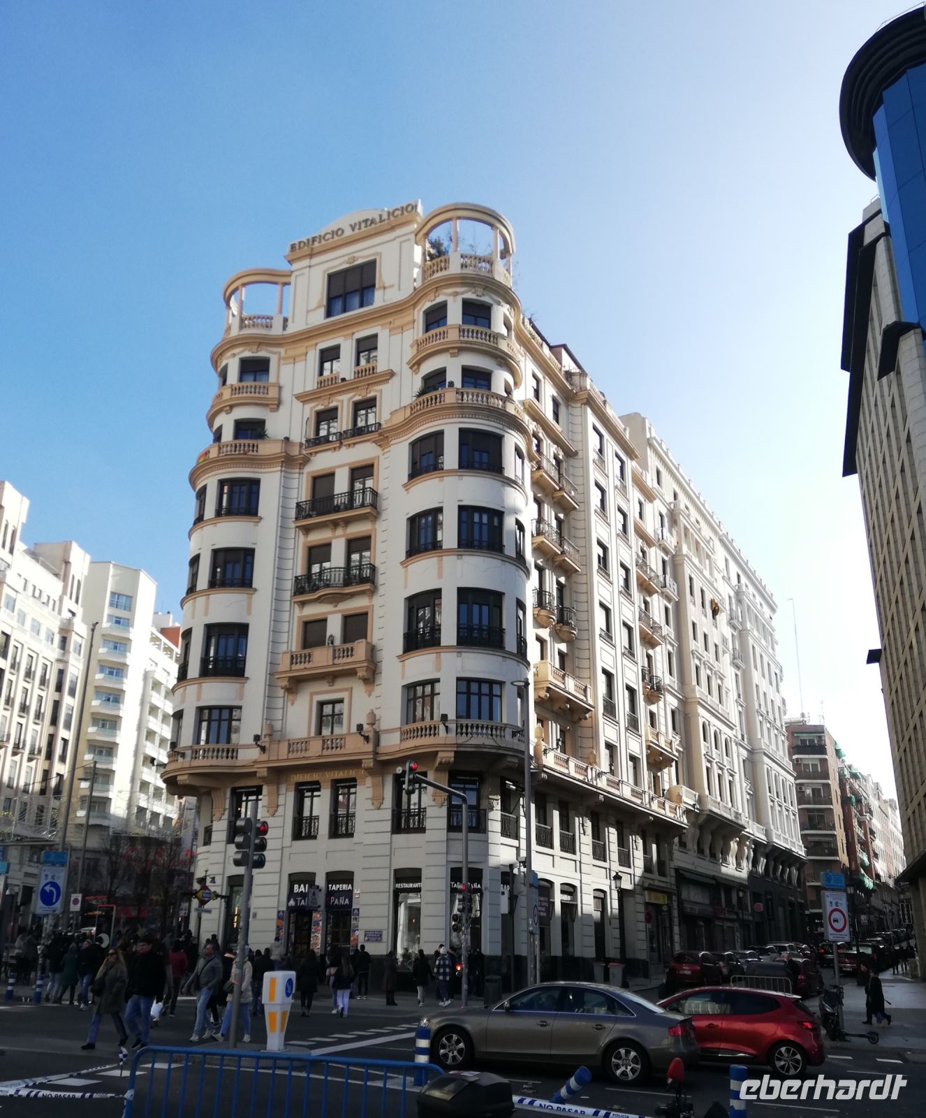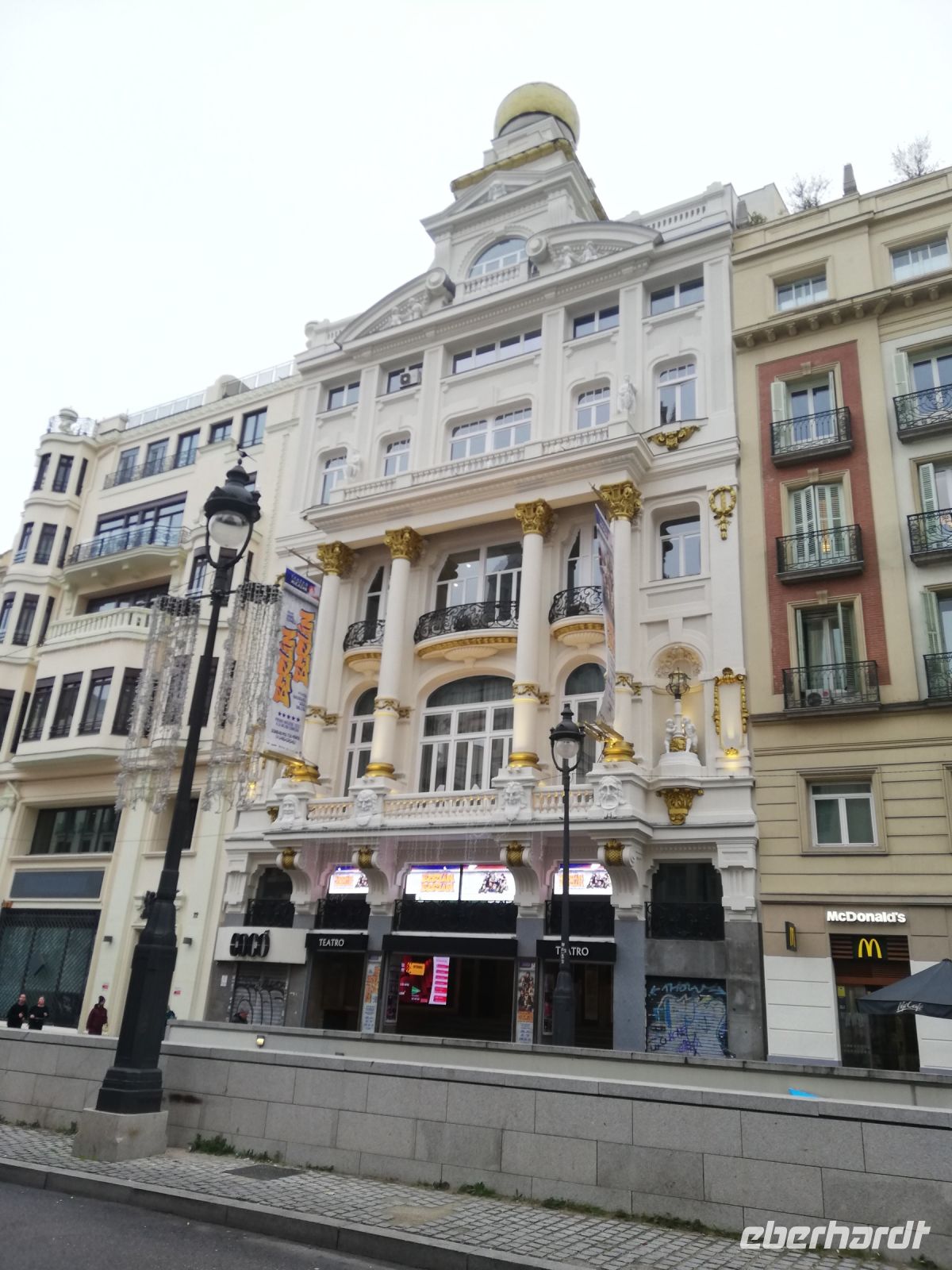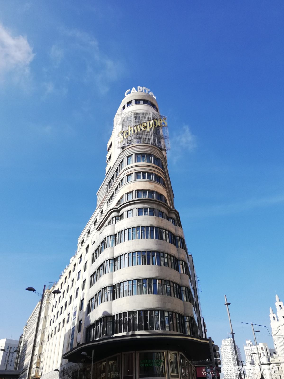 Hier wurde in der Winterzeit eine Eisfläche aufgebaut und ein „Bayrischer Biergarten“, auch mit Glühwein… Plaza de España umranden moderne Gebäude, vor allem auch das berühmte Riu Hotel mit der Sky Bar in der 26. Etage. Leider waren die Karten schon Tage vorher für diese Tage ausverkauft. Jetzt laufen wir noch über den oberen Teil der Gran Via und Thomas erzählt uns über die Baustile und die markanten Gebäude der imposanten Prachtstraße Madrids. Hier bewundern wir das imposante „Capitol“ Gebäude mit Schweppes Werbung und gelangen über die Plaza de Callao wieder zu unserem bekannten Puerto de Sol.