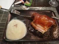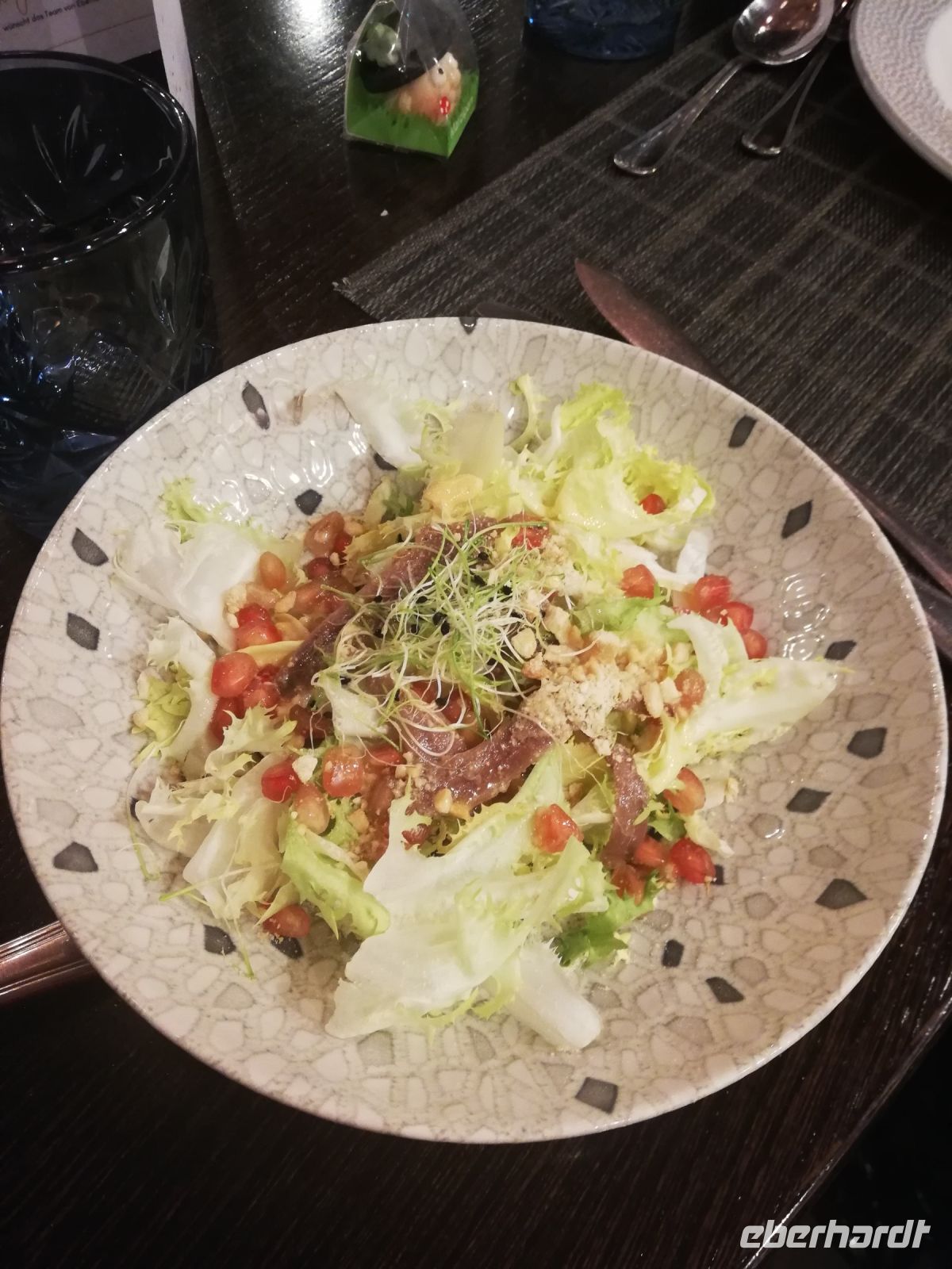 Wir erhalten eine Tafel und nach einer Abstimmung der Menüauswahl wird uns schon der Wein serviert und anschließend das 3-Gang-Menü. Wieder die schwere Entscheidung – Fisch oder Fleisch.