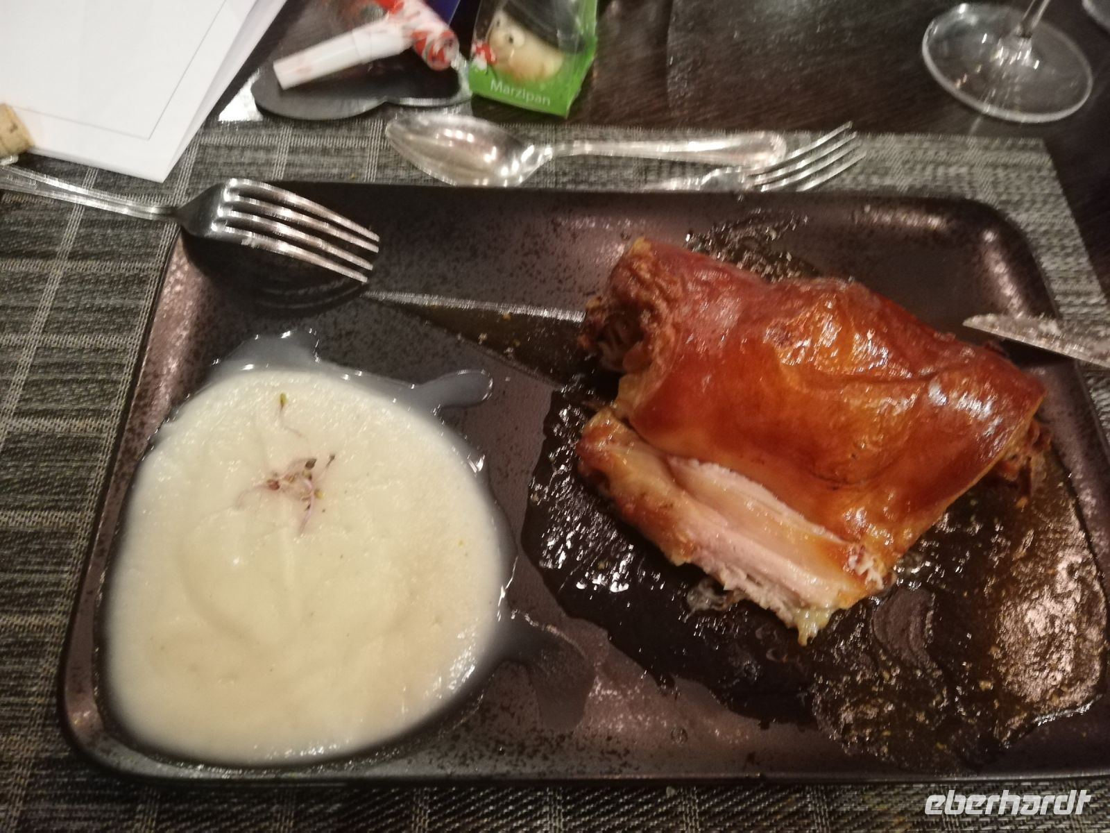 Dann begann unser 4-Gang Menü mit Austern und drei verschiedenen Tapas – Schinken aus Eichelmast, Manchego-Käse, Krabben-Omelette auf Krebscremesuppe, Salat garniert mit Granatäpfeln. Schwarzbauch Seeteufel und Spanferkelbraten gab es als Hauptspeisen, alles sehr lecker zubereitet, nur unser Magen war etwas zu klein…Als wir zu Dessert und diversen Digestif kamen, haben wir es gar nicht gemerkt, dass es bald Mitternacht ist. Ein wahres Lukullus-Fest. Inzwischen haben einige Gäste über Ihre lustigsten oder außergewöhnlichen Silvestererlebnisse erzählt.