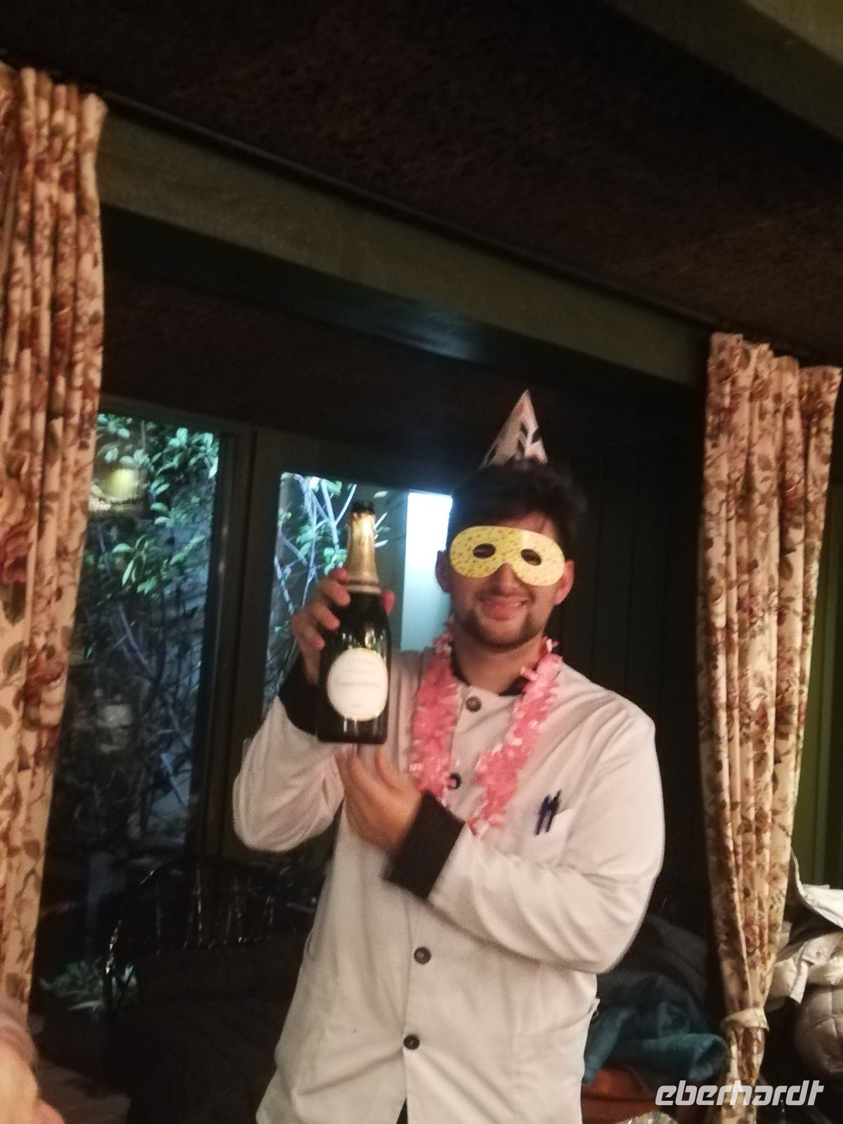 Es wird uns ein leckerer fruchtiger Cocktail zum Empfang serviert. Auf jeden Stuhl lag ein geheimes silbernes Paket – Überraschung – gefüllt mit Party Utensilien – von Trillerpfeifen, Augenmaske, Hütchen, Luftschlangen sorgte gleich für eine ausgelassene Laune unserer Gäste. Alle haben alles ausprobiert…?
